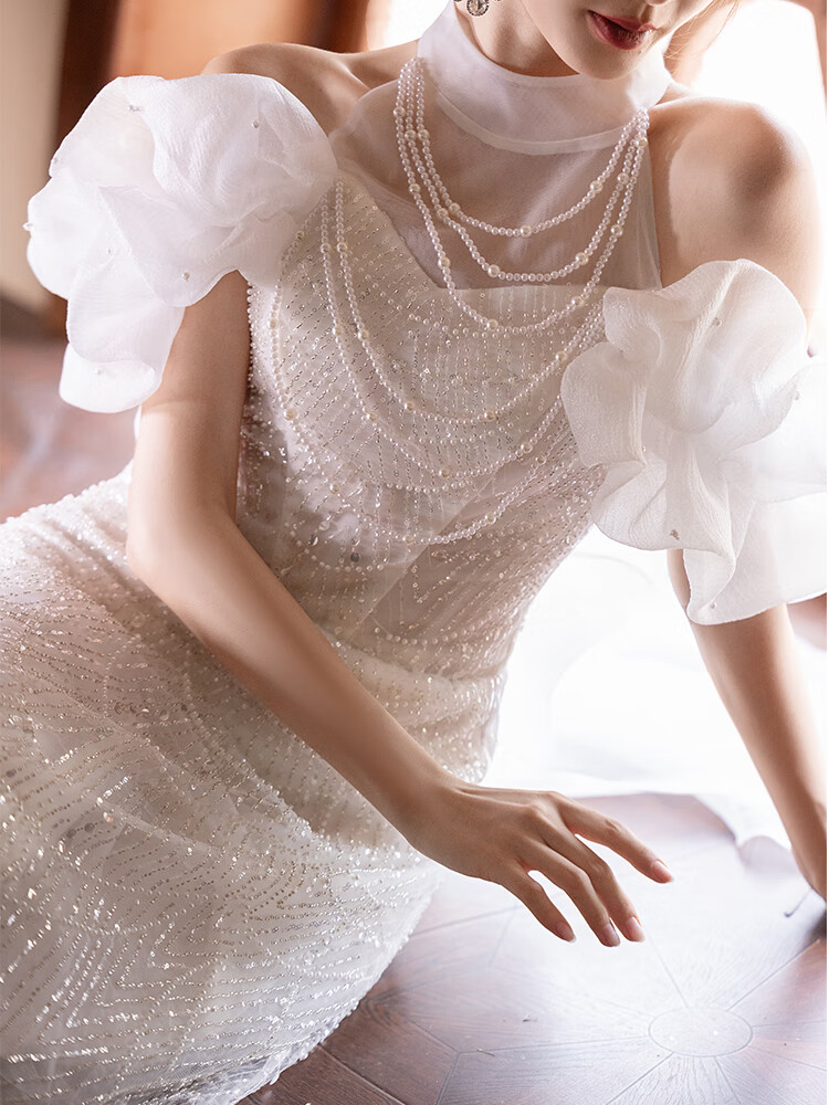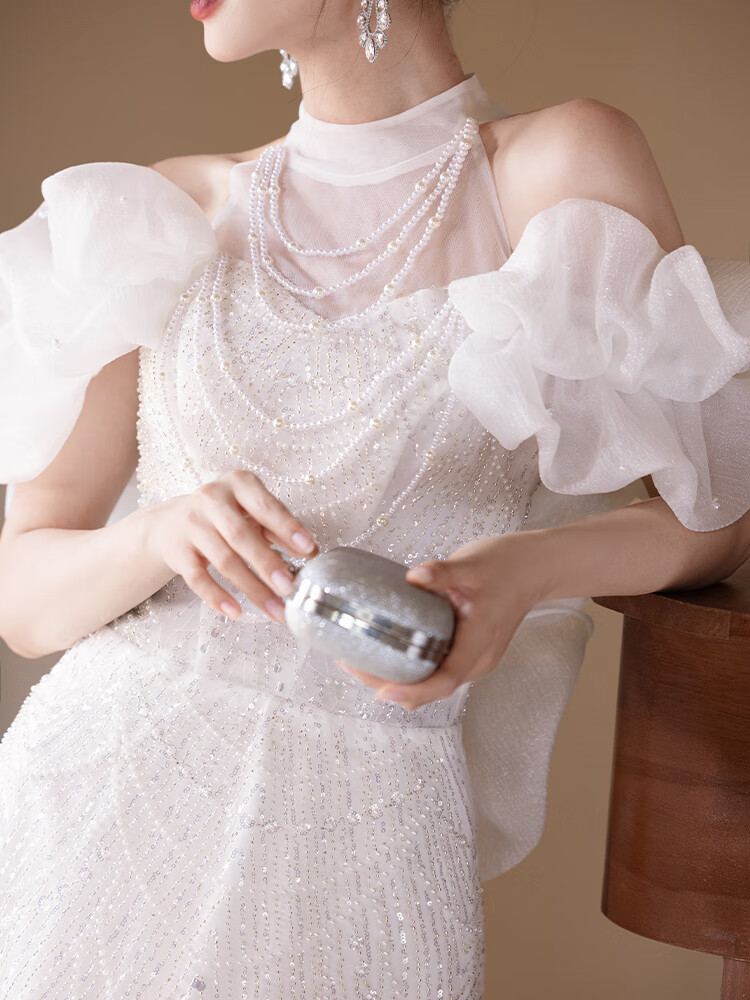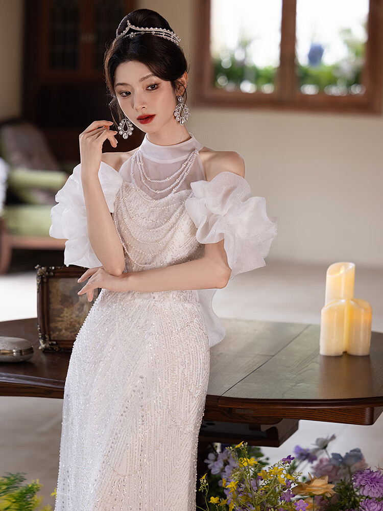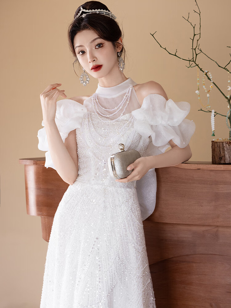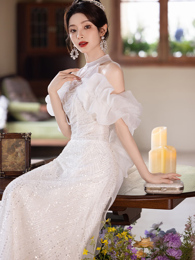 Wutuo white halterneck slim-fitting evening dress French bridal wedding toast clothing light luxury niche birthday party performance clothing with white ceremony (52412) L
