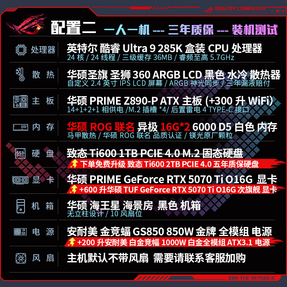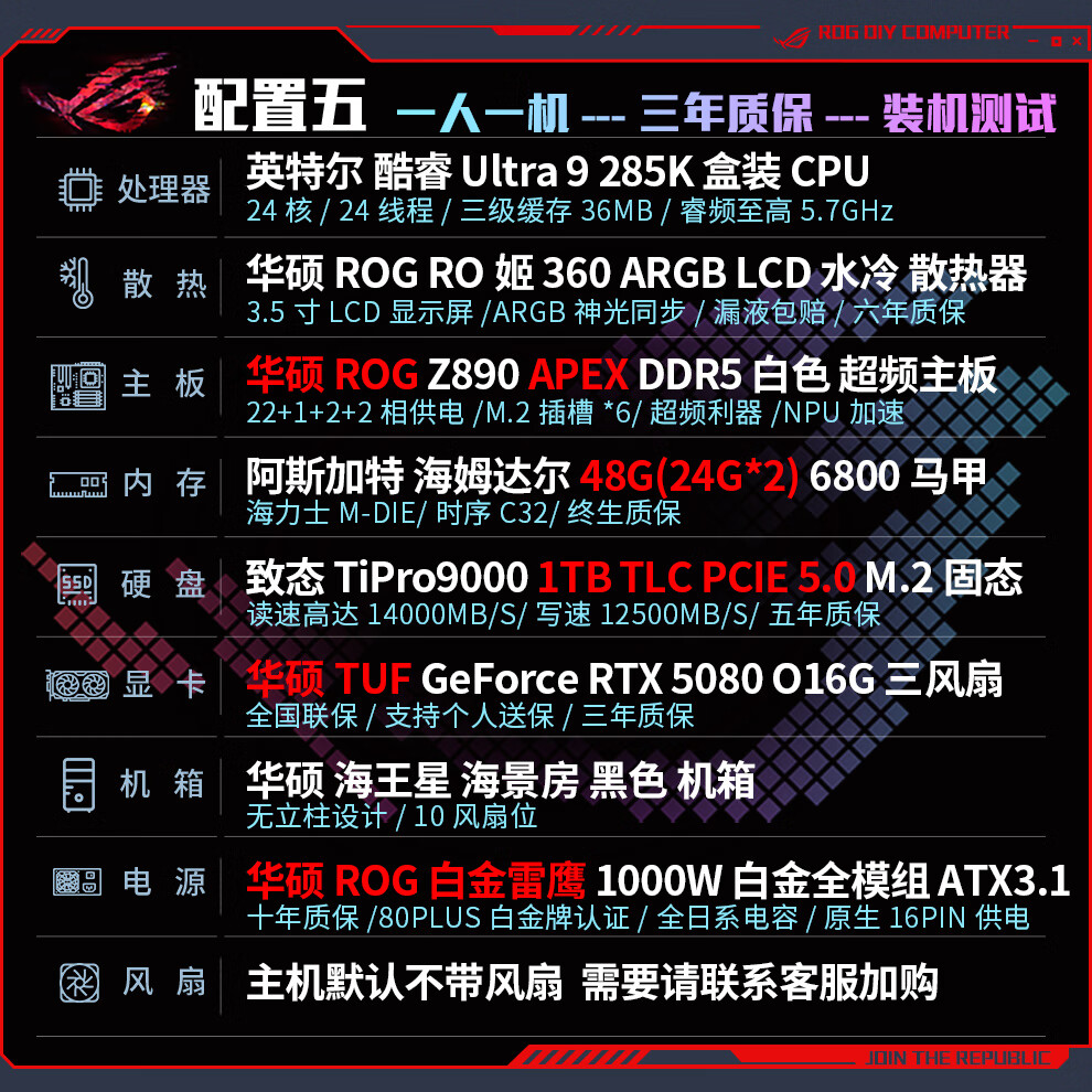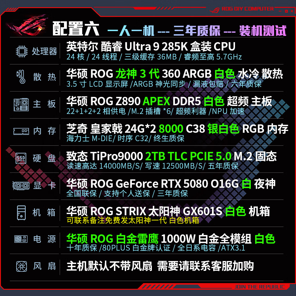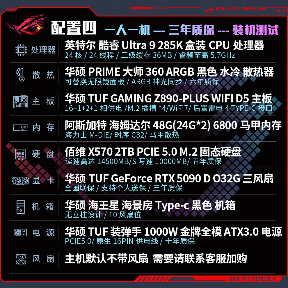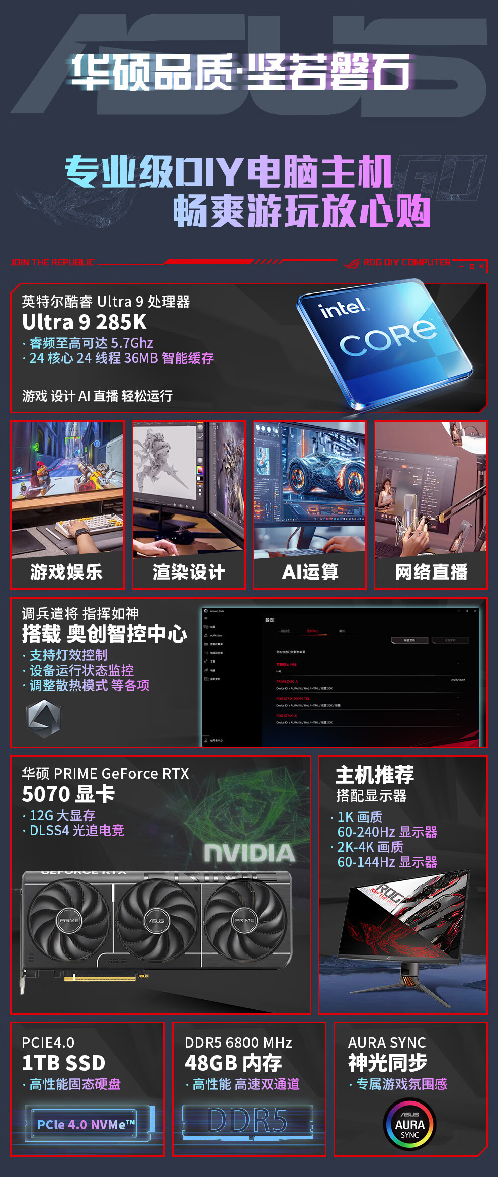 ASUS ROG family bucket 285K/RTX5080 RTX5070Ti computer host desktop assembly computer deep learning AI computing design rendering e-sports game console DIY complete machine with two 285K+RTX5070Ti