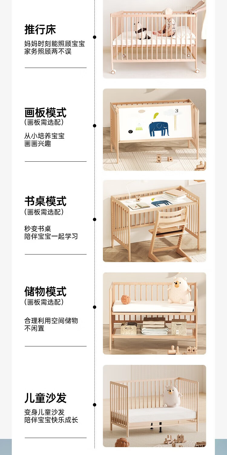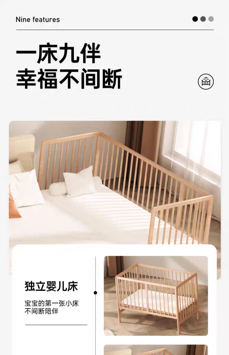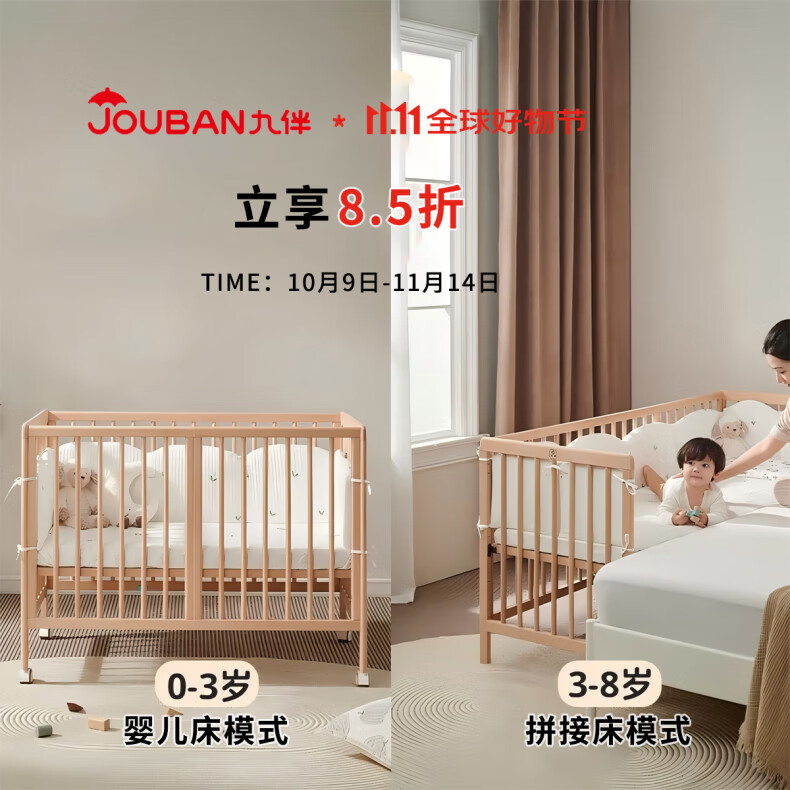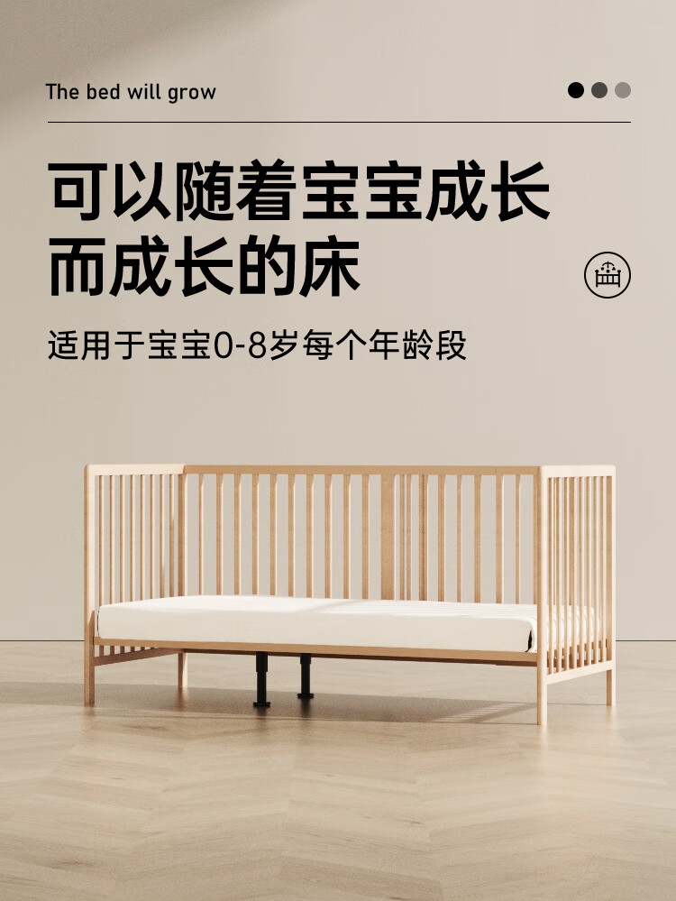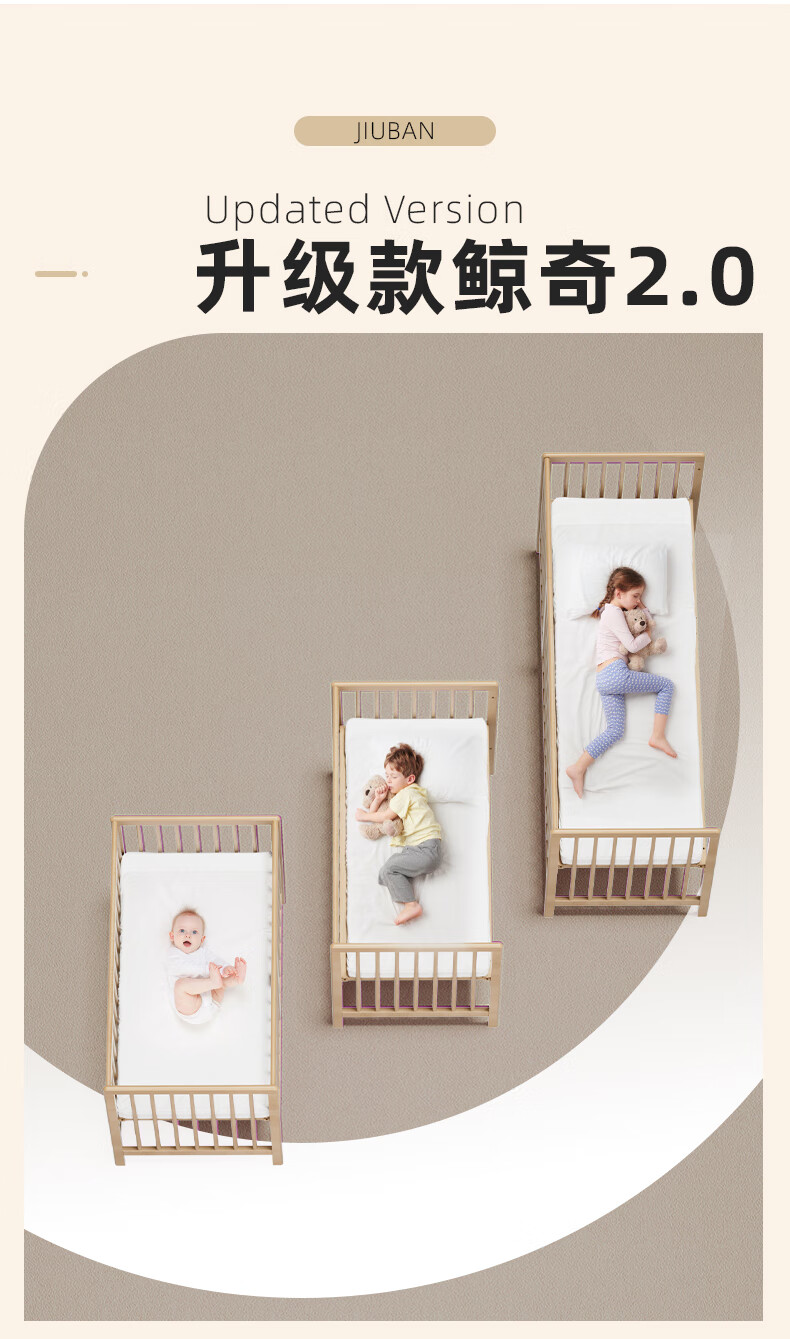 Jiuban Jingqi crib, beech spliced bed, lift bed, multi-functional bedside bed, baby newborn solid wood bed, removable Whale Qi 2.0 paintless model + coconut palm mattress + drawing board