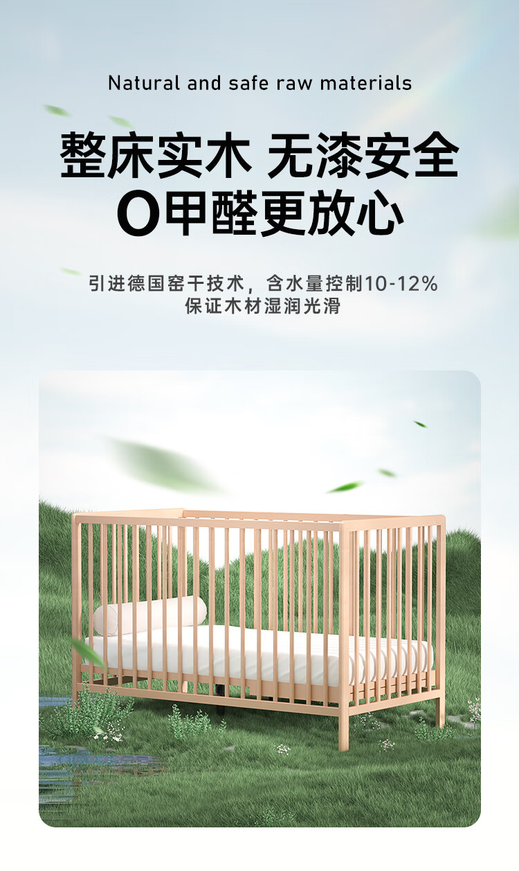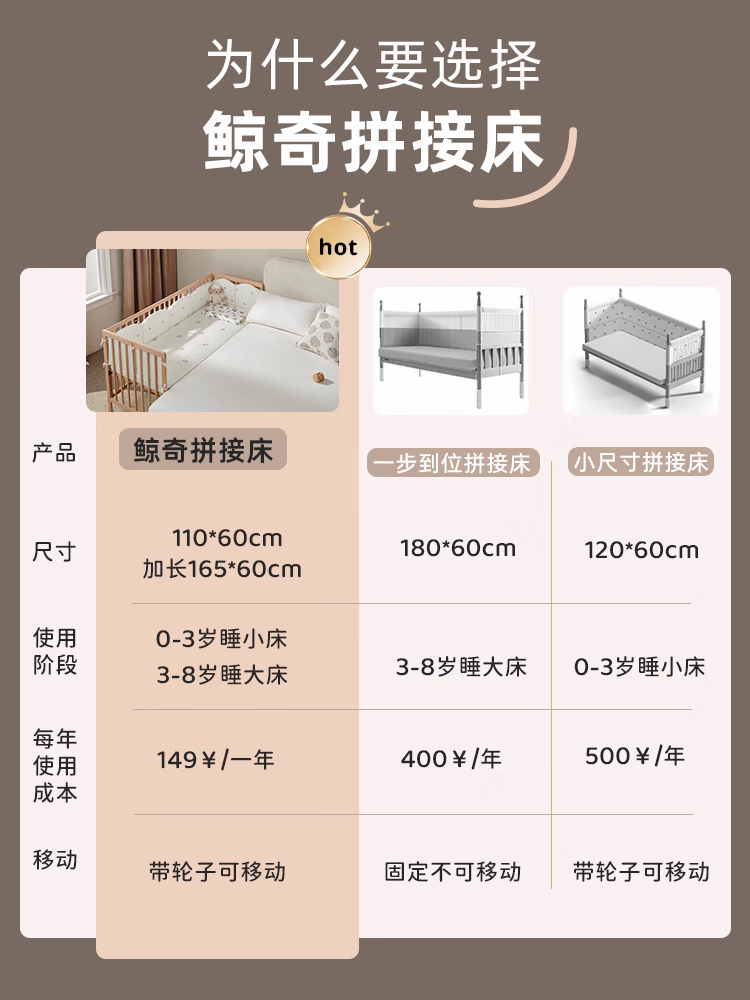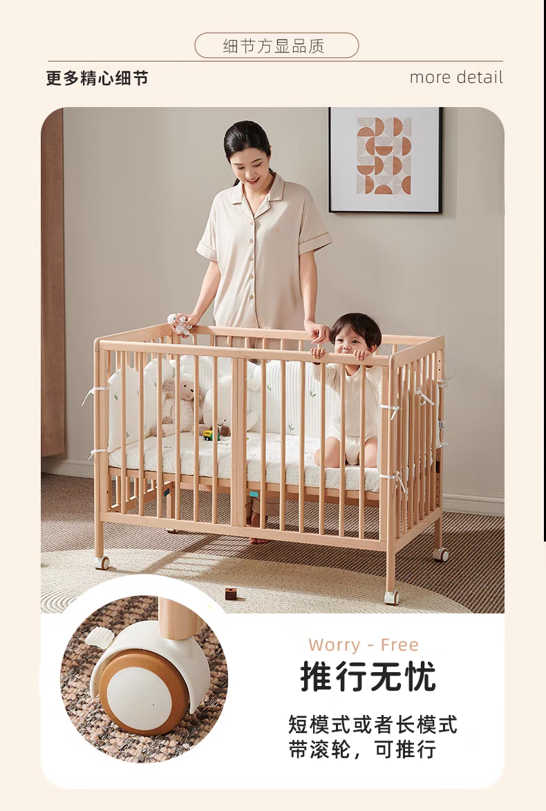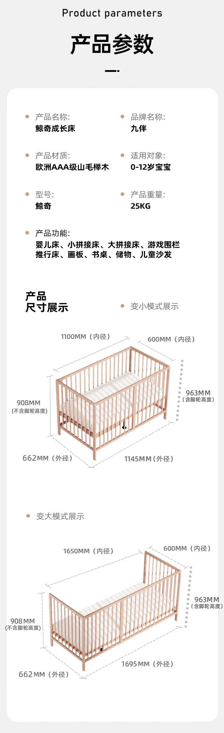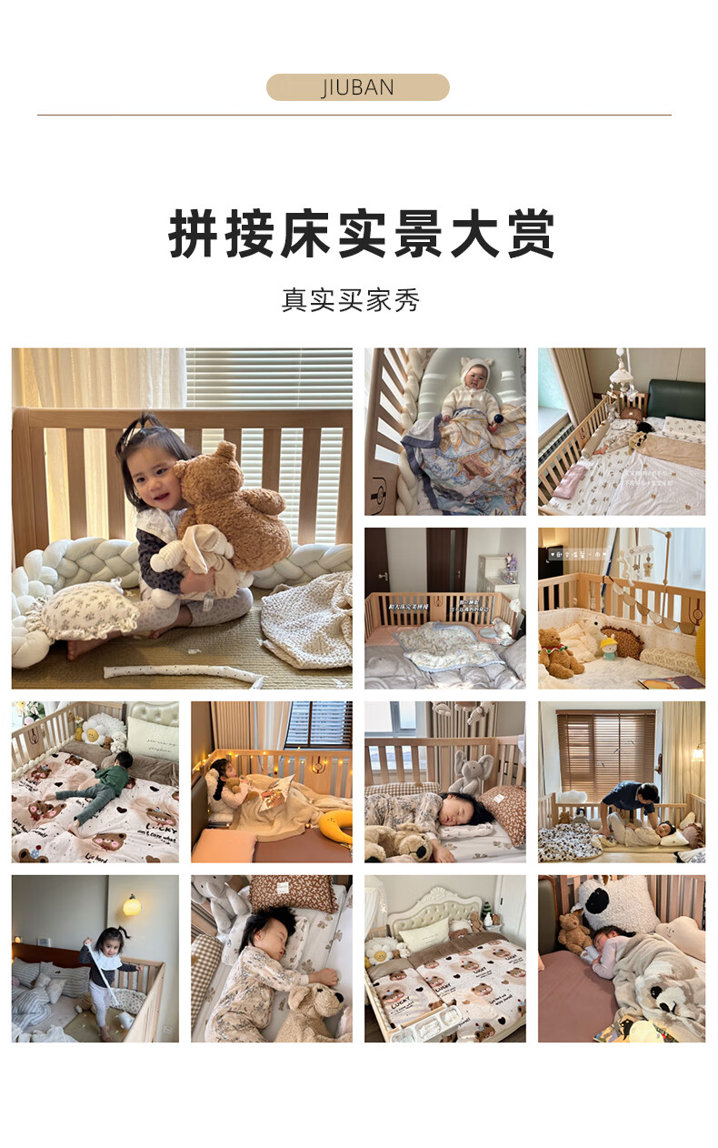 Jiuban Jingqi crib, beech spliced bed, lift bed, multi-functional bedside bed, baby newborn solid wood bed, removable Whale Qi 2.0 paintless model + coconut palm mattress + drawing board