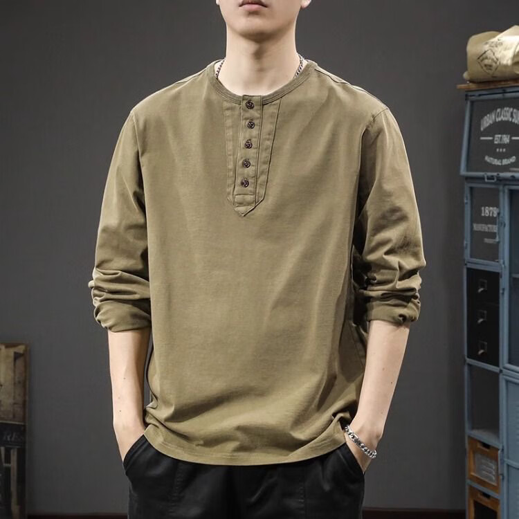 Zuosike 25 American heavyweight retro washed Henry collar long-sleeved T-shirt men's loose trendy brand autumn bottoming shirt sweatshirt trendy gray XL