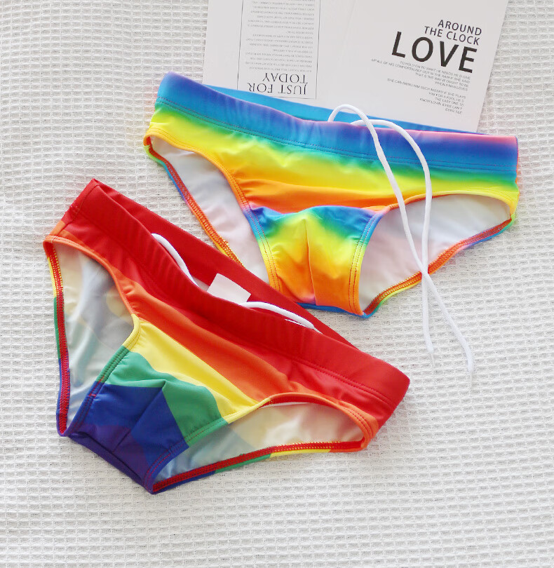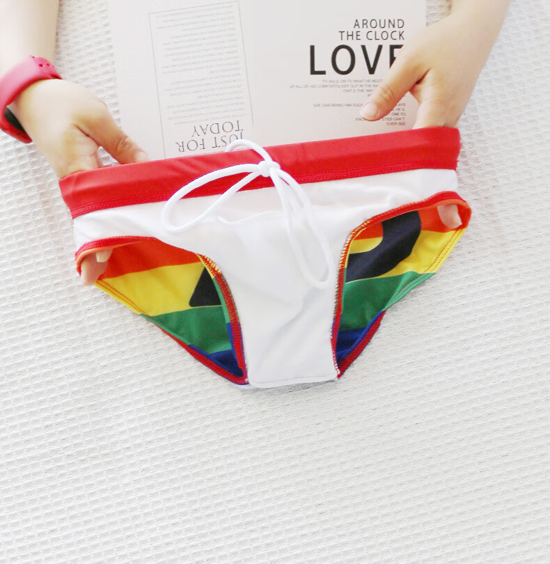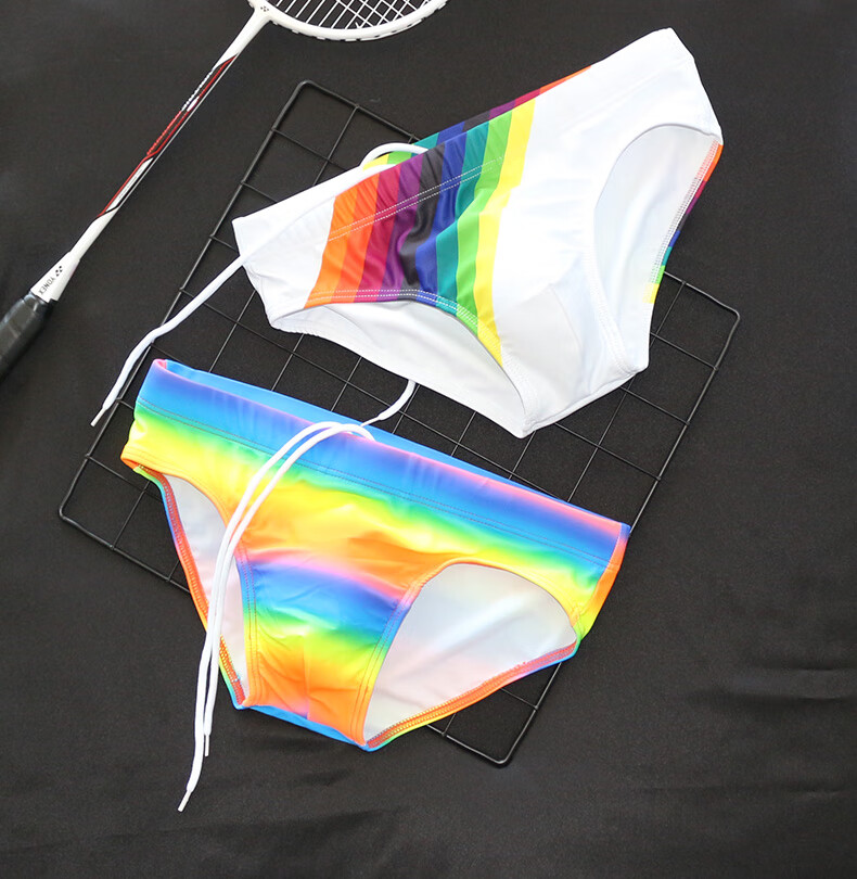 Manson Snow Lotus Summer Swimming Pants Rainbow Stripe Print Low Waist Men's Triangle Swimming Pants Cup Anti-Embarrassing Tie Beach Pants Men's Rainbow Orchid With Letters Free Cup XL