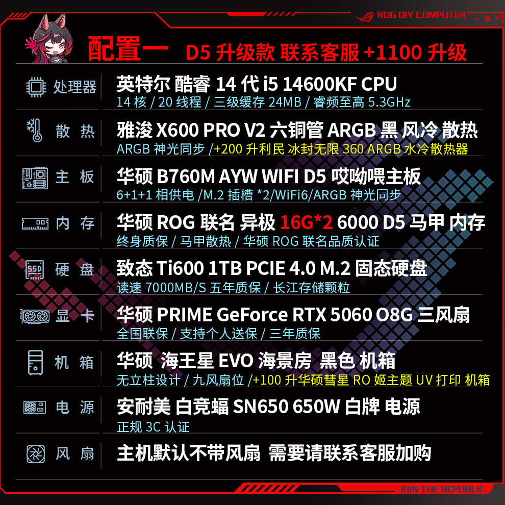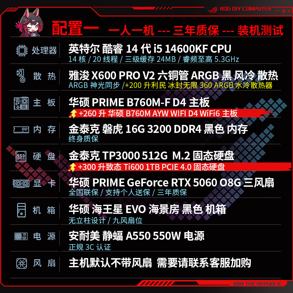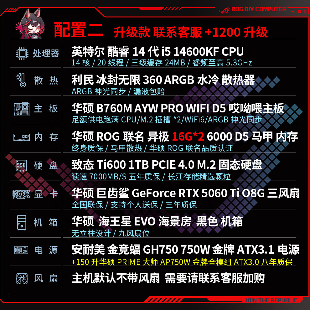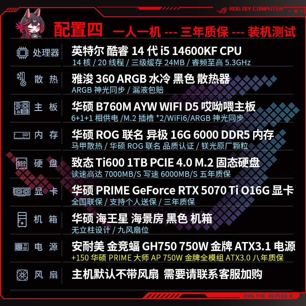 ASUS ROG family bucket 14600KF/RTX5060Ti RTX5070 computer host live broadcast e-sports Delta game design rendering desktop assembly complete machine DIY assembly machine with one 14600KF+RTX5060