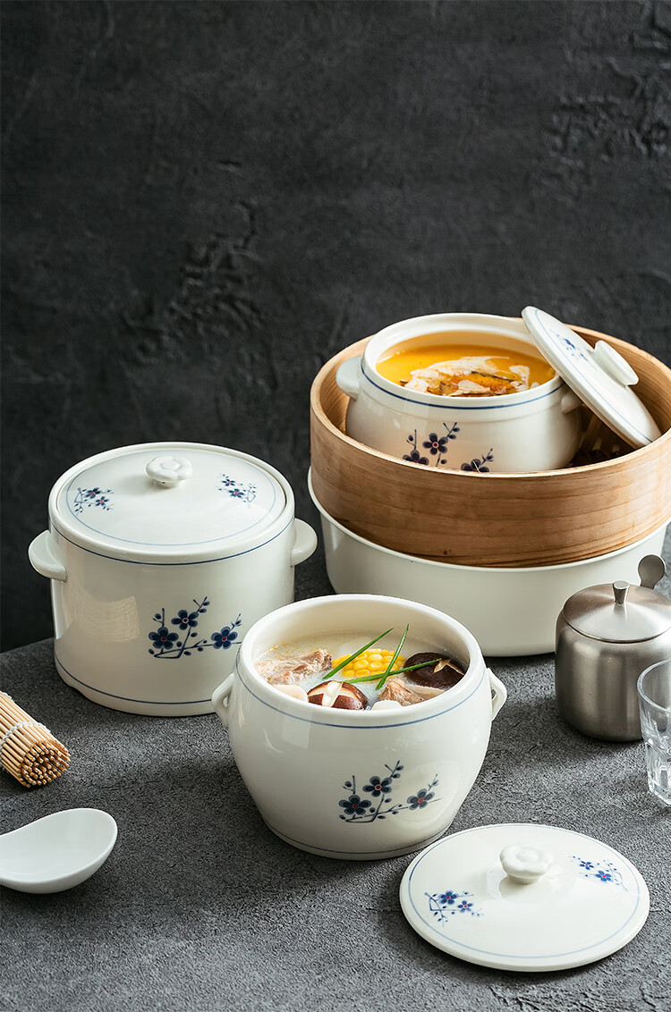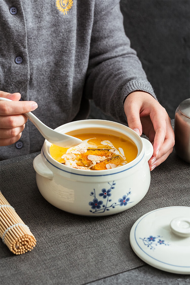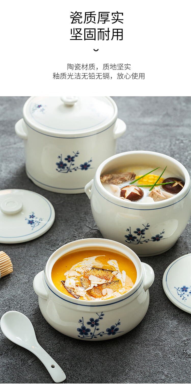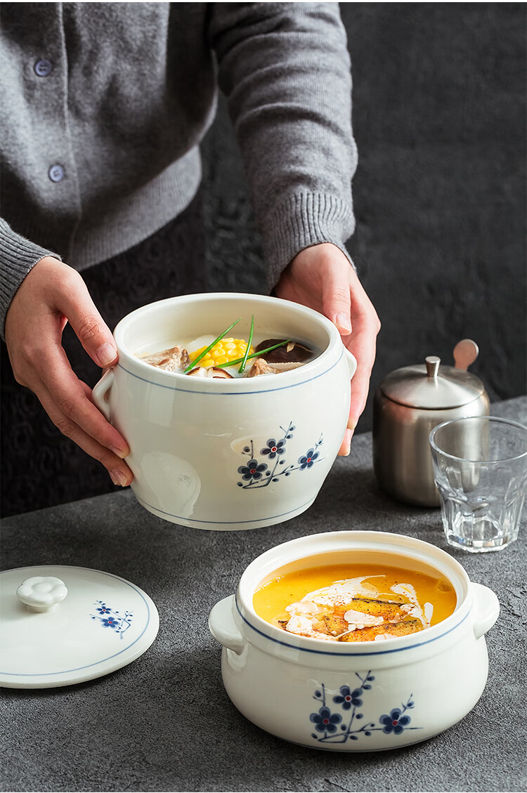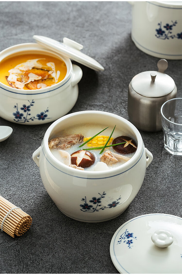 Household ceramic stew pot with lid, water-proof stew pot, crock pot, hotel restaurant special light luxury steaming pot soup bowl, plum blossom glaze medium flower paper 1 liter-Pangdundun