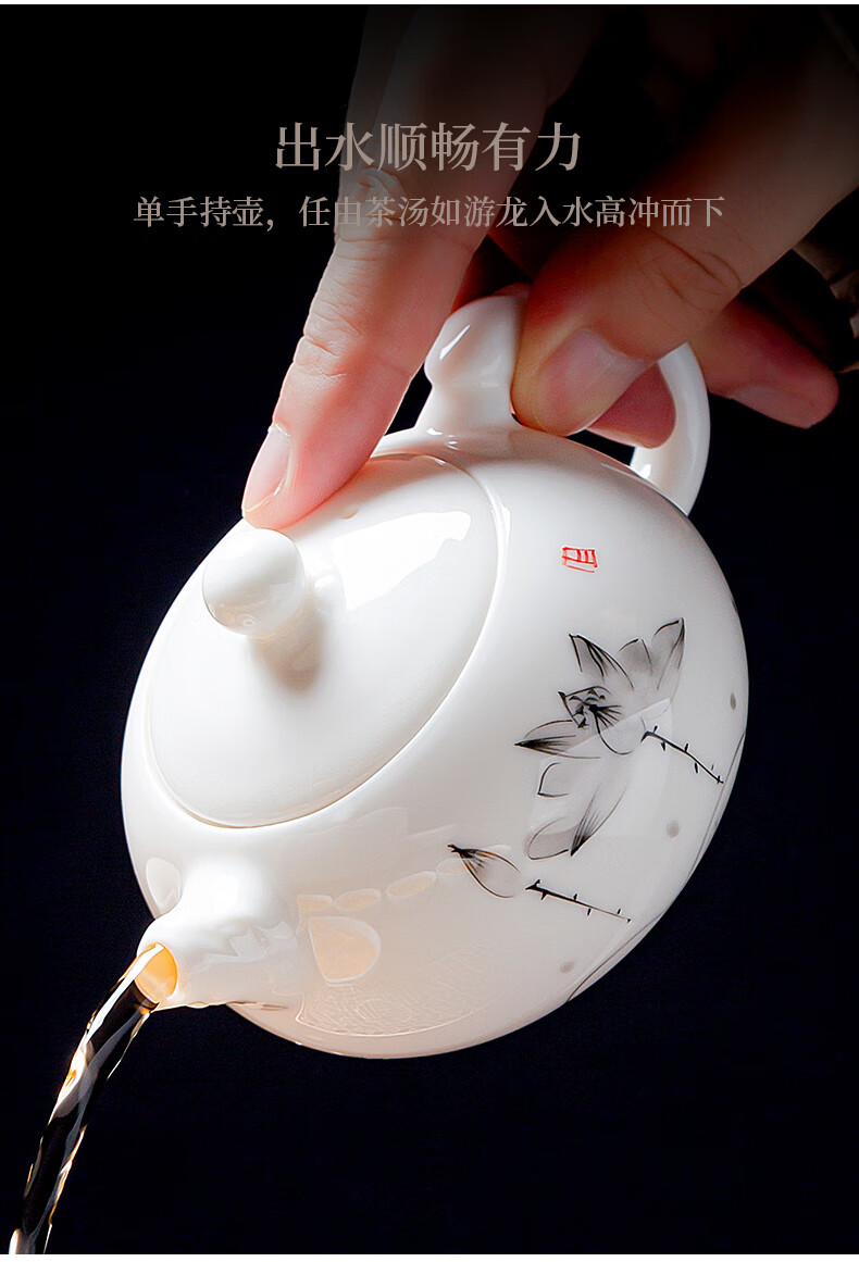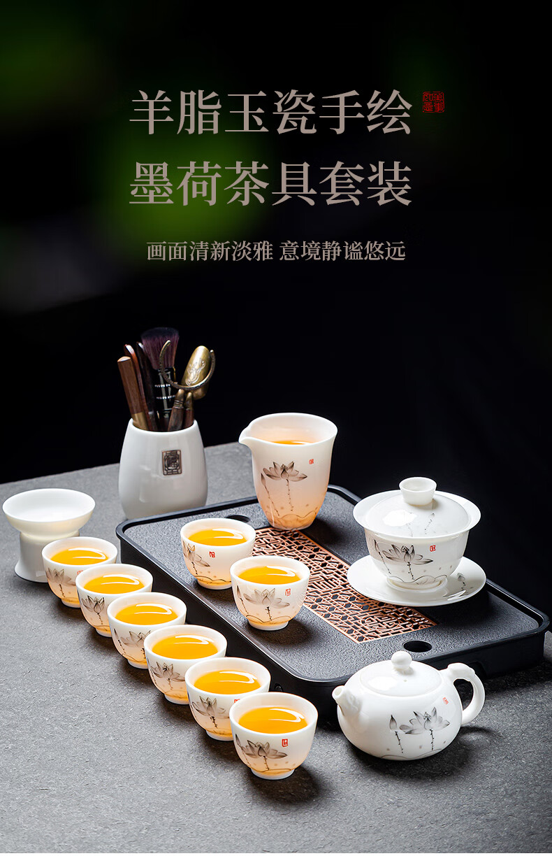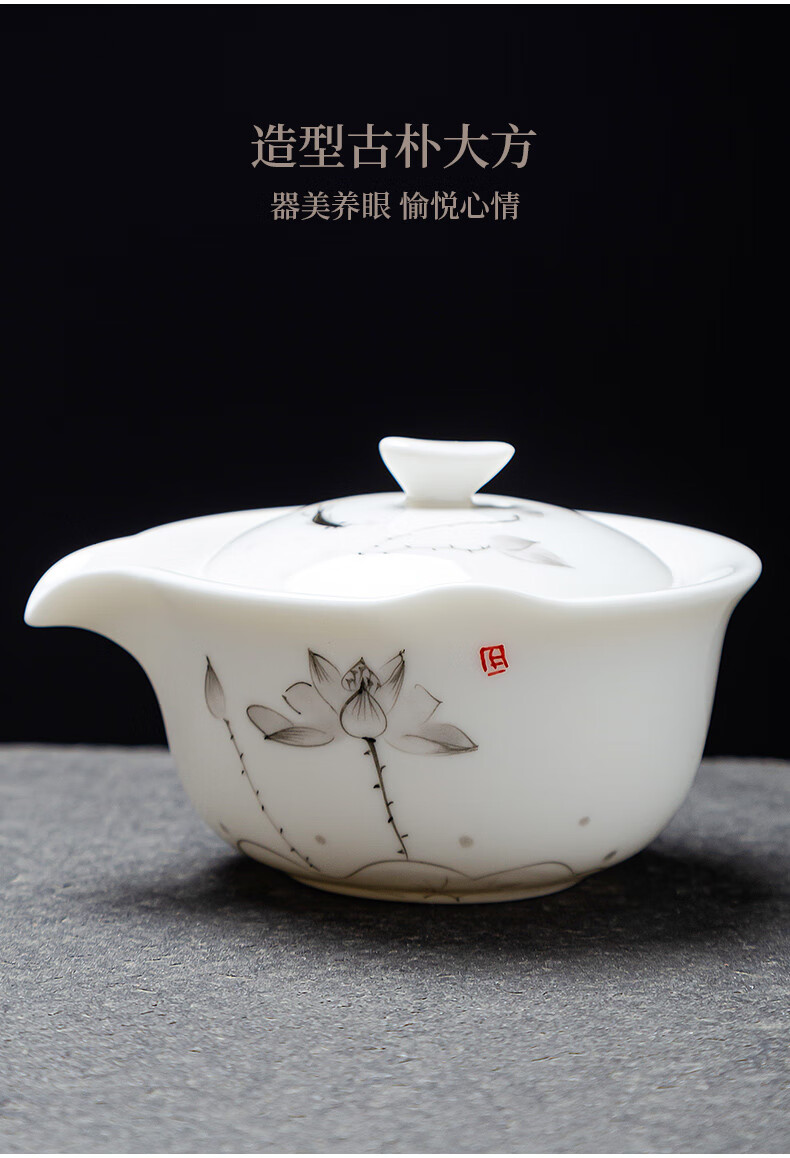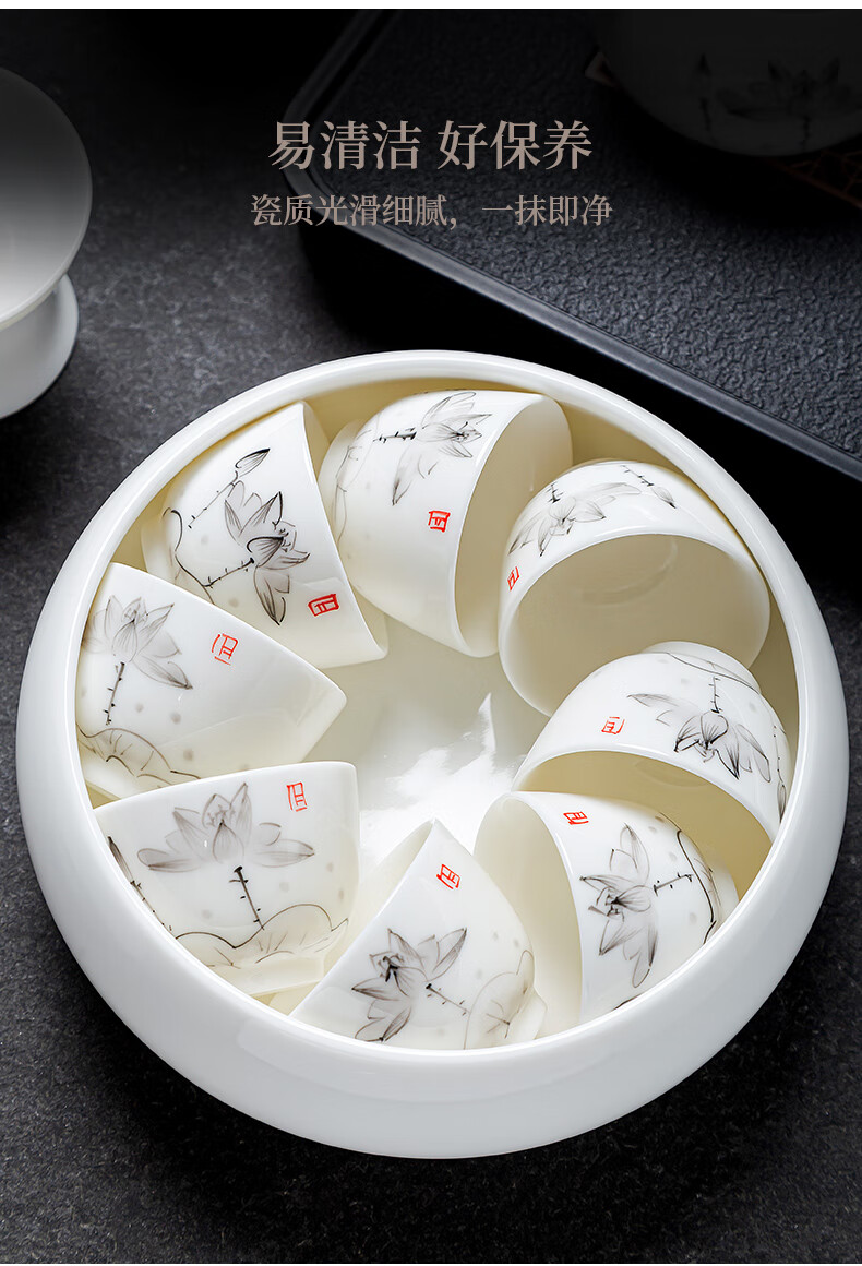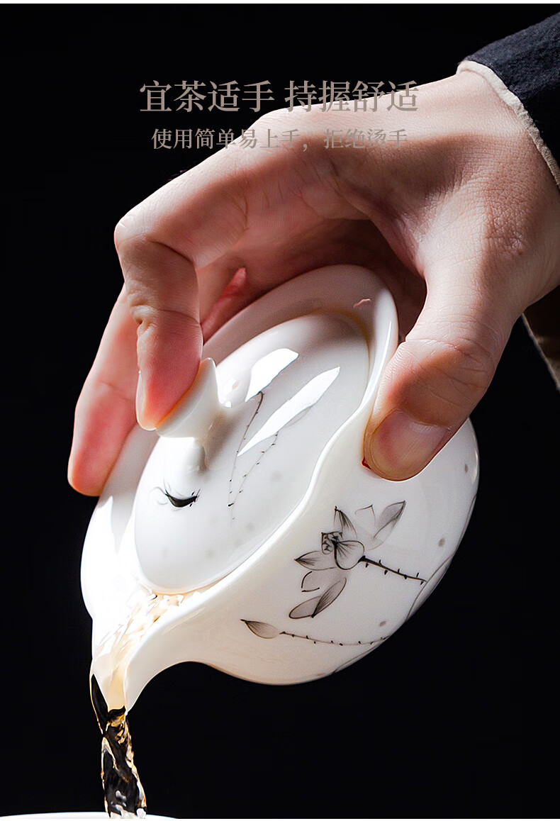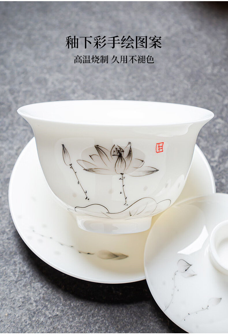 Jingcizhai hand-painted kung fu tea set household mutton-fat jade white porcelain covered bowl teapot tea cup light luxury high-end new style hand-painted ink lotus covered bowl Xishi teapot 12 heads