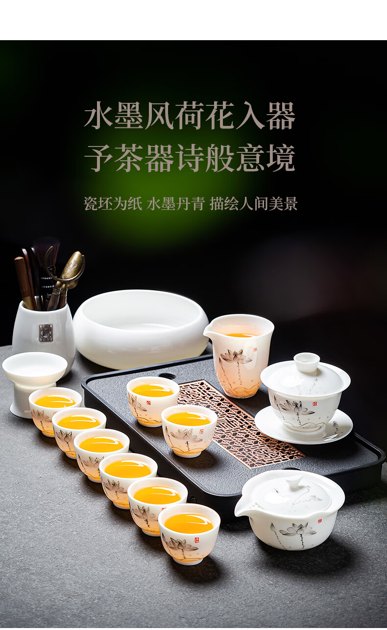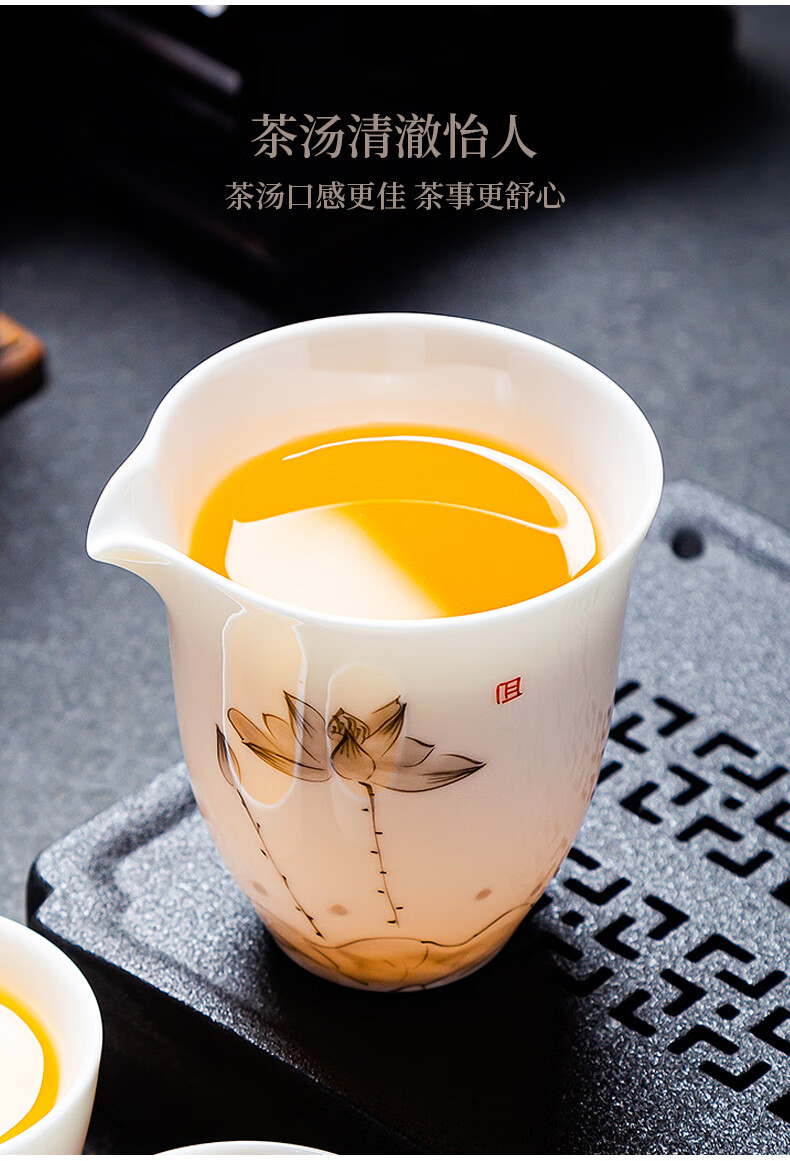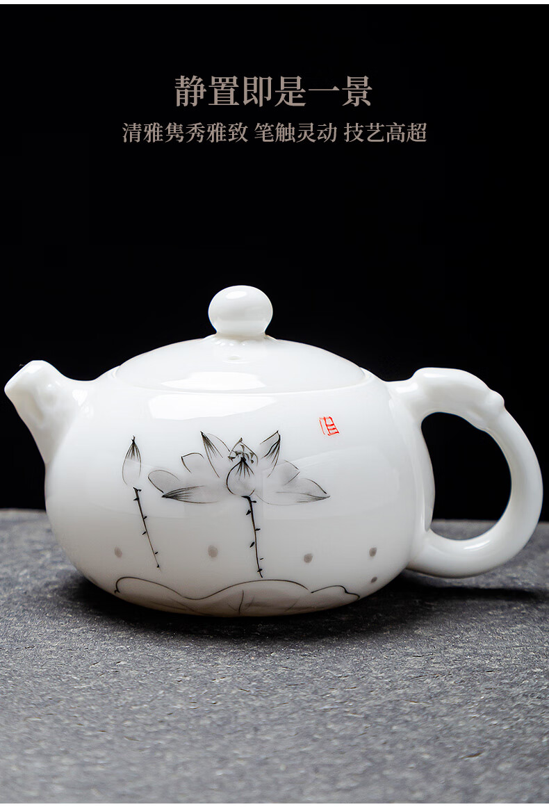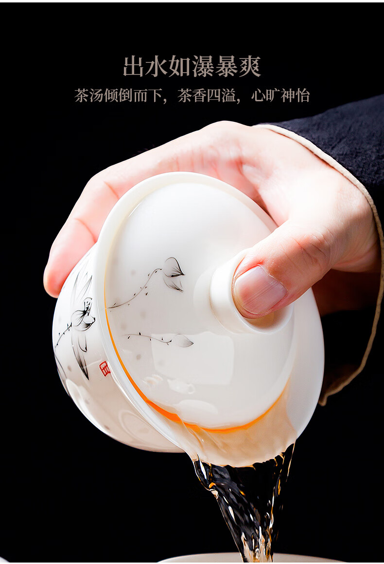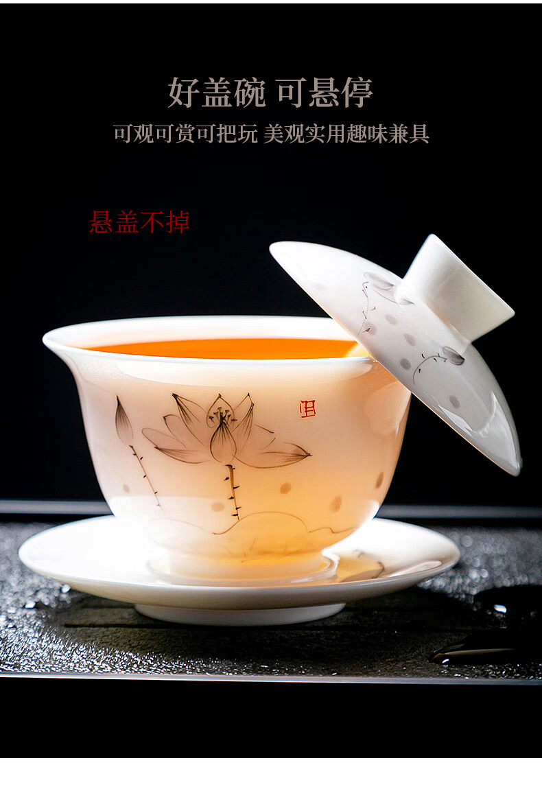Jingcizhai hand-painted kung fu tea set household mutton-fat jade white porcelain covered bowl teapot tea cup light luxury high-end new style hand-painted ink lotus covered bowl Xishi teapot 12 heads