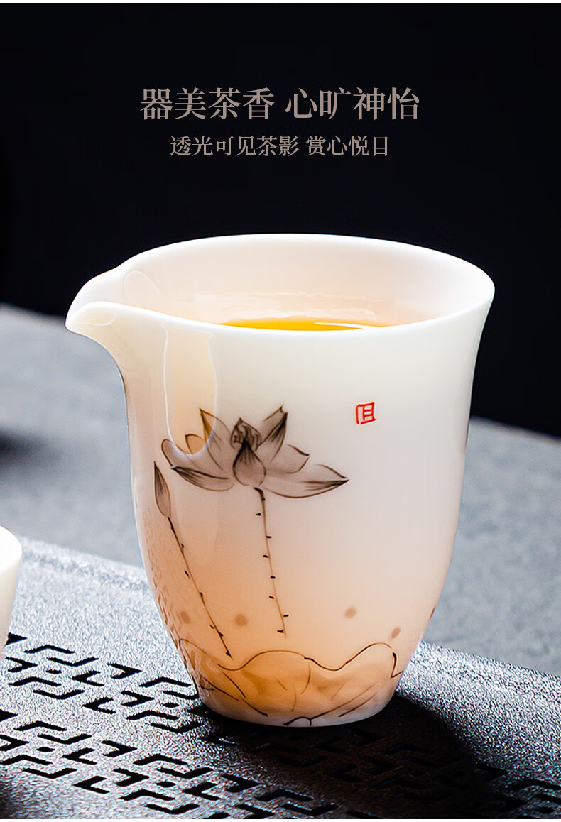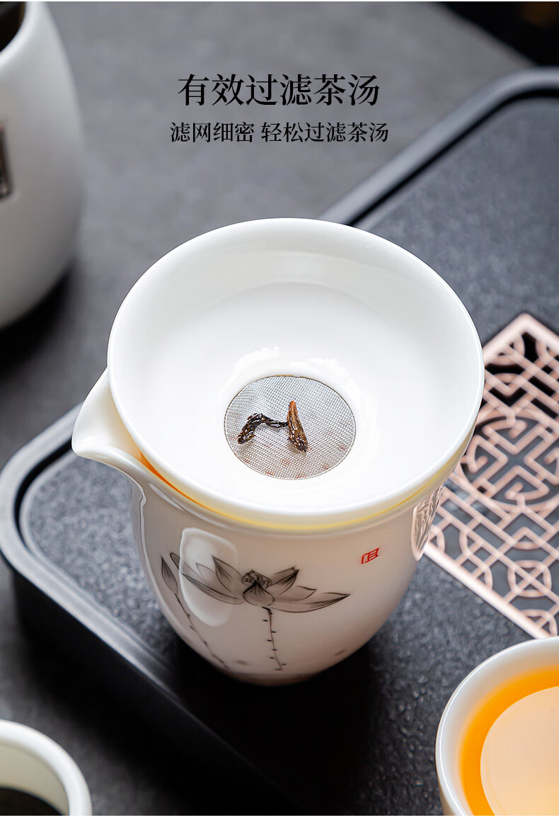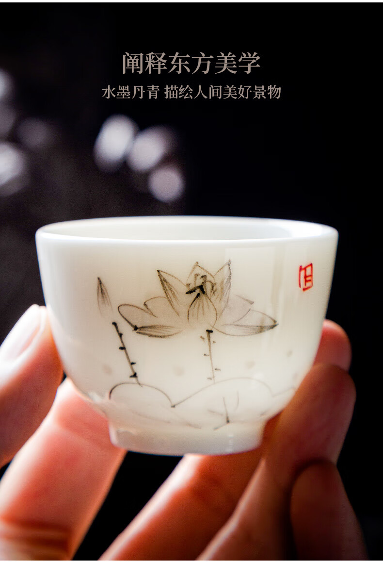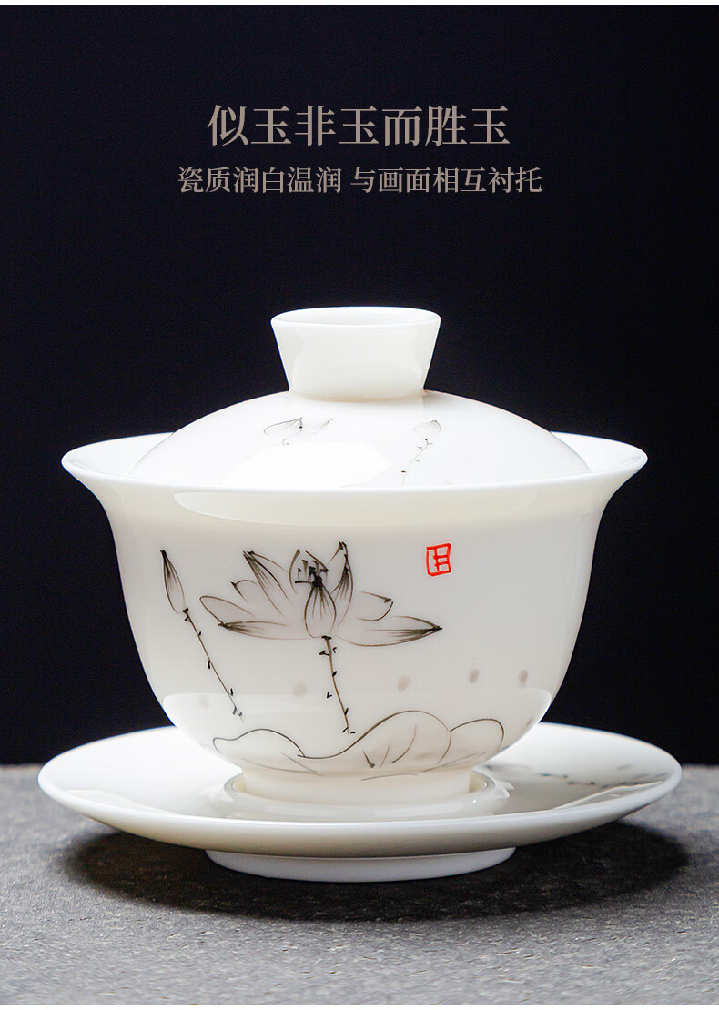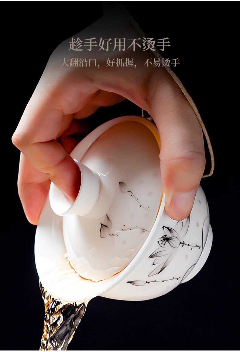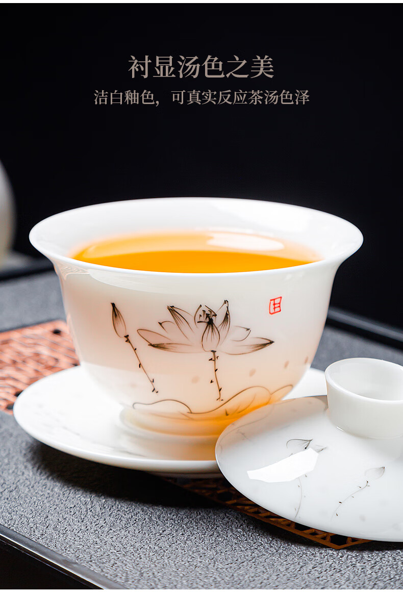 Jingcizhai hand-painted kung fu tea set household mutton-fat jade white porcelain covered bowl teapot tea cup light luxury high-end new style hand-painted ink lotus covered bowl Xishi teapot 12 heads