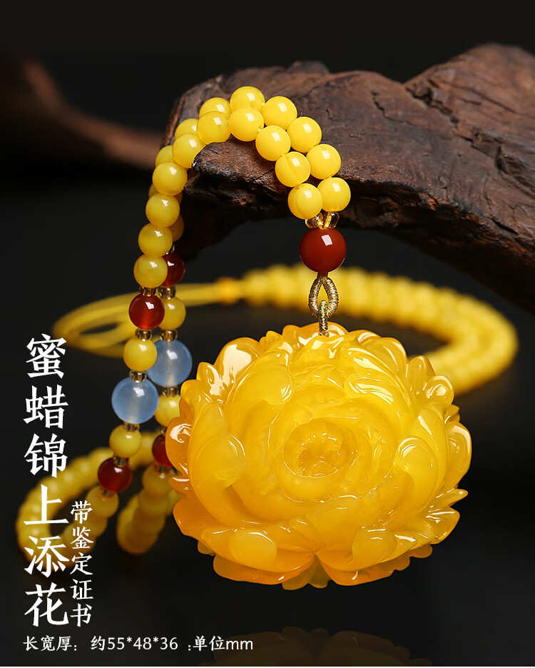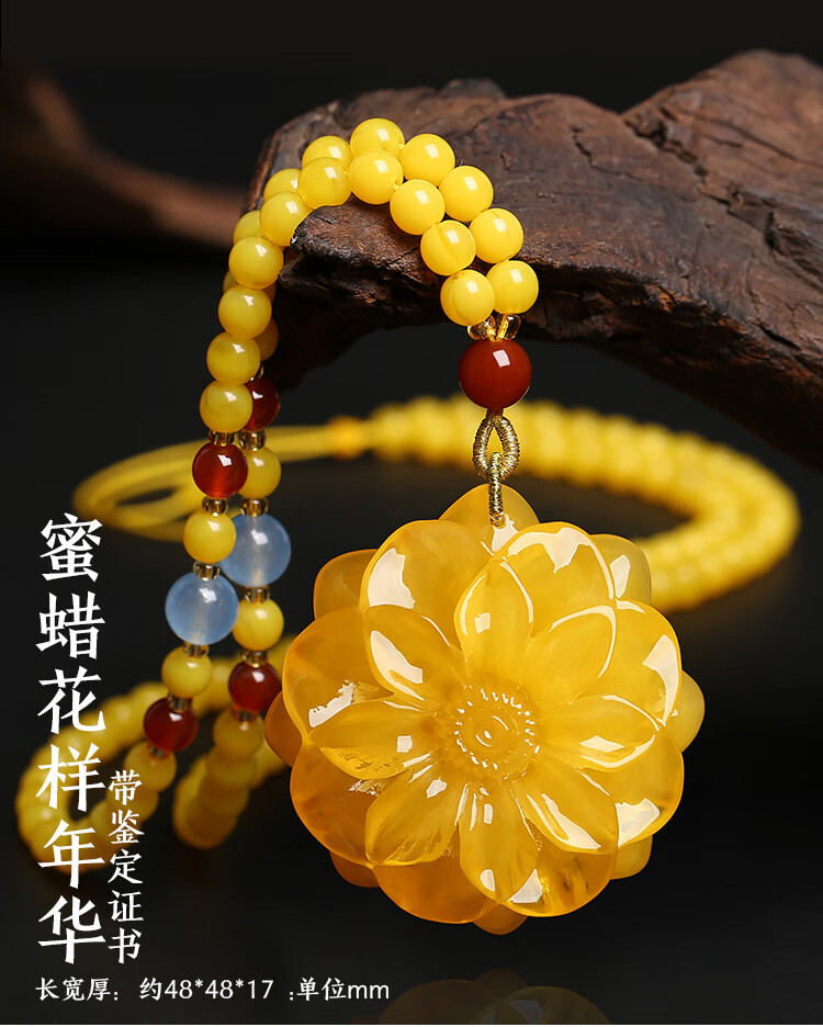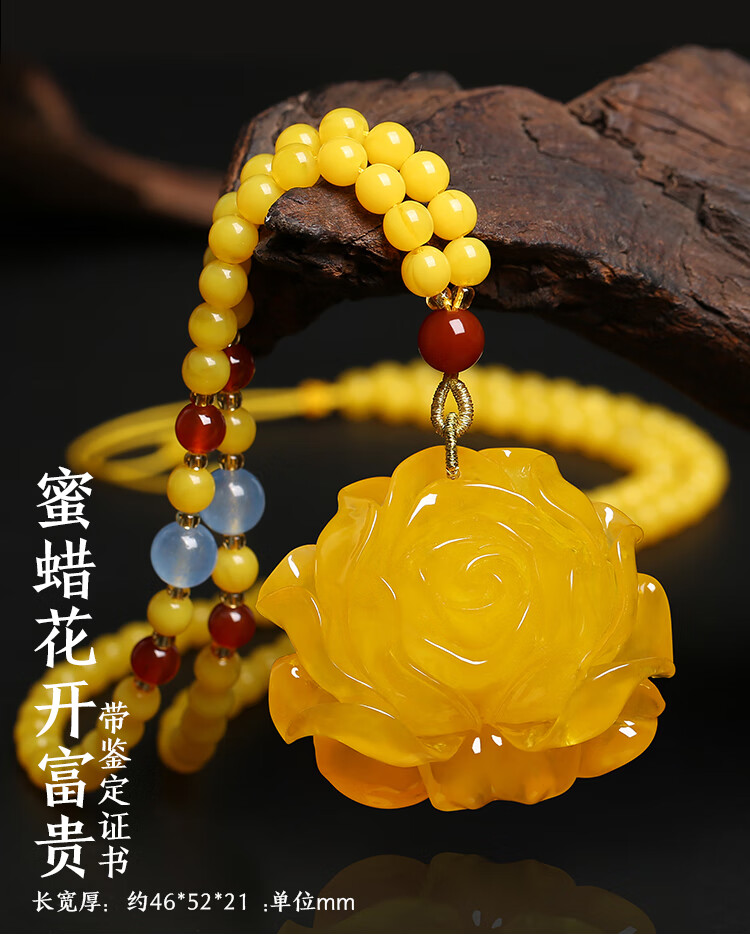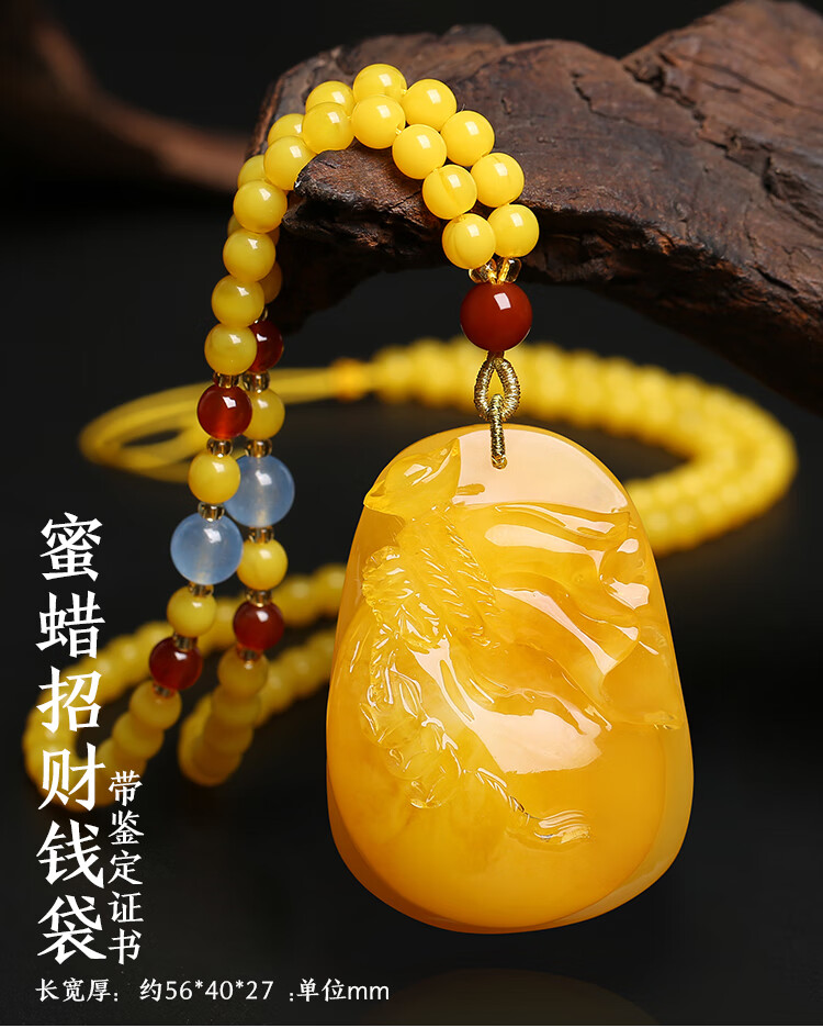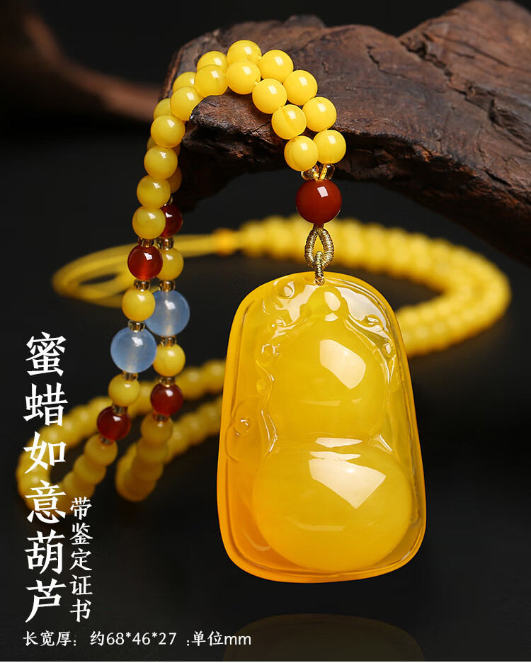 DRJEFUN with certificate natural old beeswax Dragon and Phoenix brand pendant women's necklace Wushi brand amber peony Pixiu sweater chain couple Ruyi gourd pendant + gold 0 carat silk thread bead chain