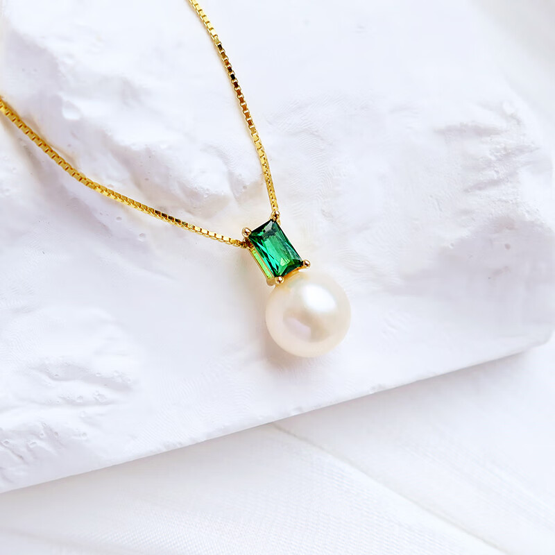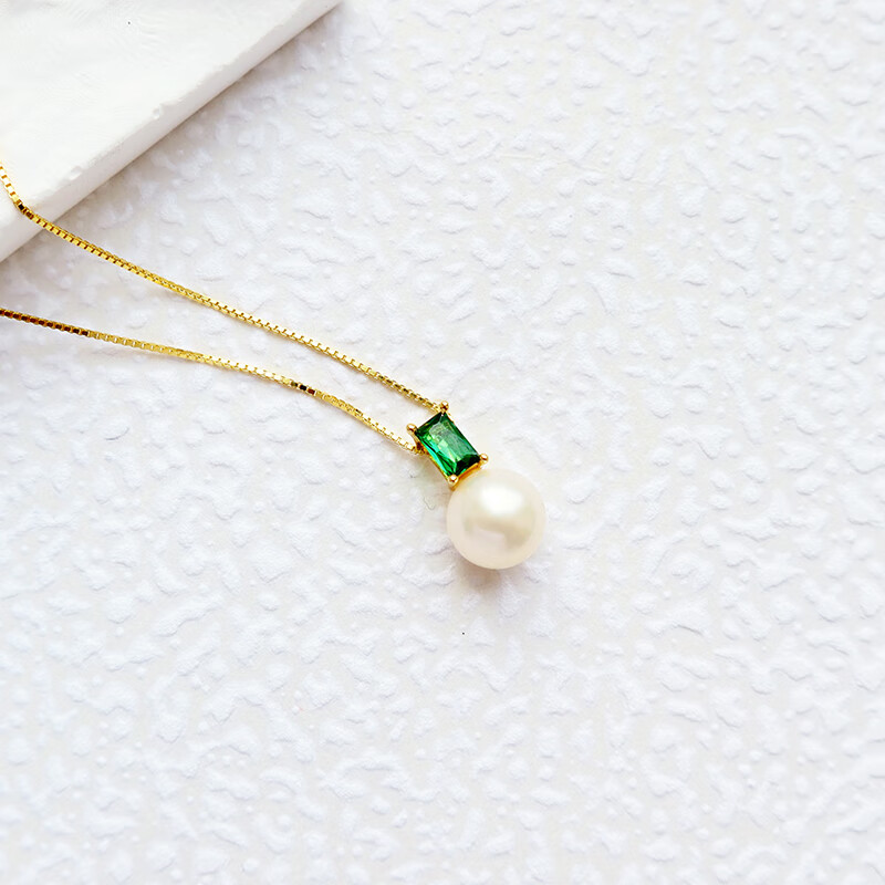 ZHUELLA Freshwater Pearl Vintage Green Zircon 925 Silver Pendant Necklace 7.5-8.5mm