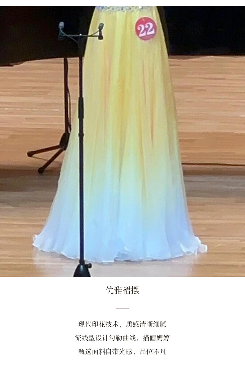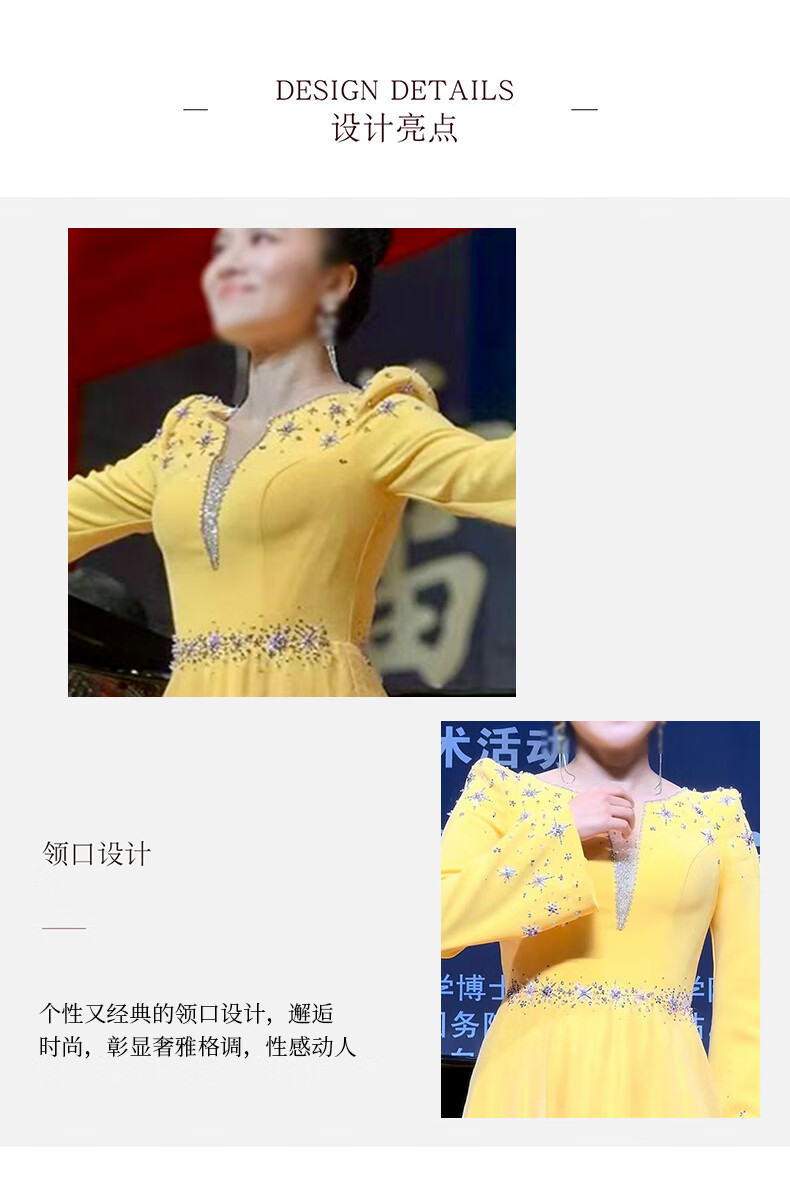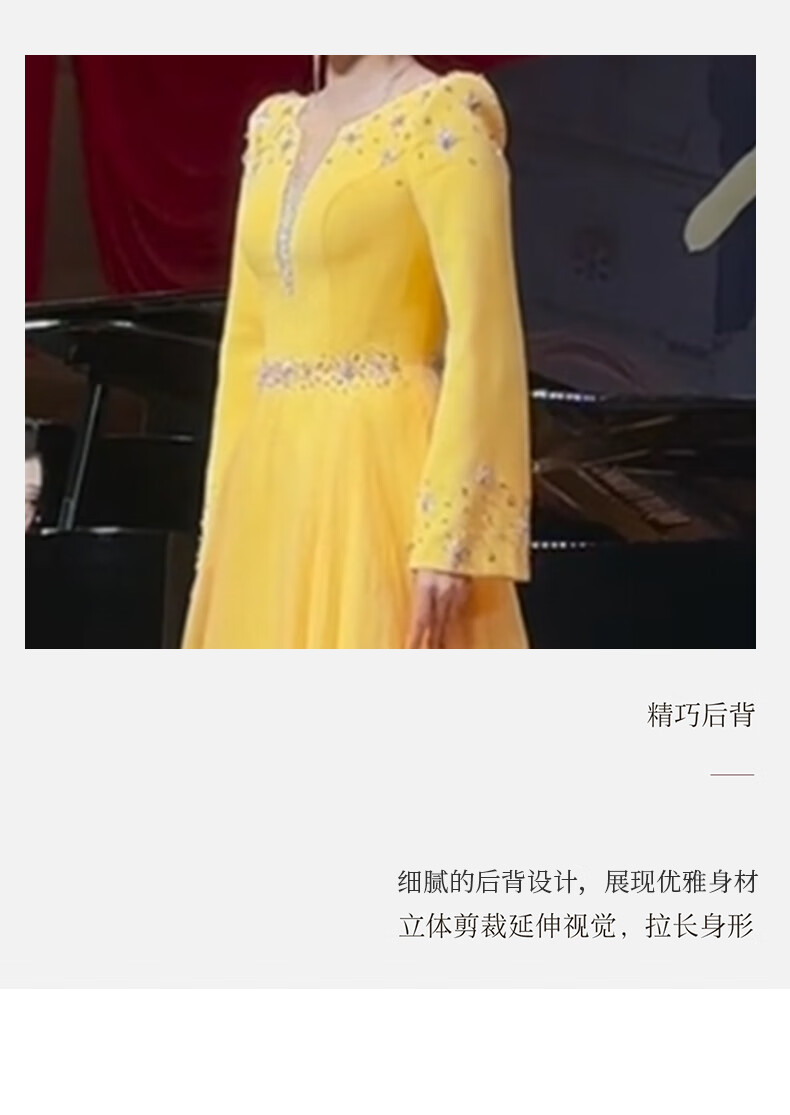 Seasonal solo performance clothing, bel canto dress, heavy beading, evening girl, dignified and elegant, long-sleeved folk song recitation host, yellow L