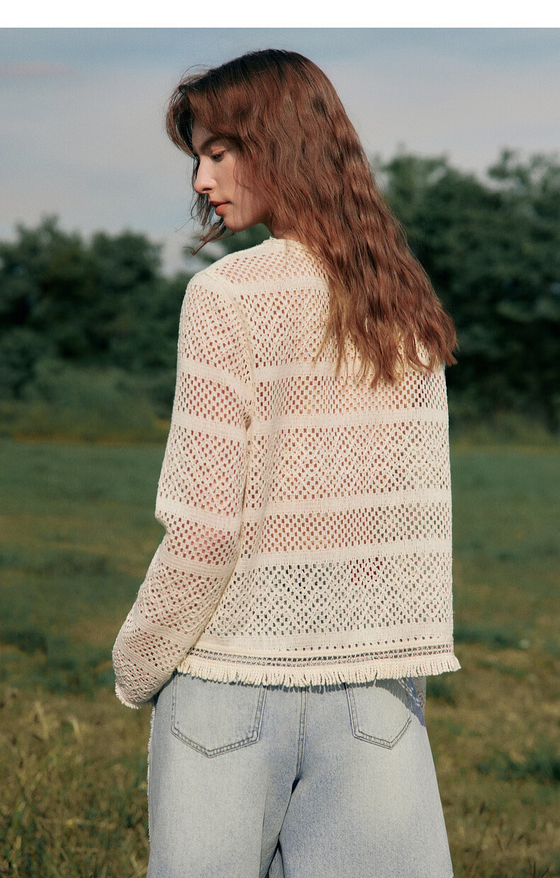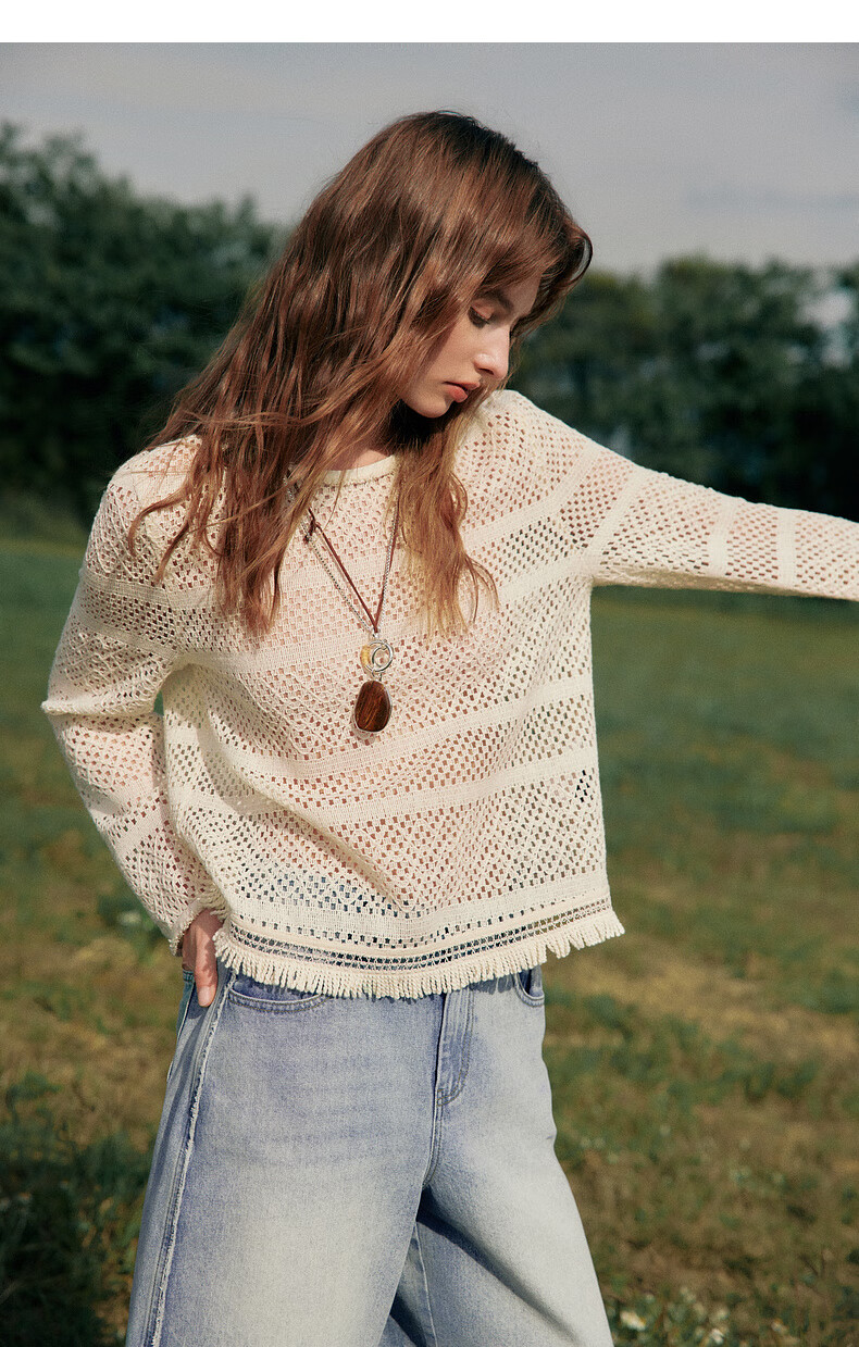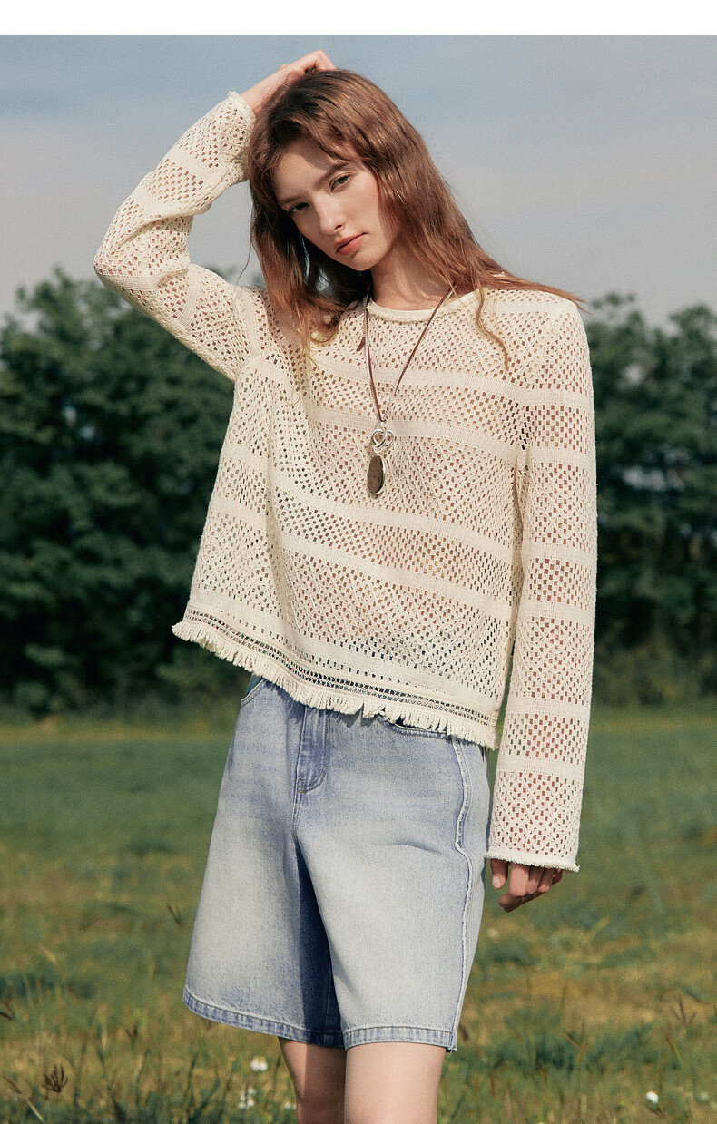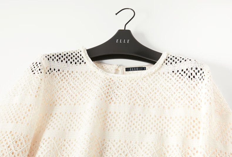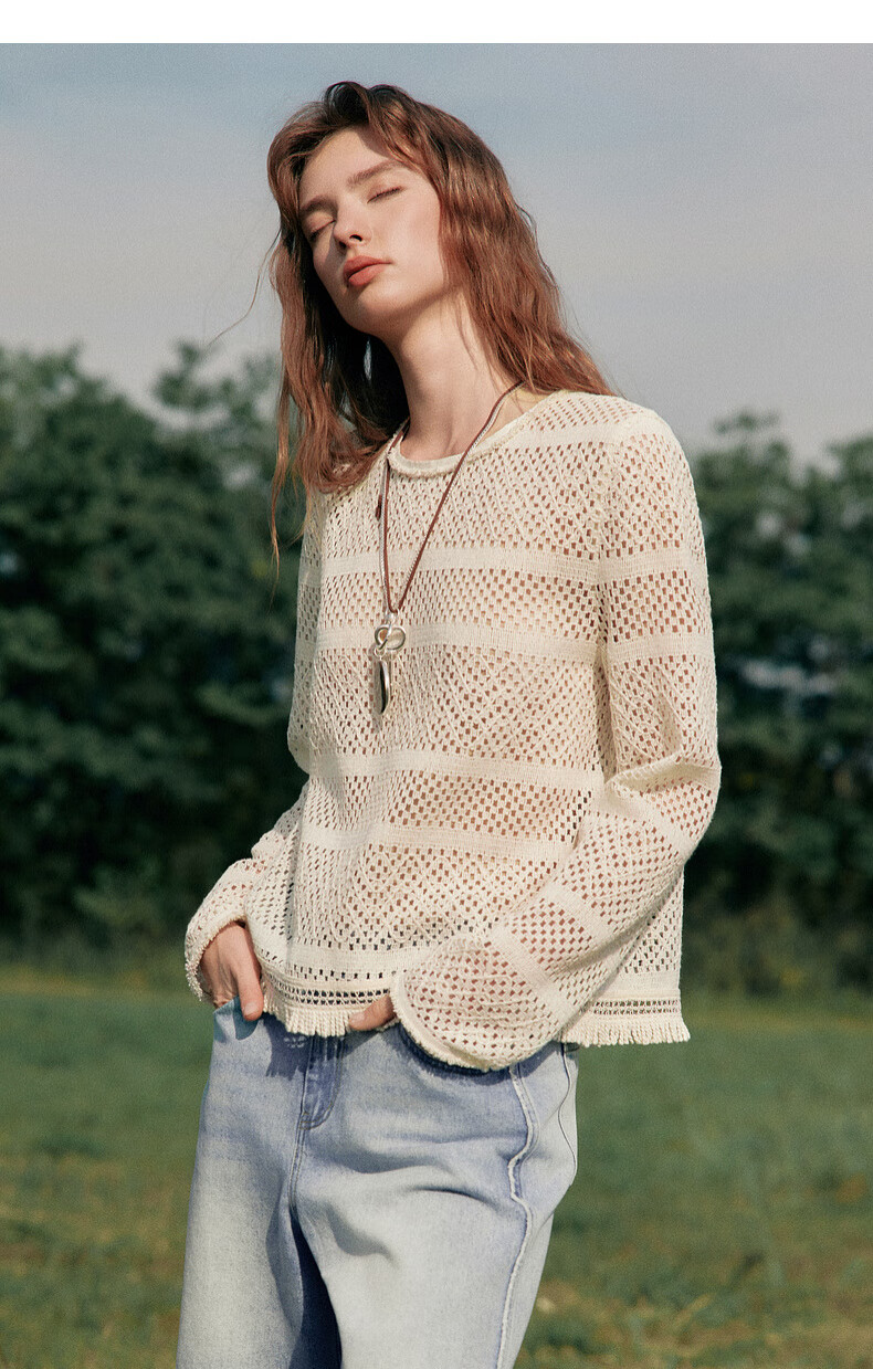 ELLE Cream Venus French fringed round neck casual shirt for women 2026 summer new hollow blouse off-white S
