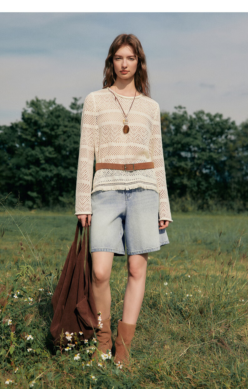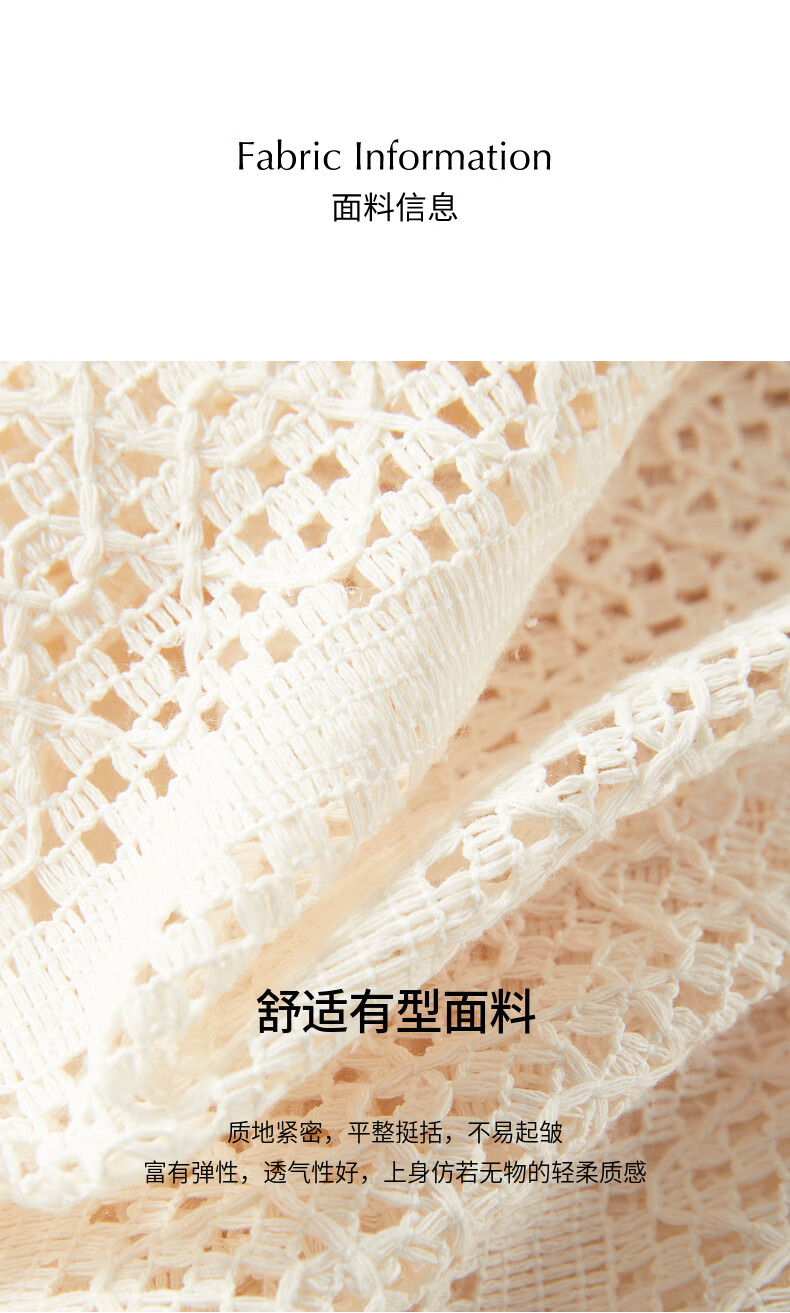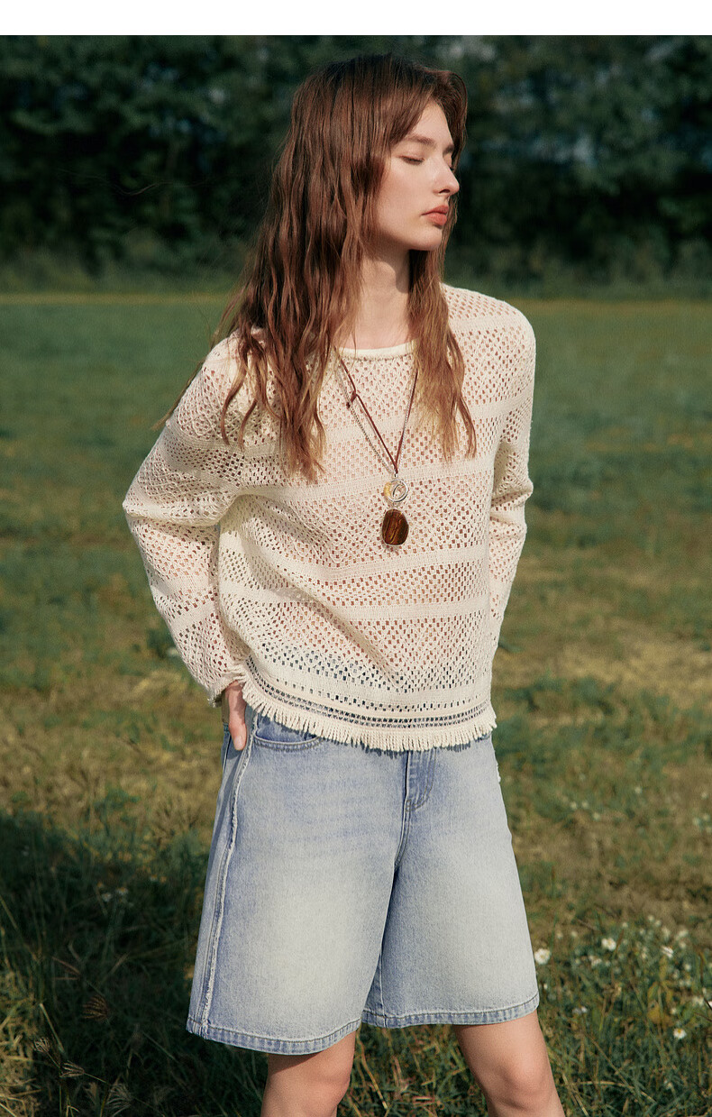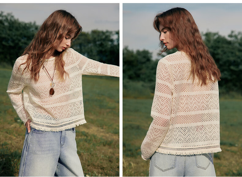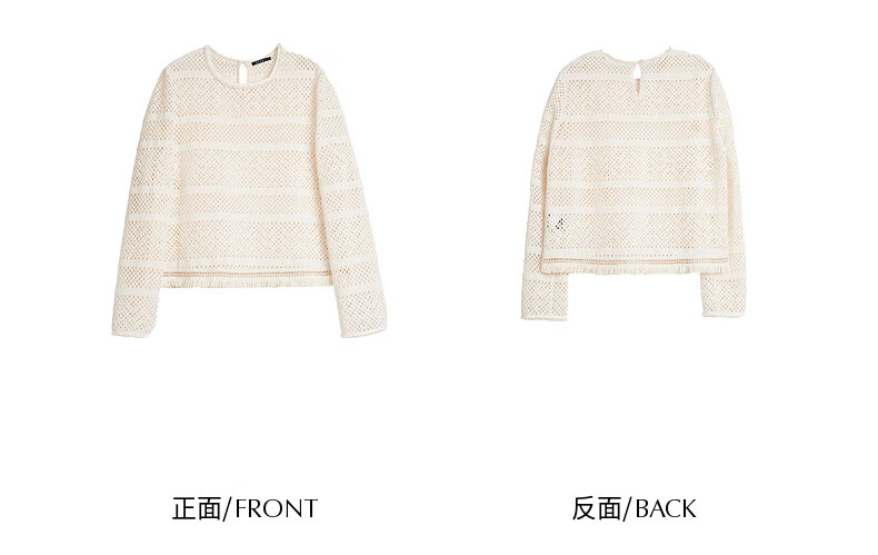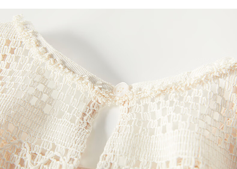 ELLE Cream Venus French fringed round neck casual shirt for women 2026 summer new hollow blouse off-white S
