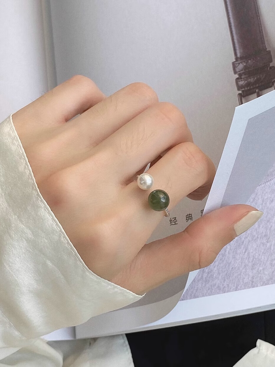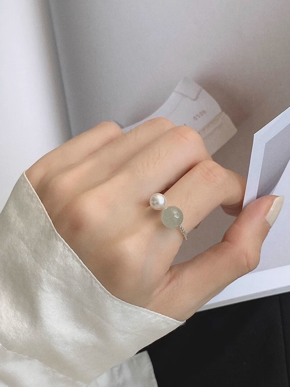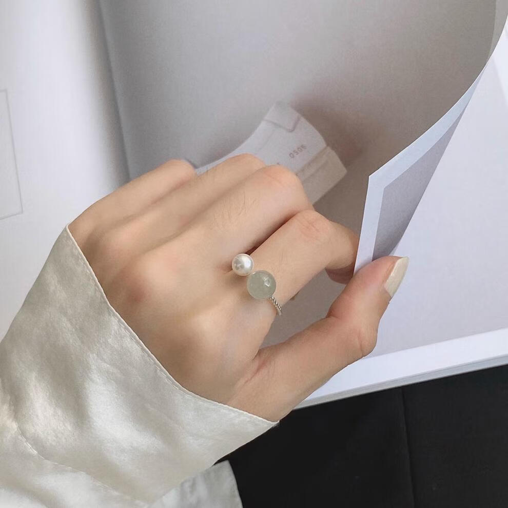 Fat Donglai's same Hetian jade ring, silver stone, jade pearl, female niche design, fashionable personality, ancient style, light luxury, light color Hetian jade pearl ring + exquisite gift box