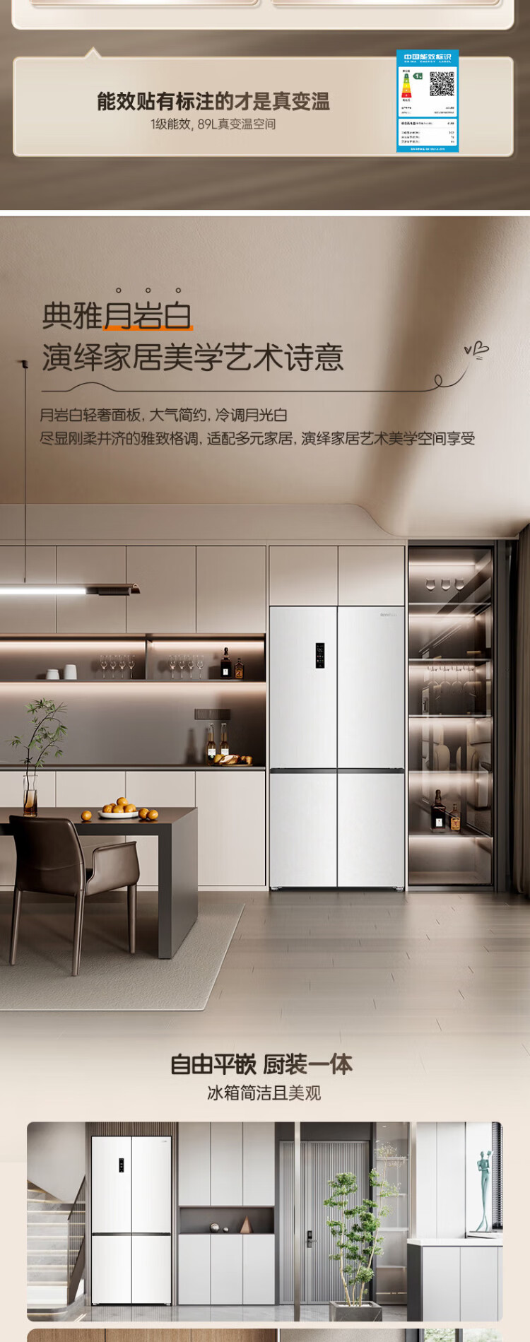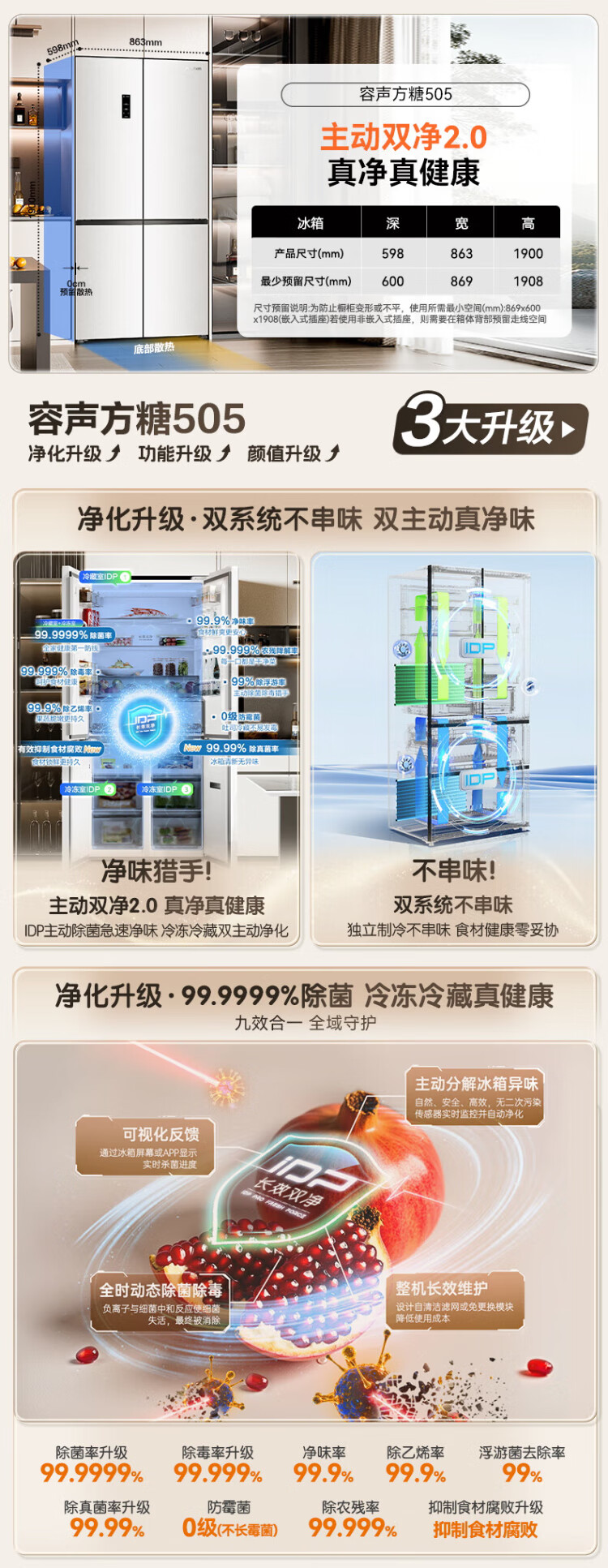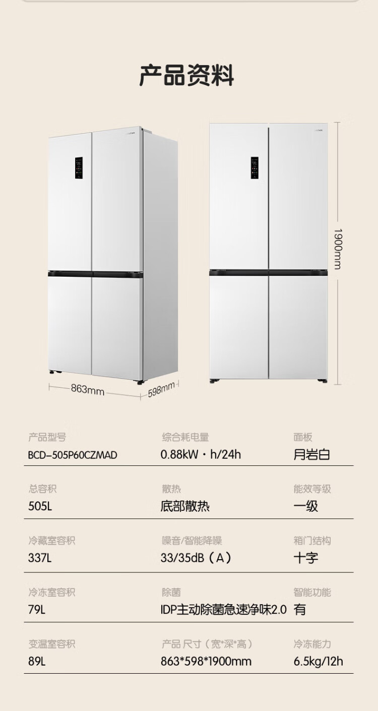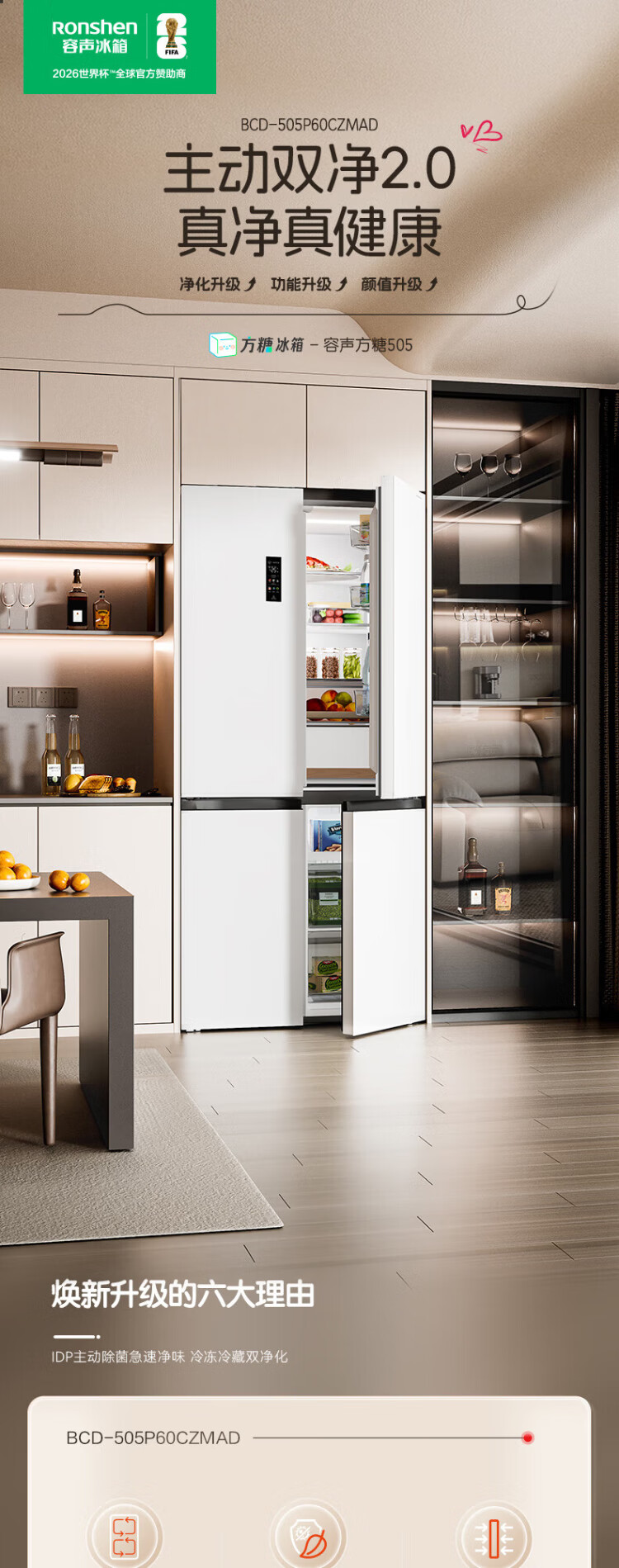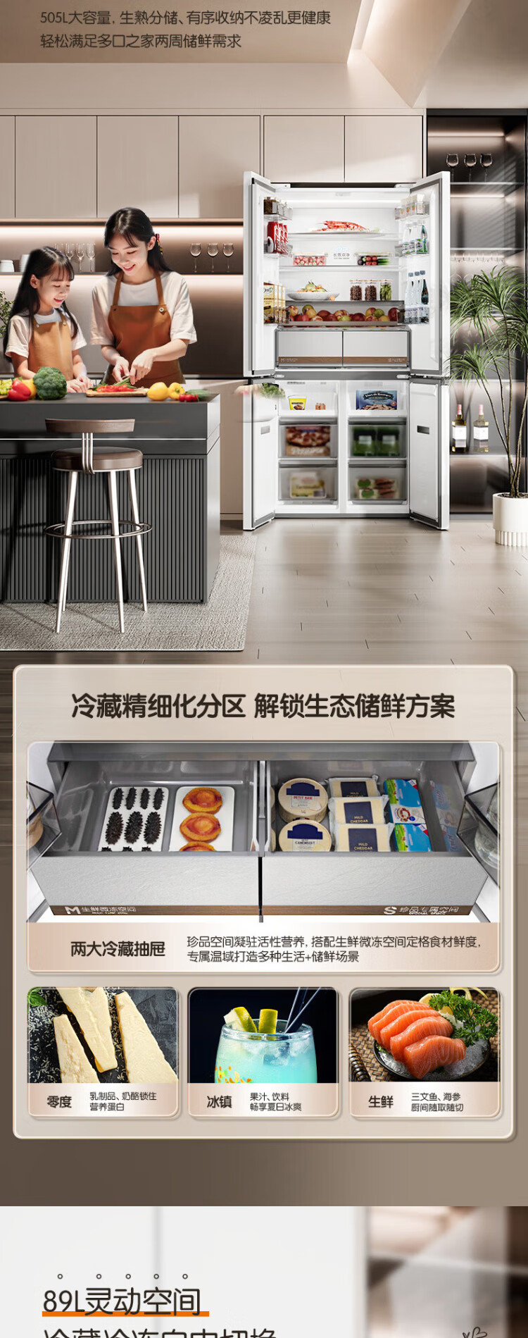 Rongsheng Tangtang 505 active dual-purification dual-system cross four-door multi-door ultra-thin zero-embedded refrigerator household first-class energy efficiency BCD-505P60CZMAD white national subsidy