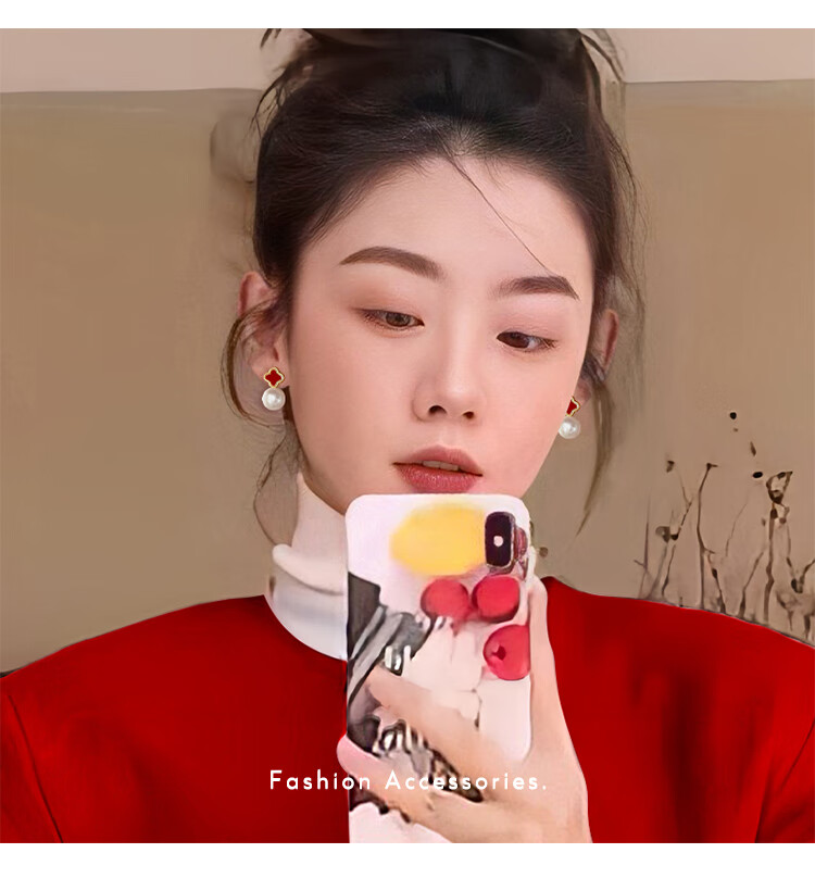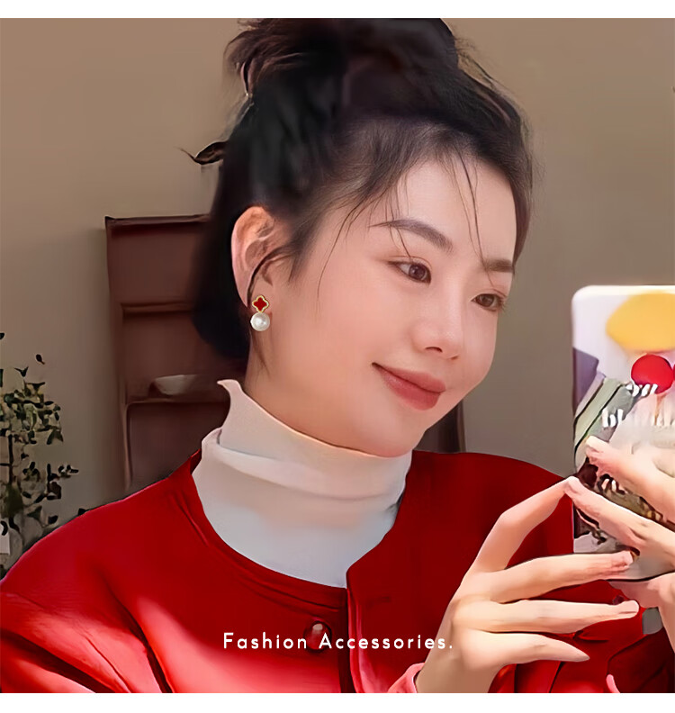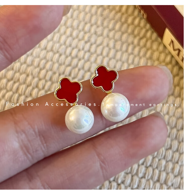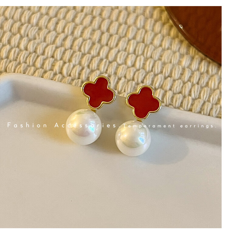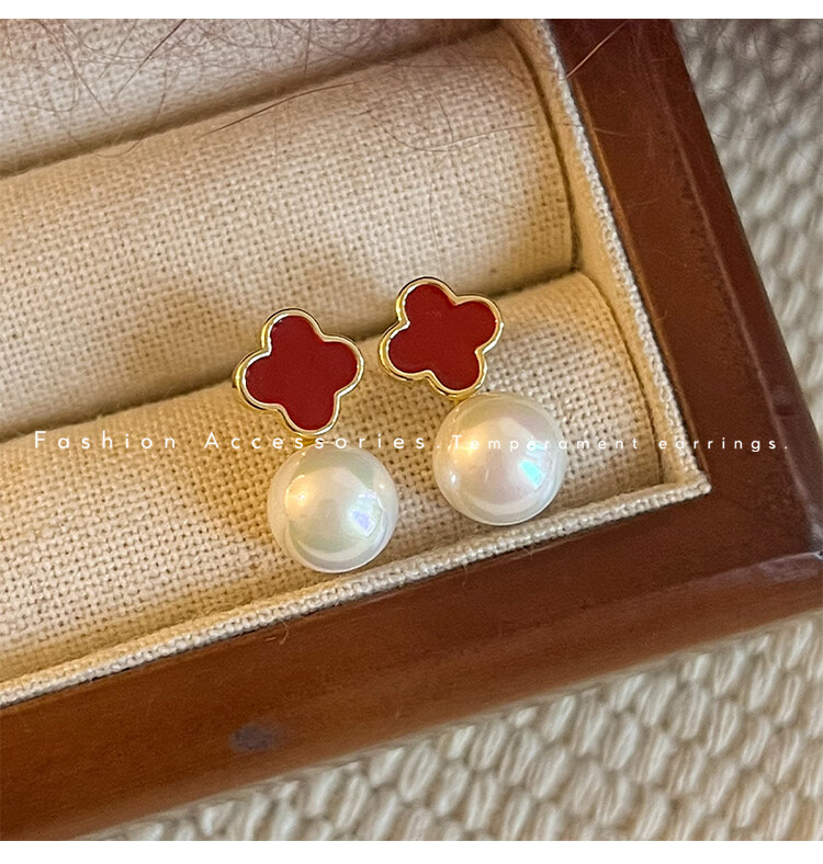 Flash engraved four-leaf clover earrings for women, light luxury niche earrings, new temperament French birthday gift, red four-leaf clover earrings s925 silver needle