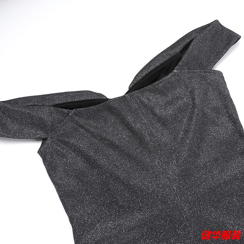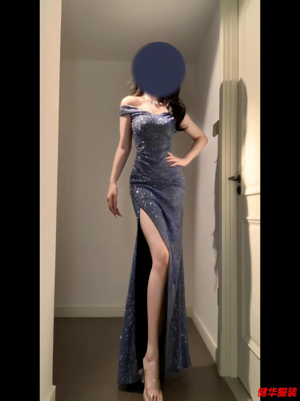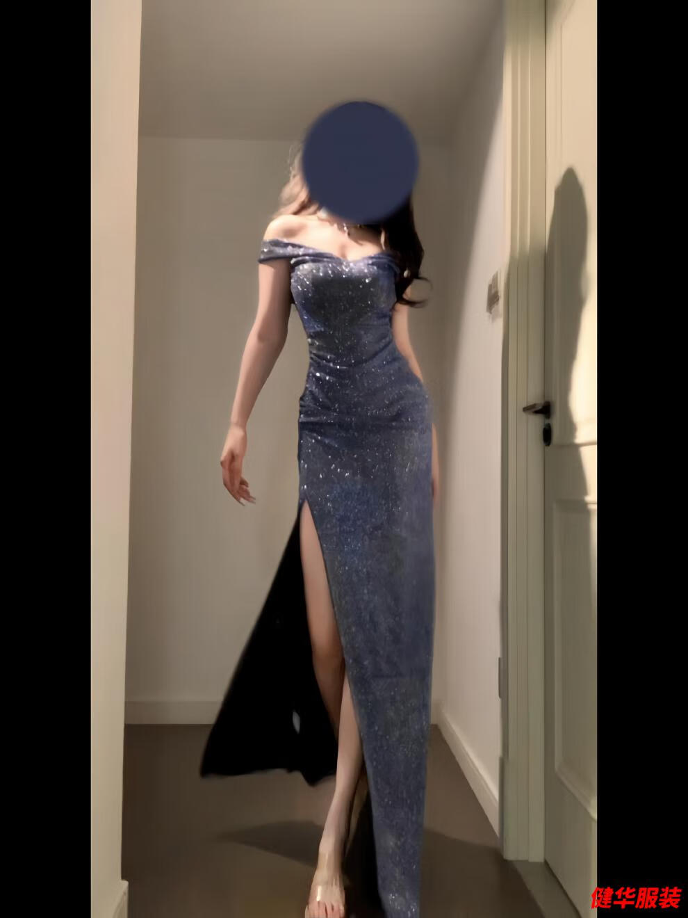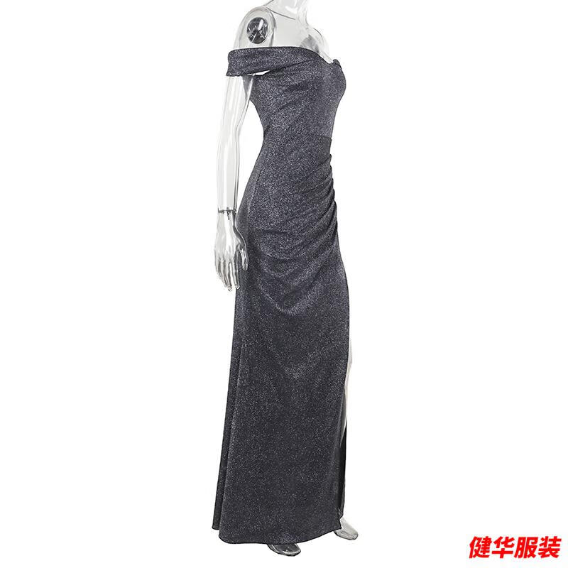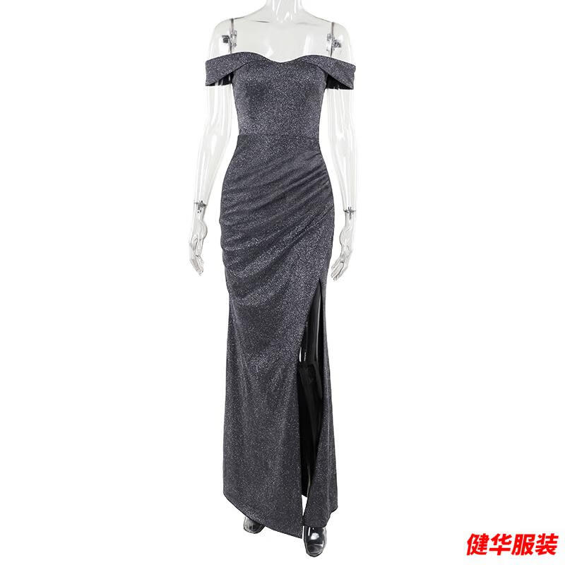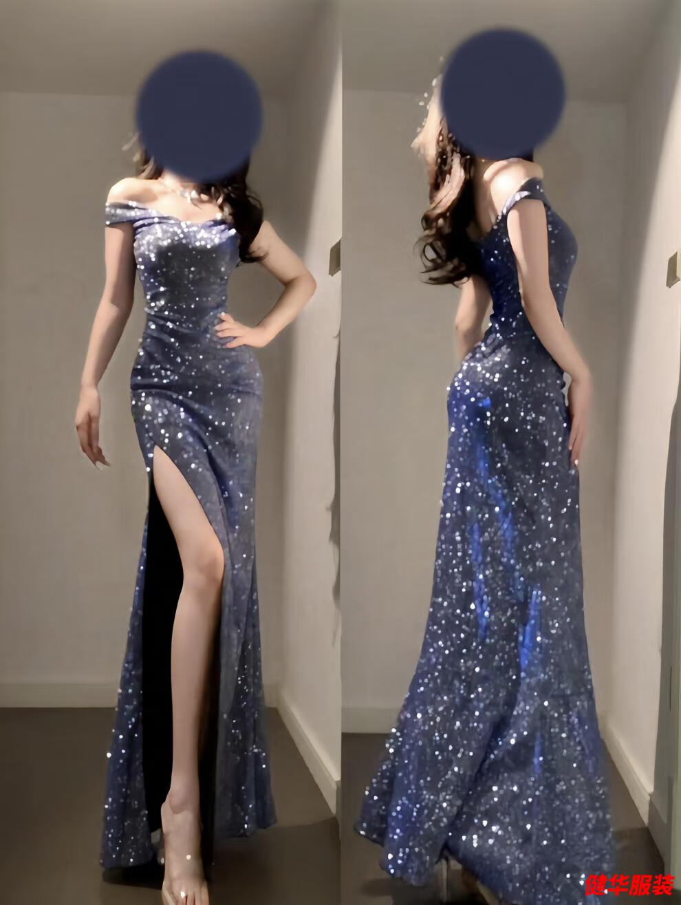 Meianjiagan Blue Sparkling One Shoulder Dress Feminine Catwalk Birthday Party Dress Sexy Slit Long Skirt Blue S