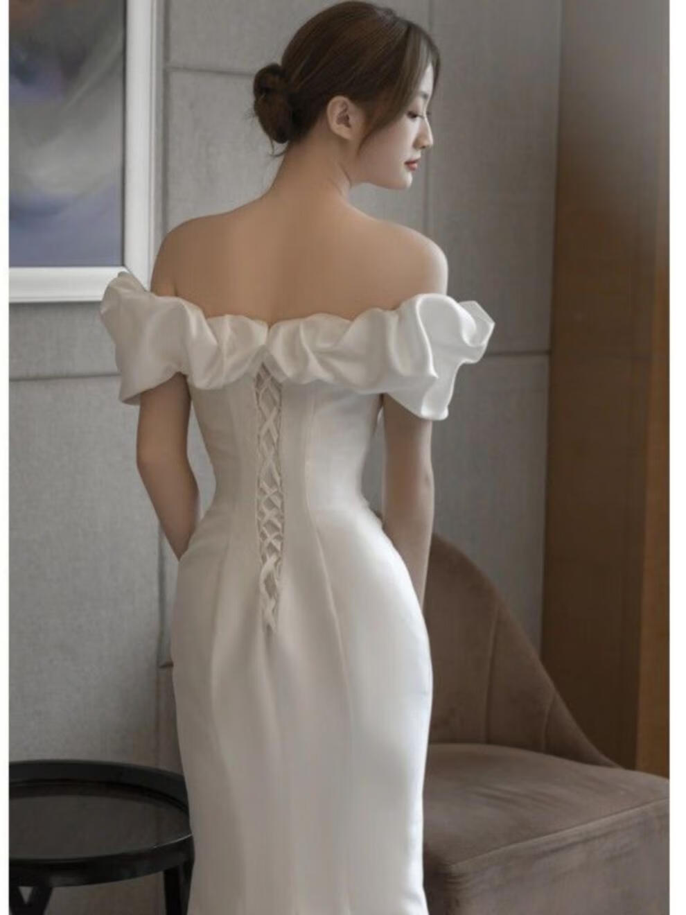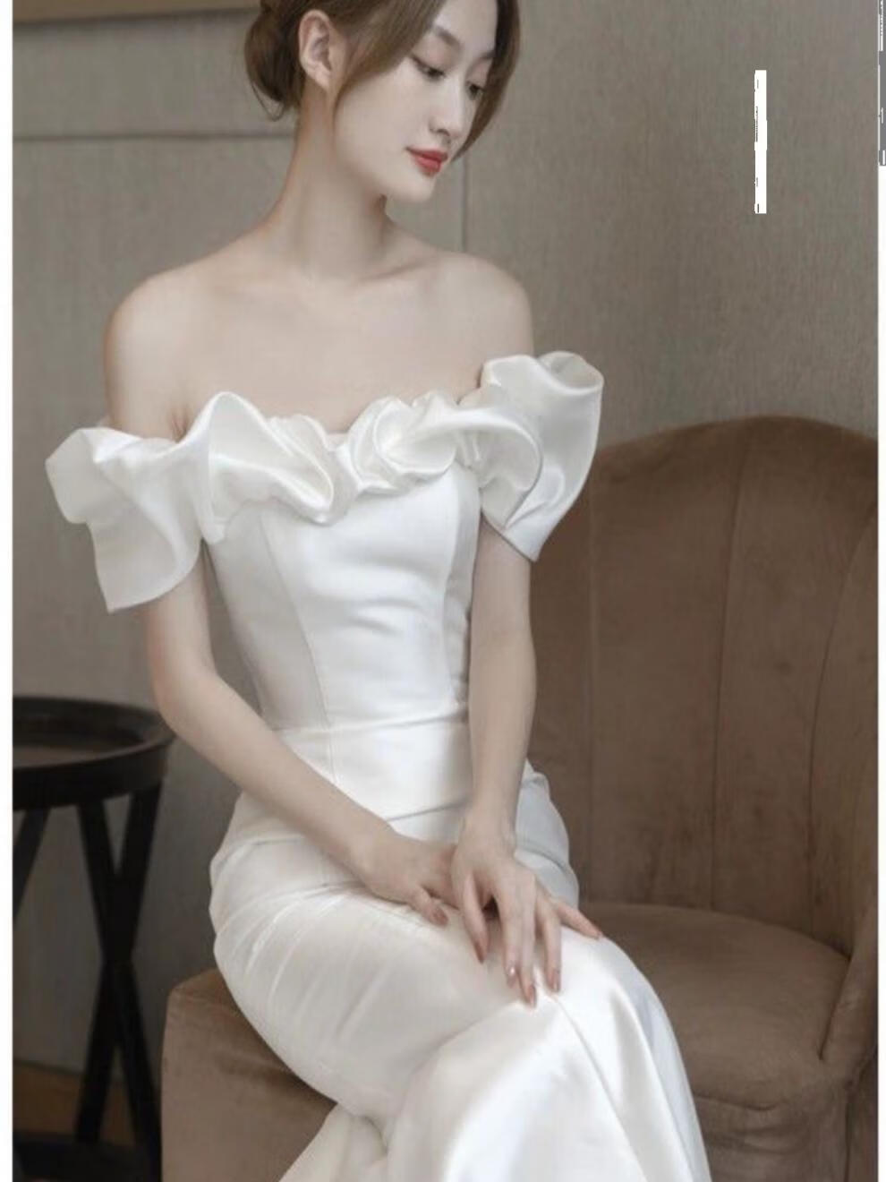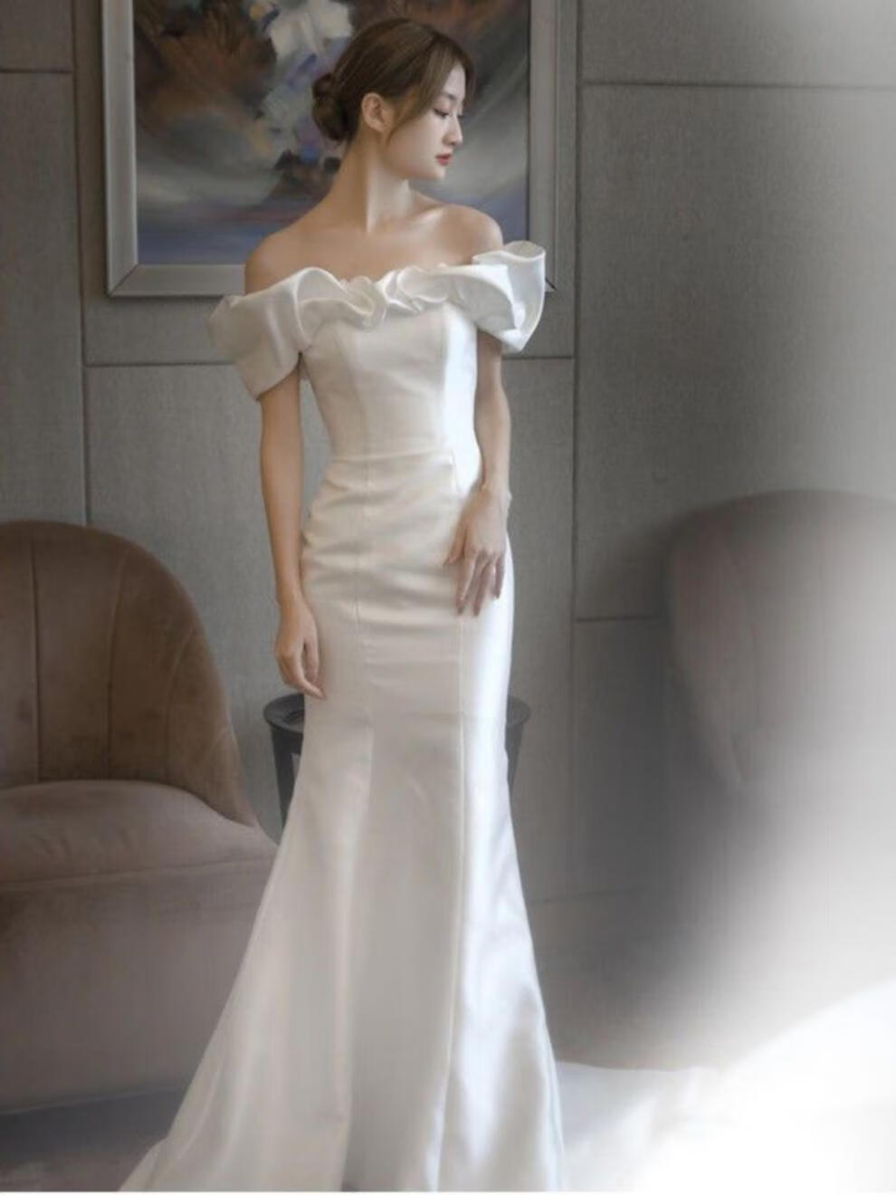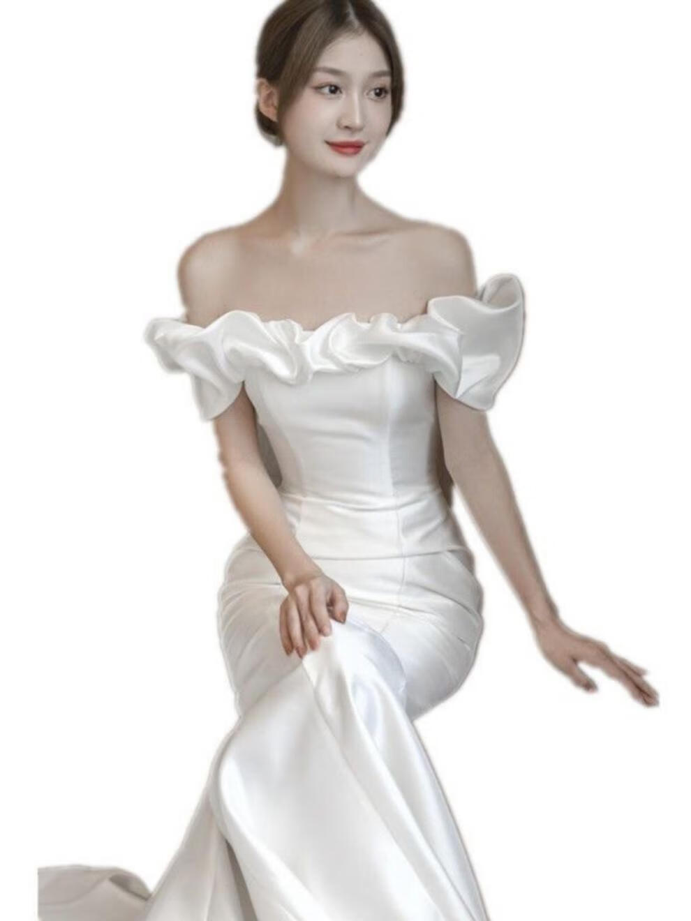 Chuangjingyi chooses light wedding dress, one-shoulder French light wedding dress, satin temperament, fishtail for bride, slimming, small tail, white S