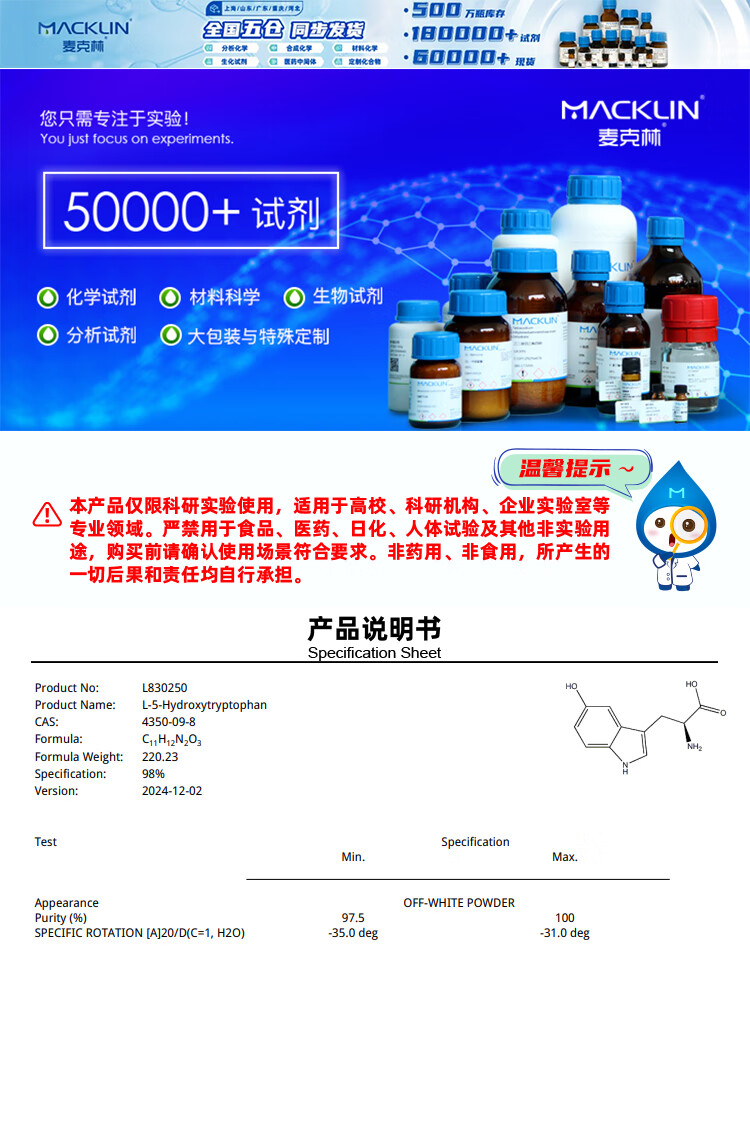 Macklin 5-Hydroxytryptophan CAS 4350-09-8 L830250-25g