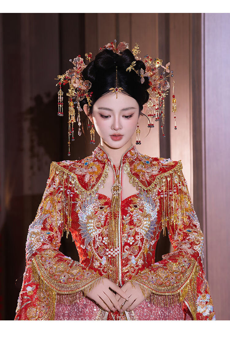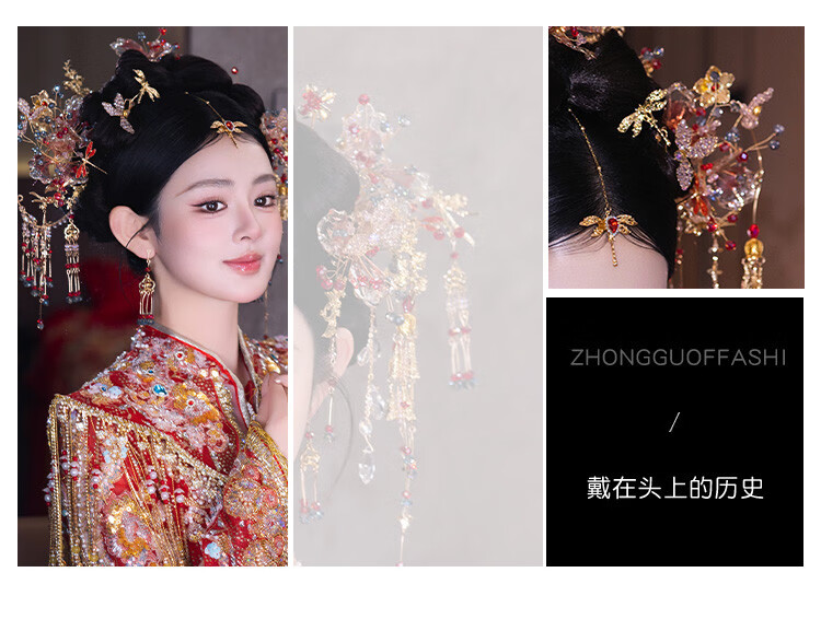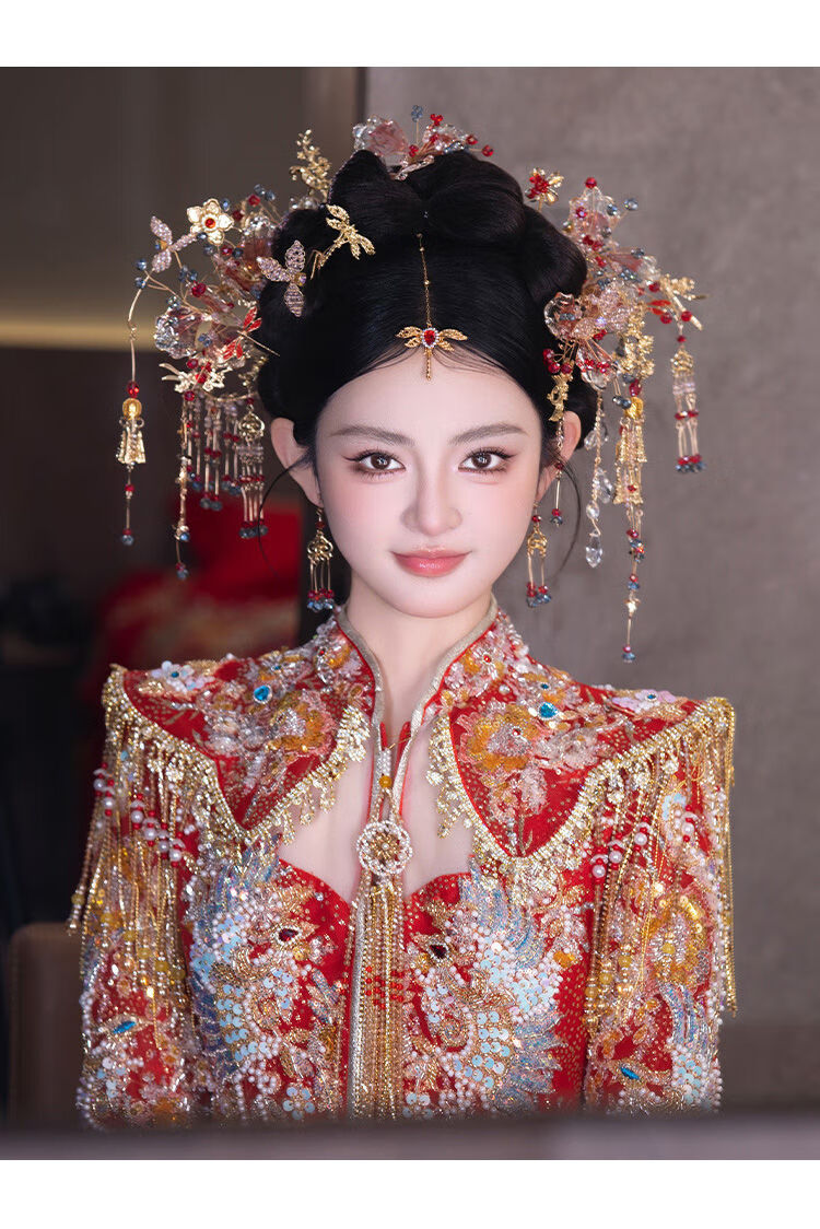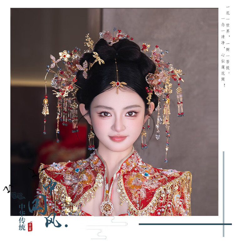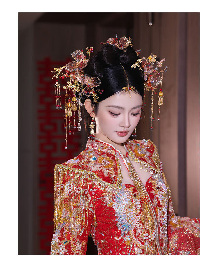 Fujiu Chinese wedding handmade liquid flower light color phoenix hairpin ancient costume hair accessories retro Hanfu bride traditional headwear set hair accessories set G0190