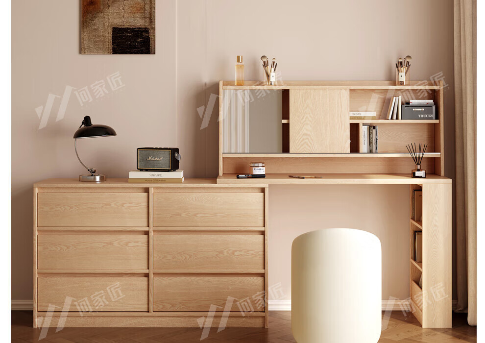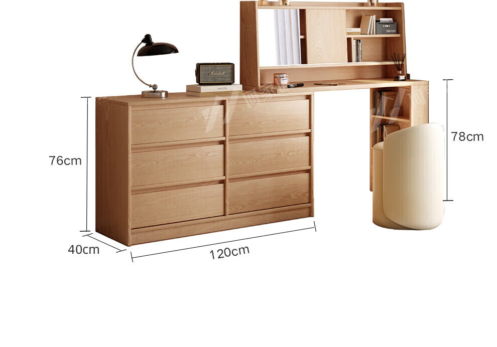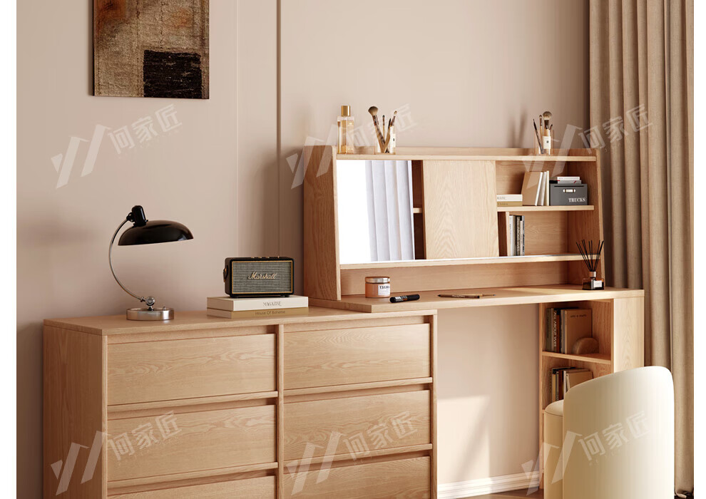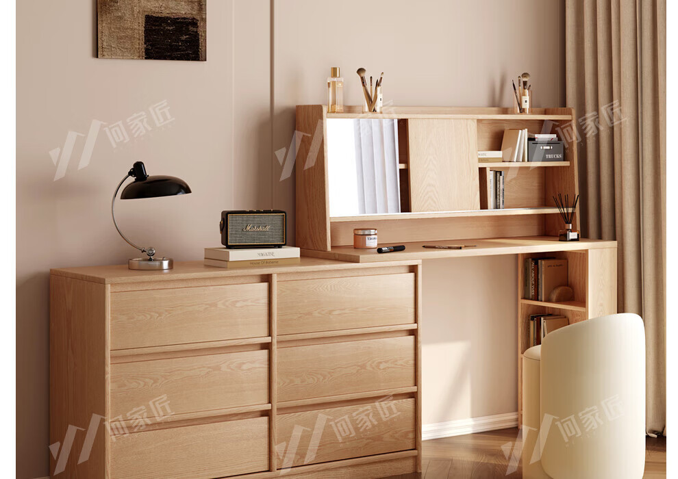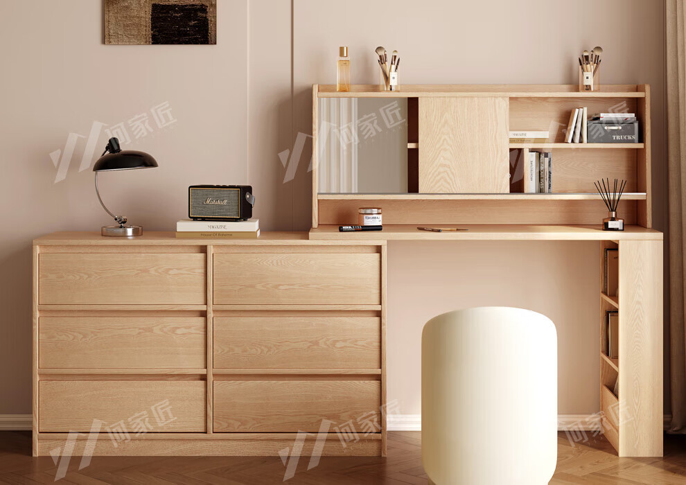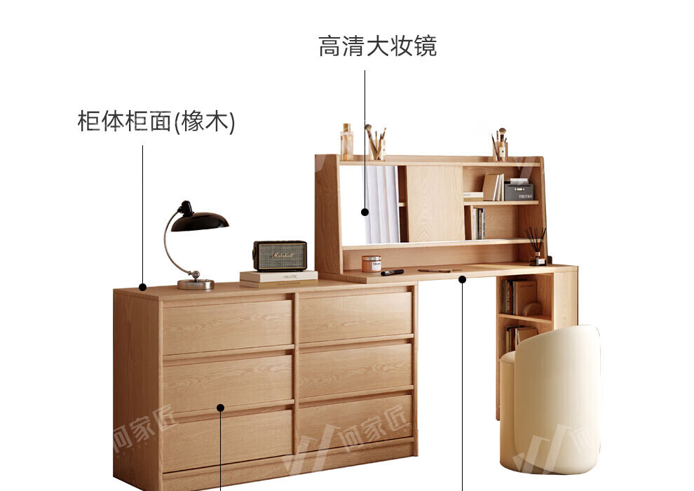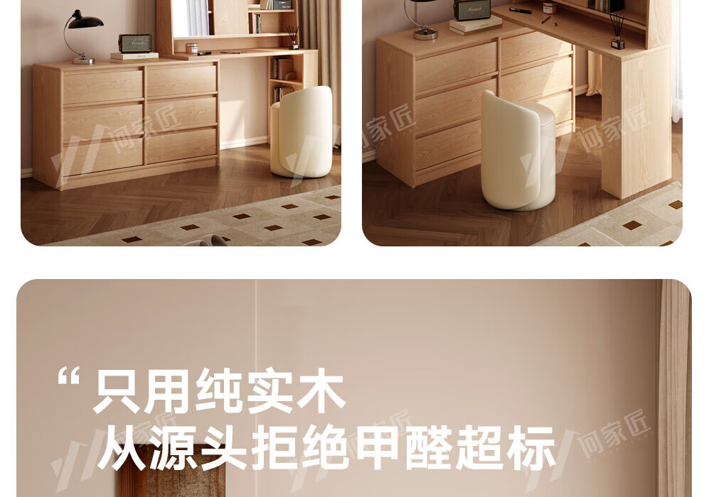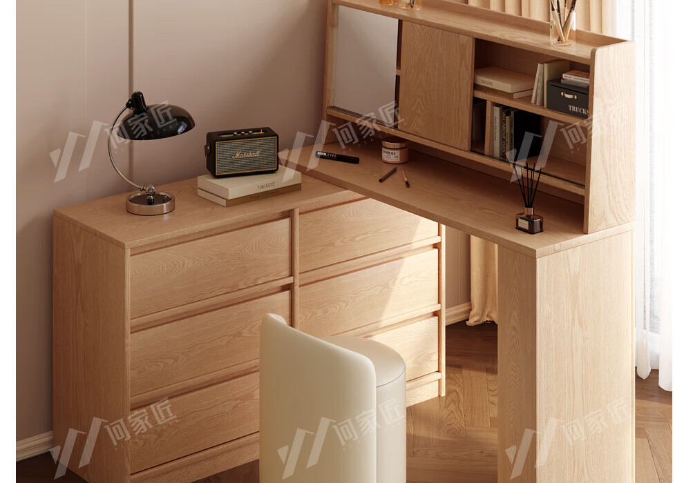 He Jiajiang all solid wood oak bedroom dressing table, cupboard and desk integrated corner dressing table, log style multi-functional dressing table, 1.2m cupboard + 1.2m dressing table + makeup stool, all solid wood