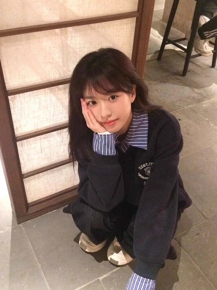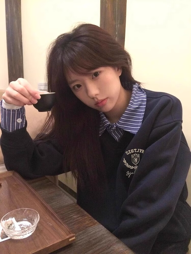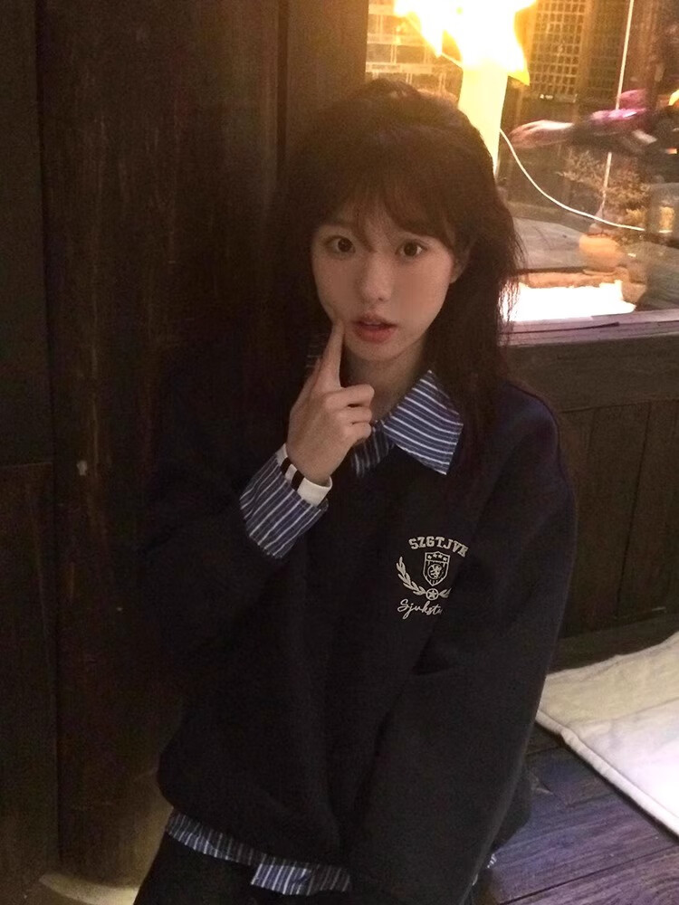 LDBE splicing shirt fake two-piece sweatshirt for women spring and autumn thin college style loose lazy hooded top design trendy navy blue (spring and autumn thin) M 95-110Jin Jin equals 0.5 kg