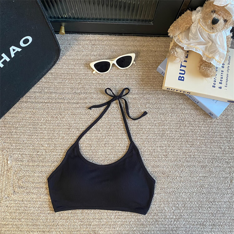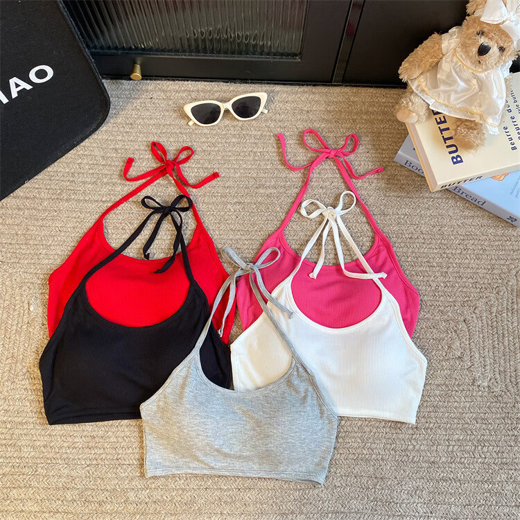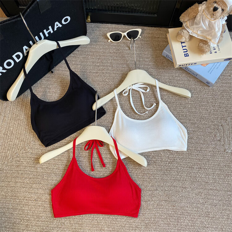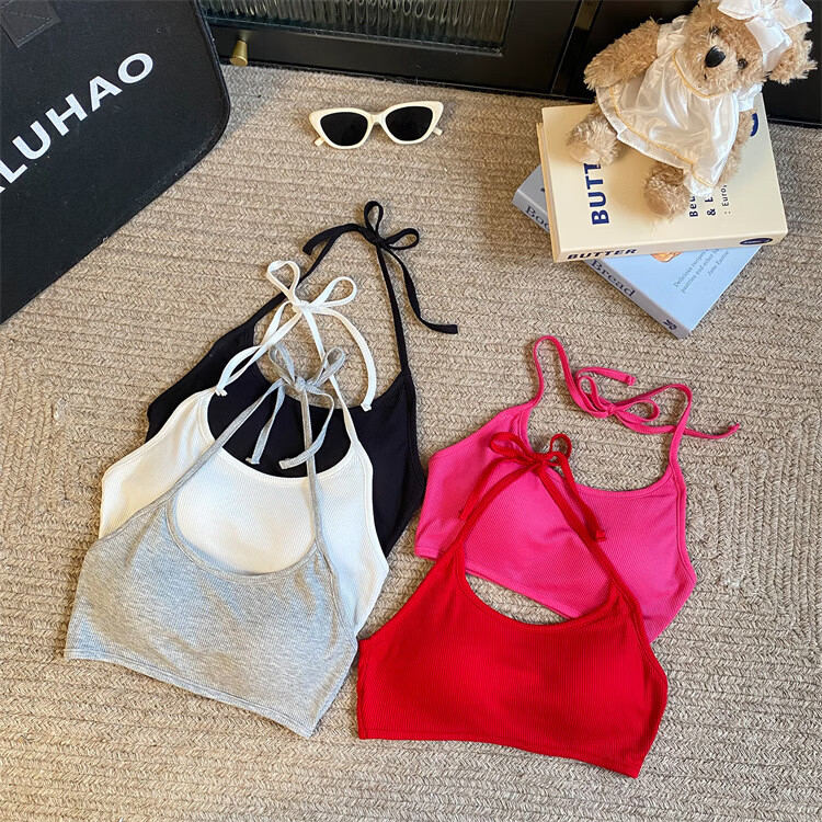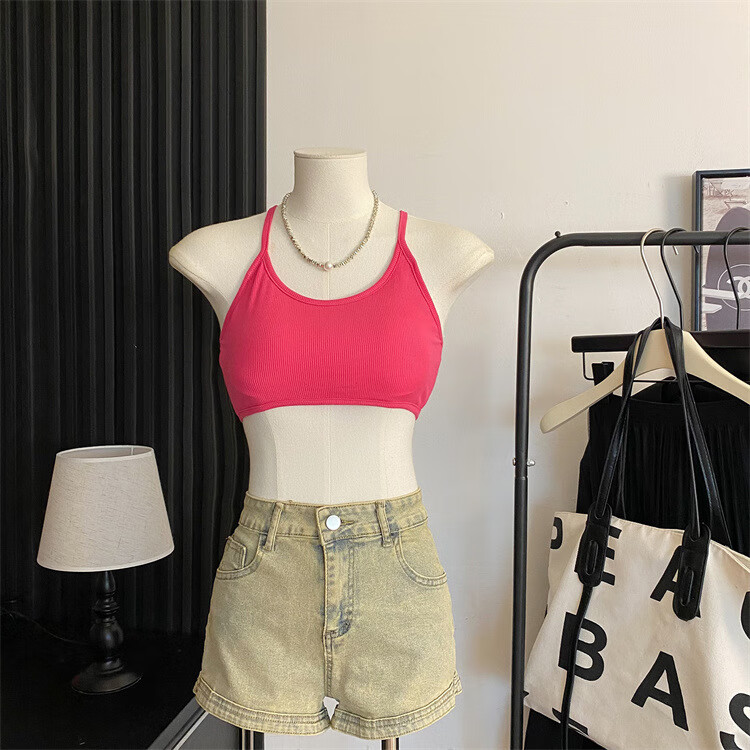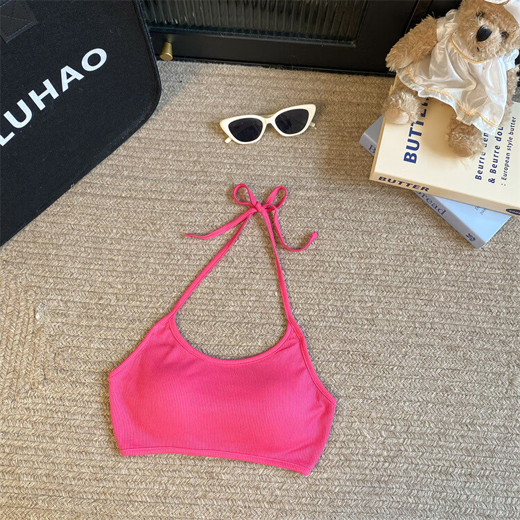 Sexy strappy halterneck hot girl's beautiful back-wrapped chest strap and padded underwear exposing navel short bottoming tube top, rose red, one size fits all