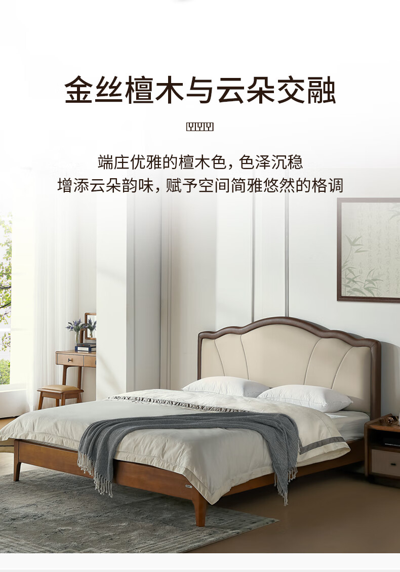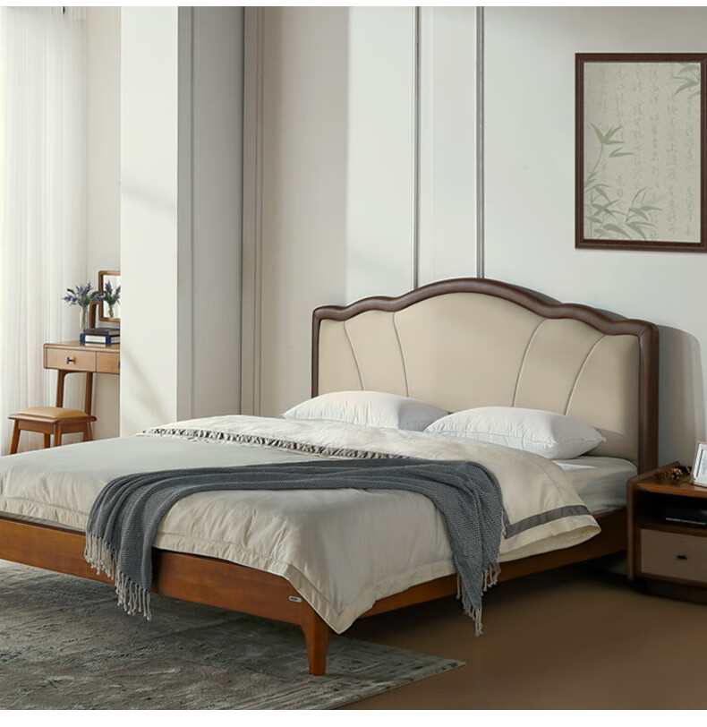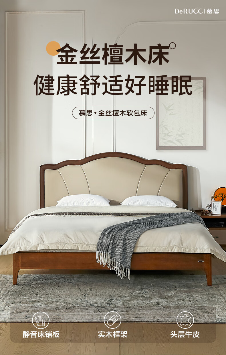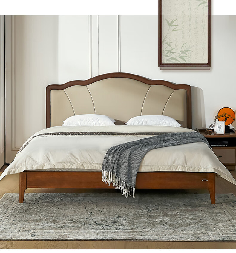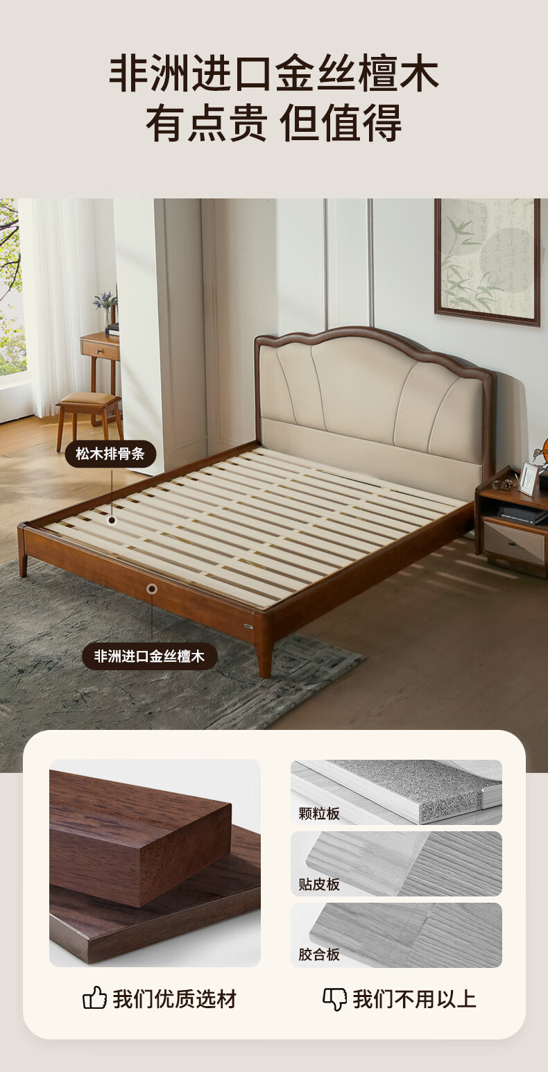 Mousse (de RUCCI) Solid Wood Bed Golden Sandalwood Bed Master Bedroom King Bed Double Bed 1.8 Meters Simple Soft Back Bed Retro Style Crown Bed Full Edge Style (Retro Color)-BCW1-139 (Including Latex Mattress) 1.8*2 Meters