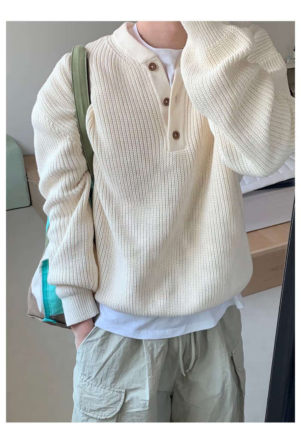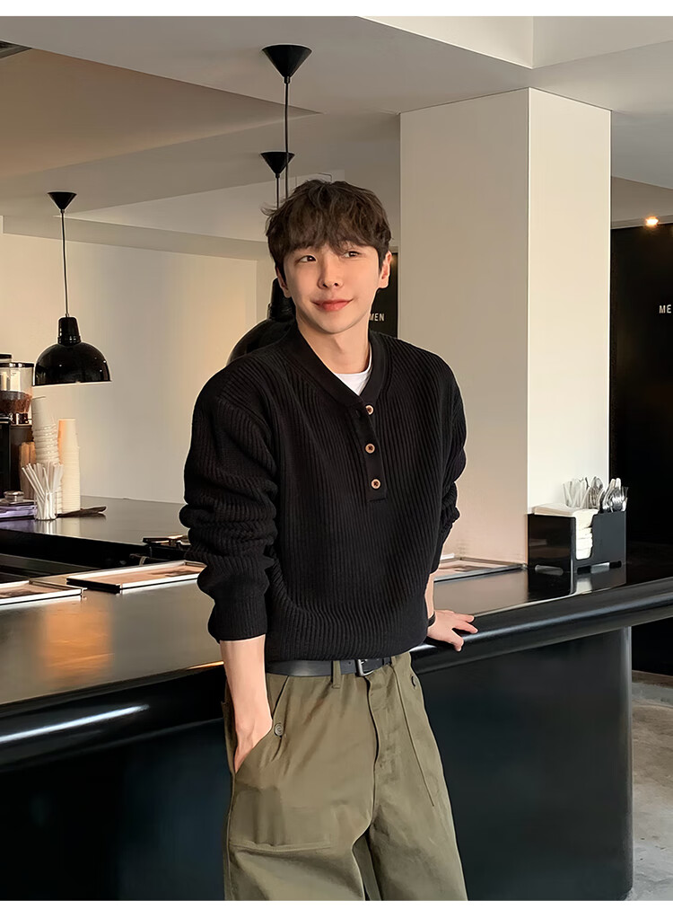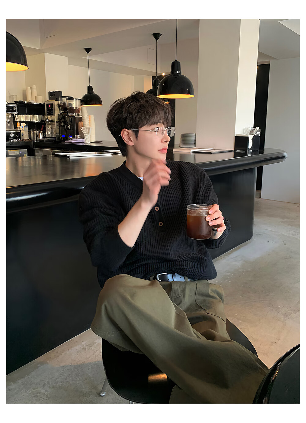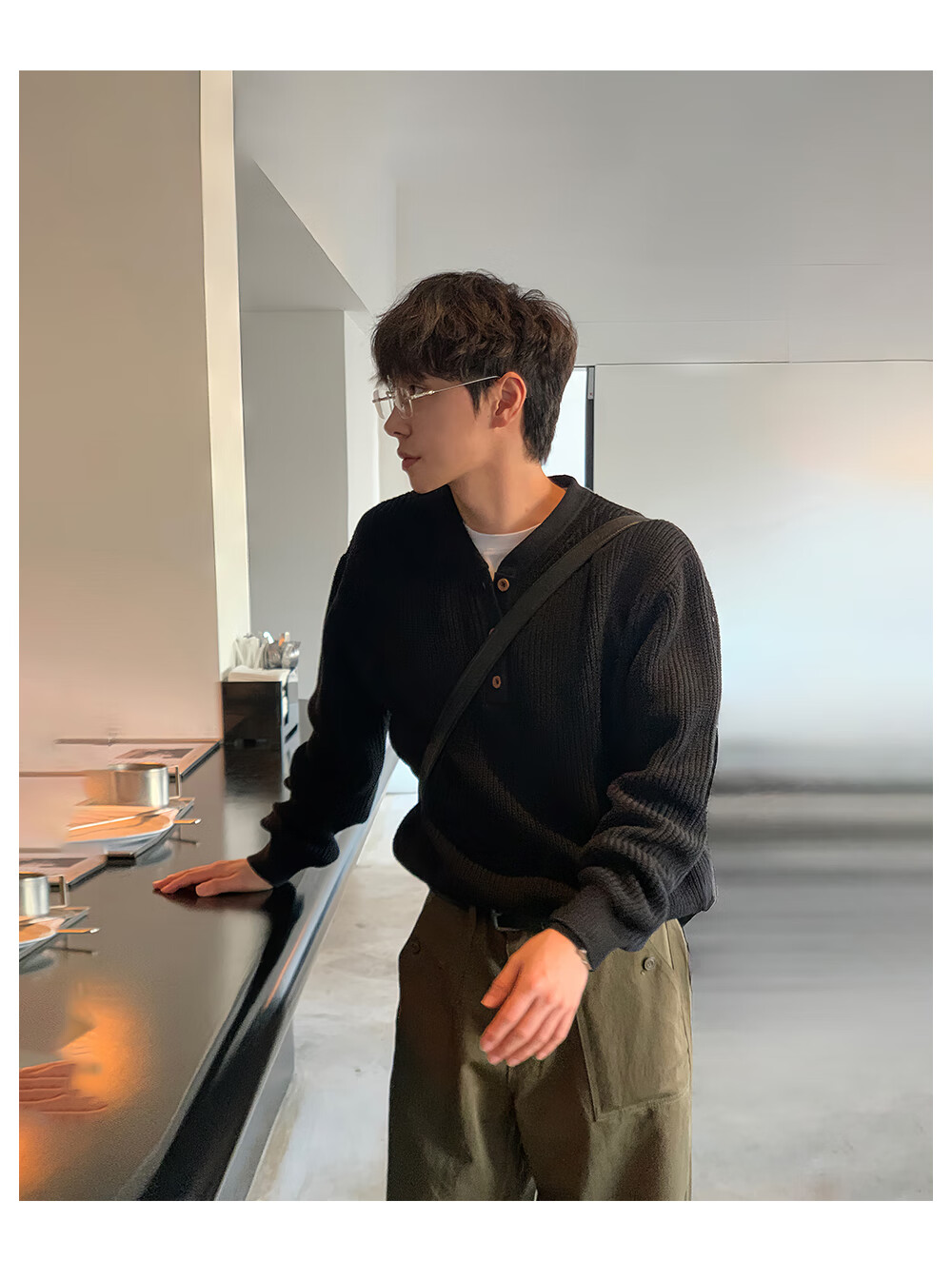 DAVID&ME American retro black Henry collar long-sleeved sweater men's lazy style thickened vertical striped pullover sweater top black M