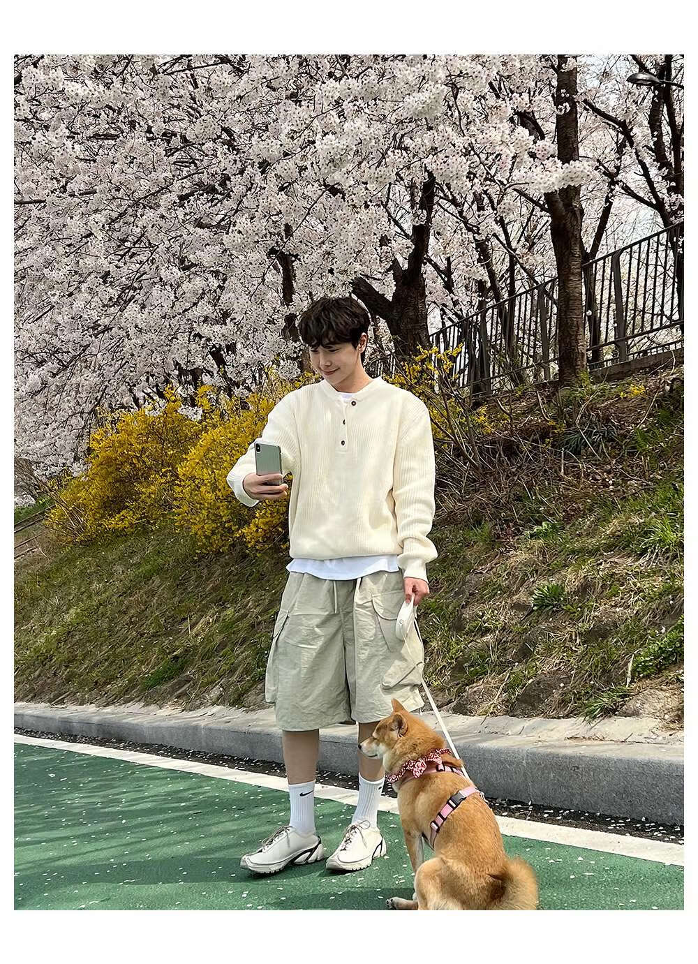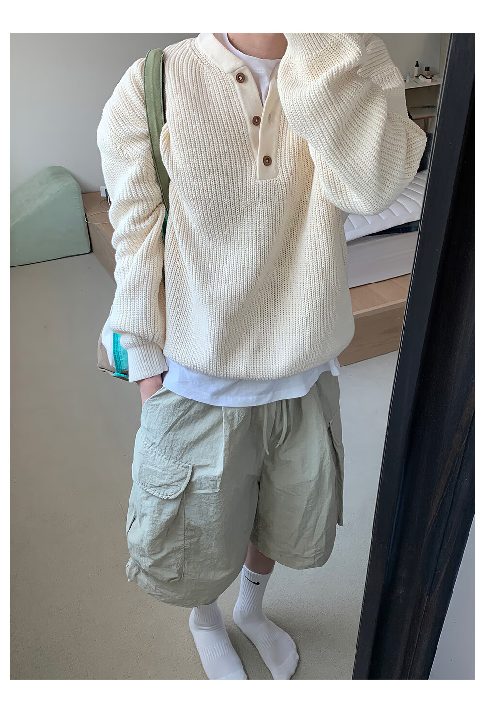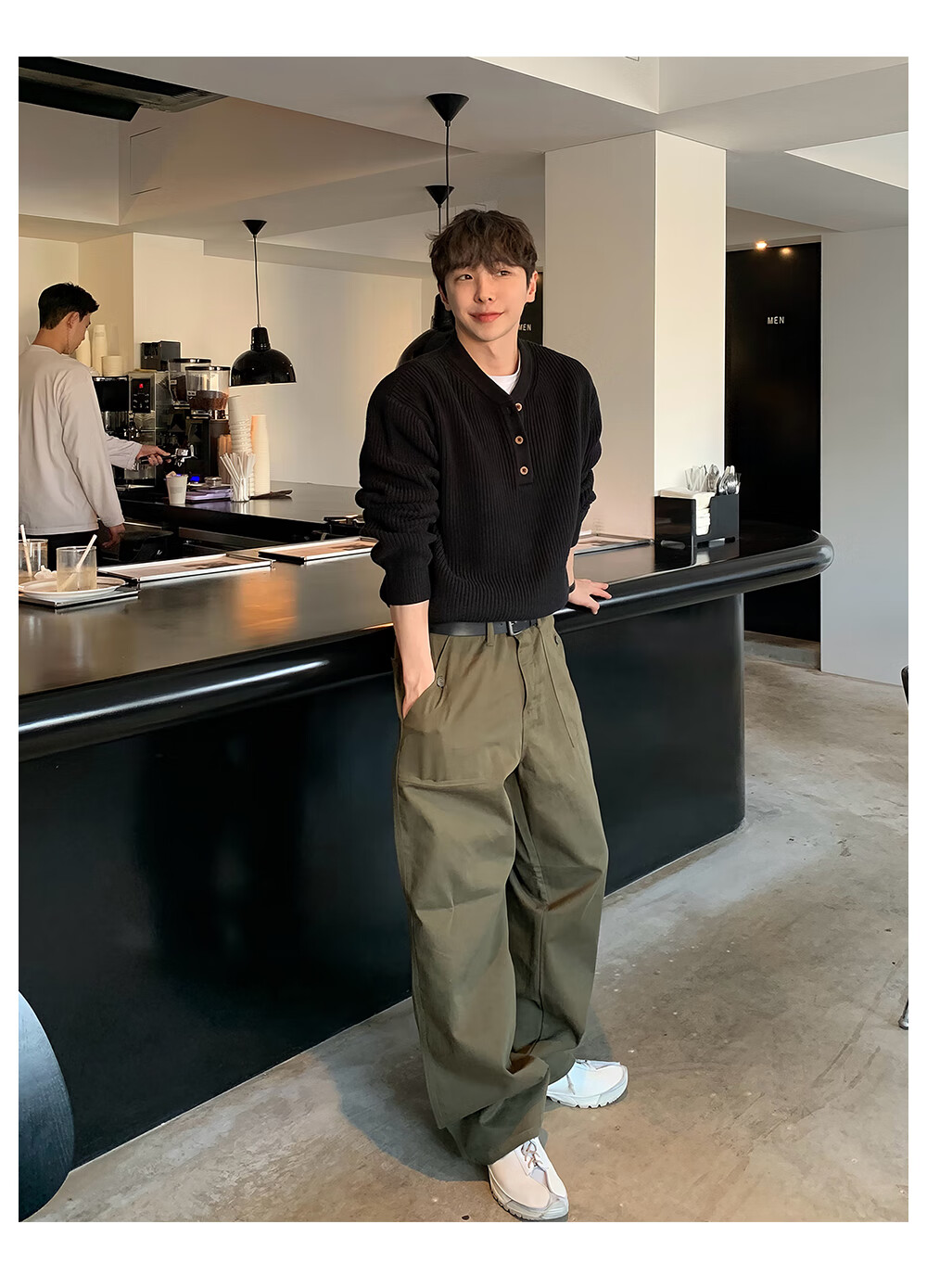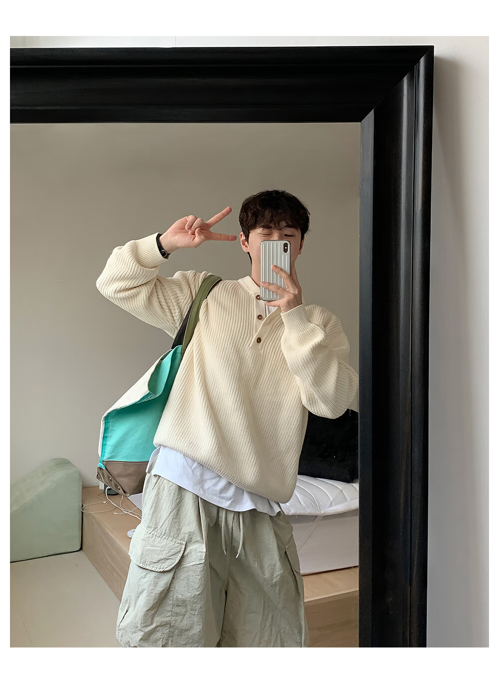 DAVID&ME American retro black Henry collar long-sleeved sweater men's lazy style thickened vertical striped pullover sweater top black M