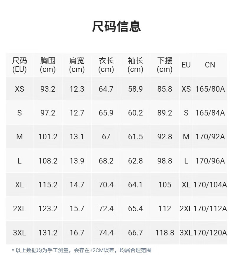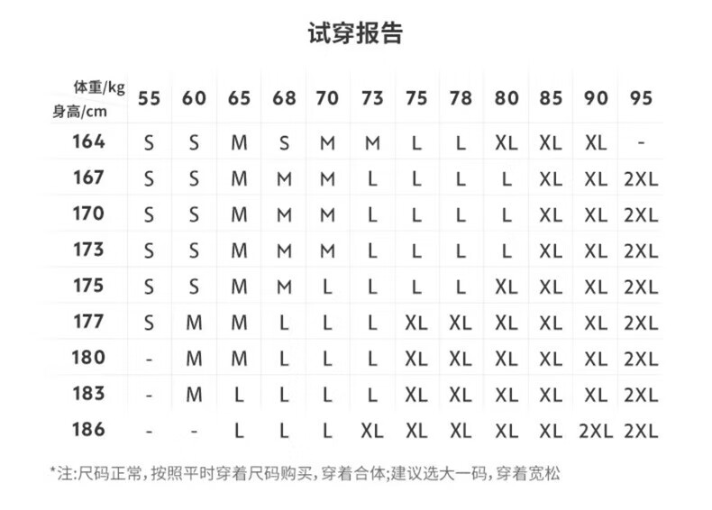 China (cm) 160-165/84-86 165-170 / 88-90 167-172 / 92-96 168-173 / 98-102 170-176 / 106-110