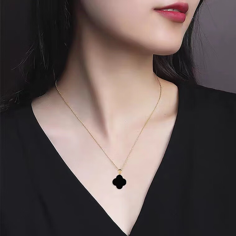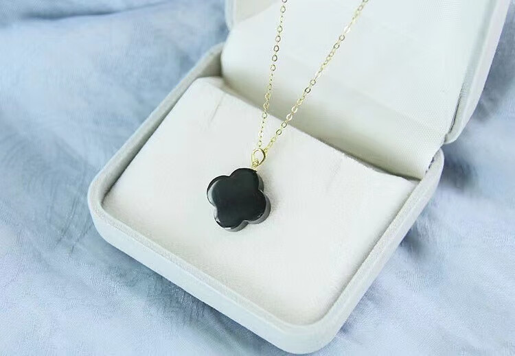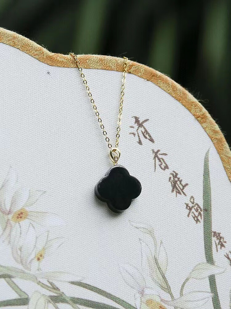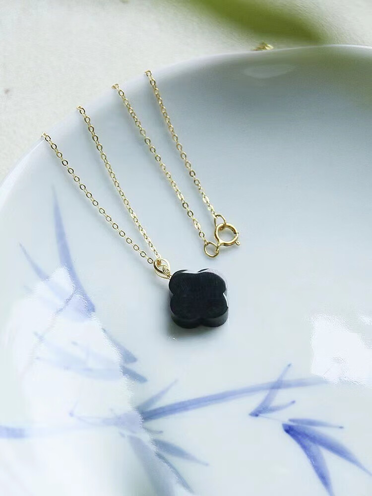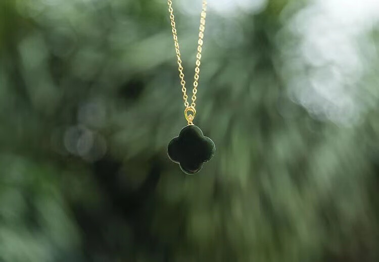 Pure green stone edge natural Hetian jade ink jade four-leaf clover necklace 18k gold pendant female original design jade clavicle chain