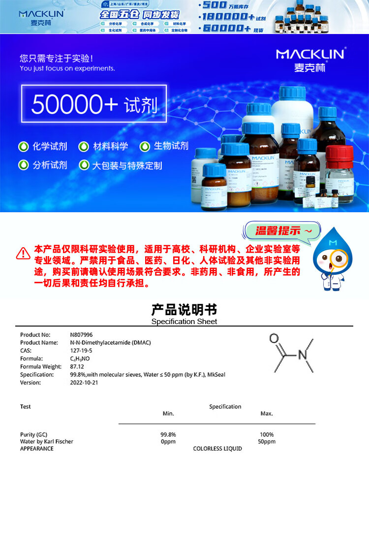Macklin |N|,|N|-Dimethylacetamide CAS 127-19-5 N807996-500ml