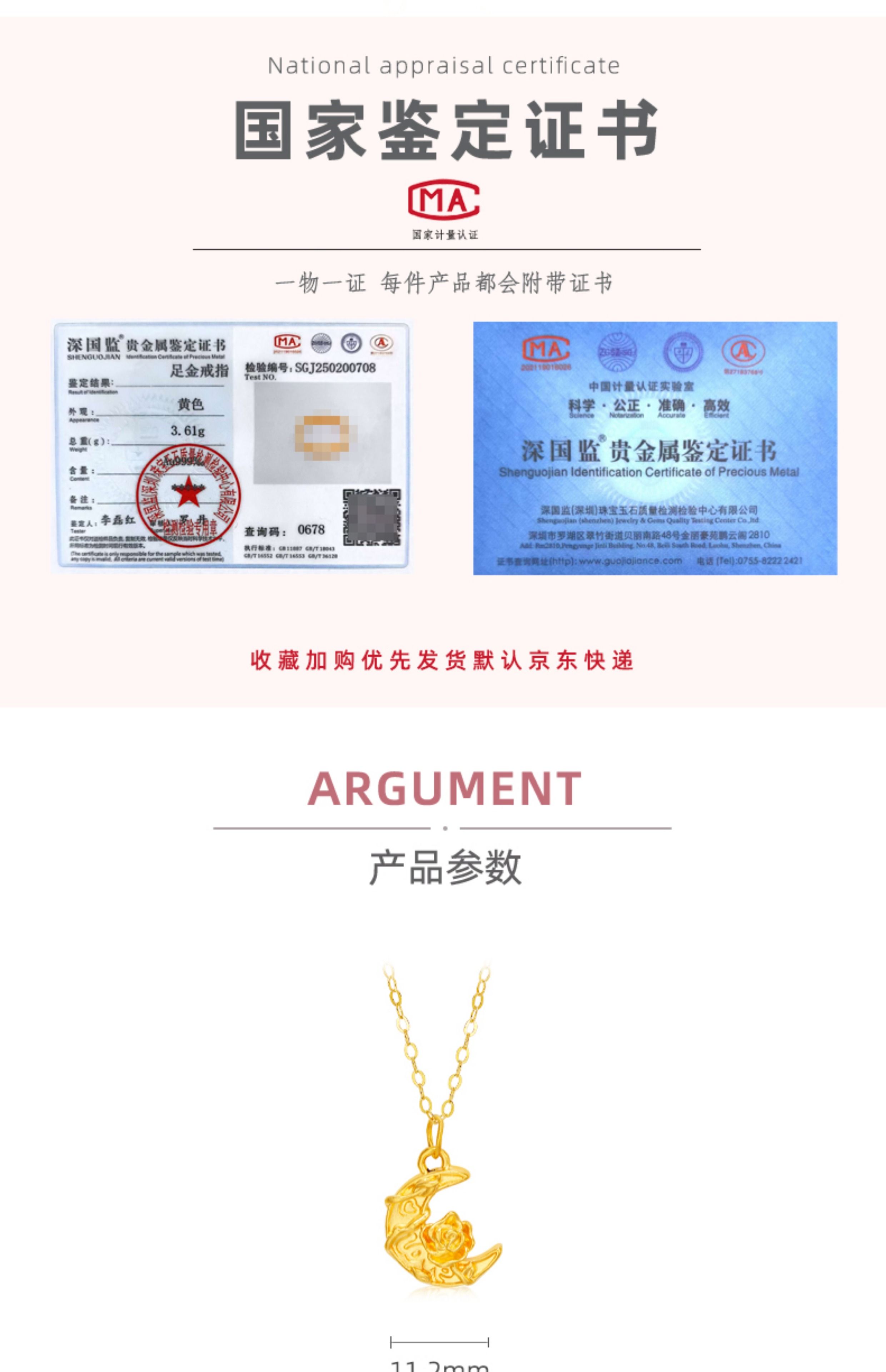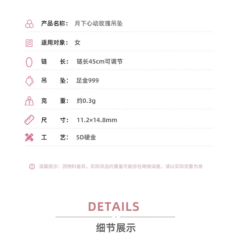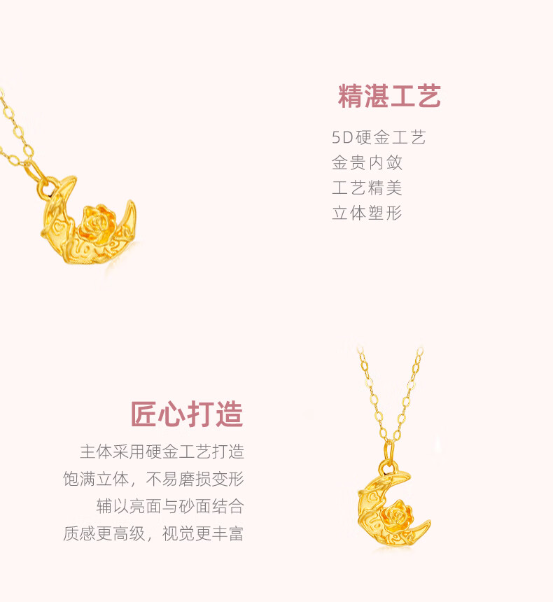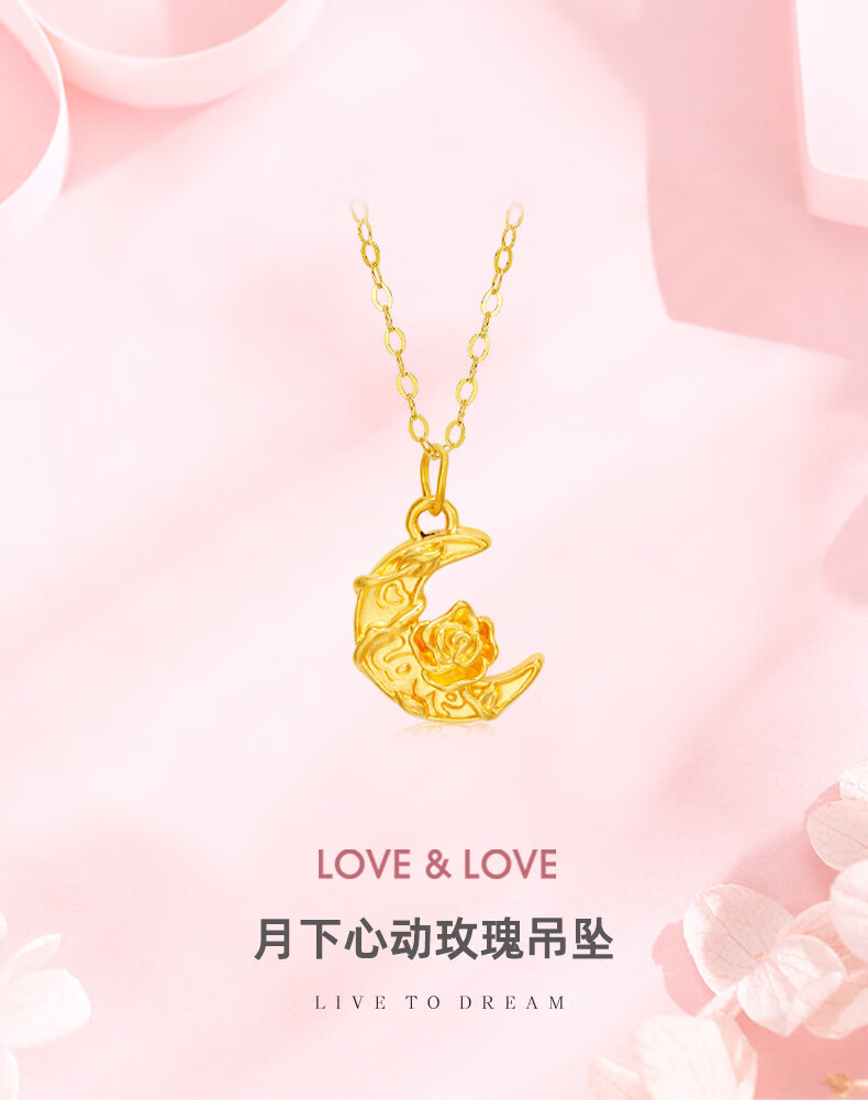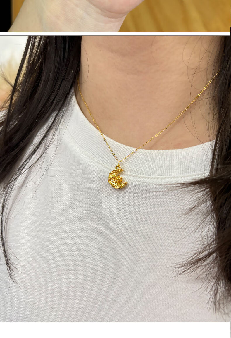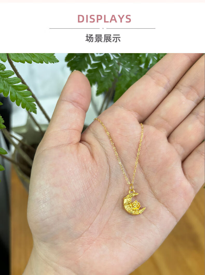 Yage Moon Rose Gold Pendant Women's New Pure Gold 999 Necklace Gift for Girlfriend, Gift for Friends, Heart-beating Rose Pendant under the Moon, About 0.3g - Free Silver Necklace 0.3g