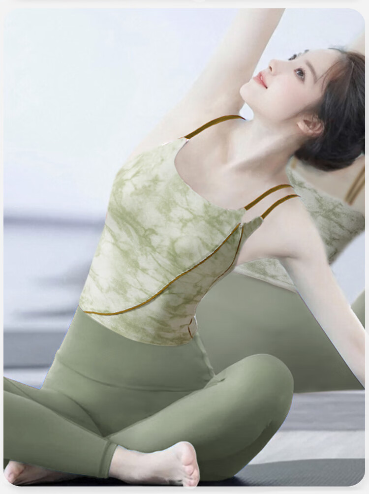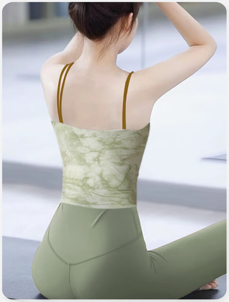 Shuangxiu Chinese style yoga vest for women 2025 new ink print with chest pad, beautiful Pilates sports fitness top, evergreen top for all seasons, avocado green suit M 100-110