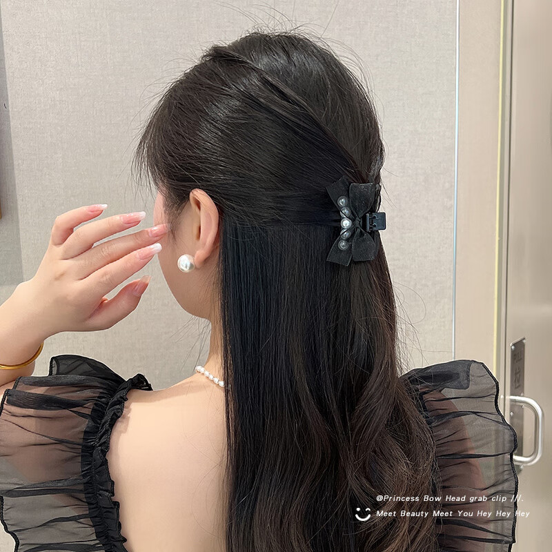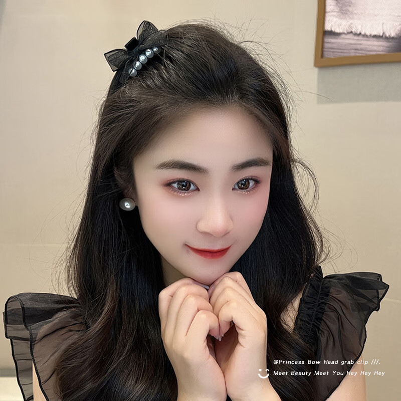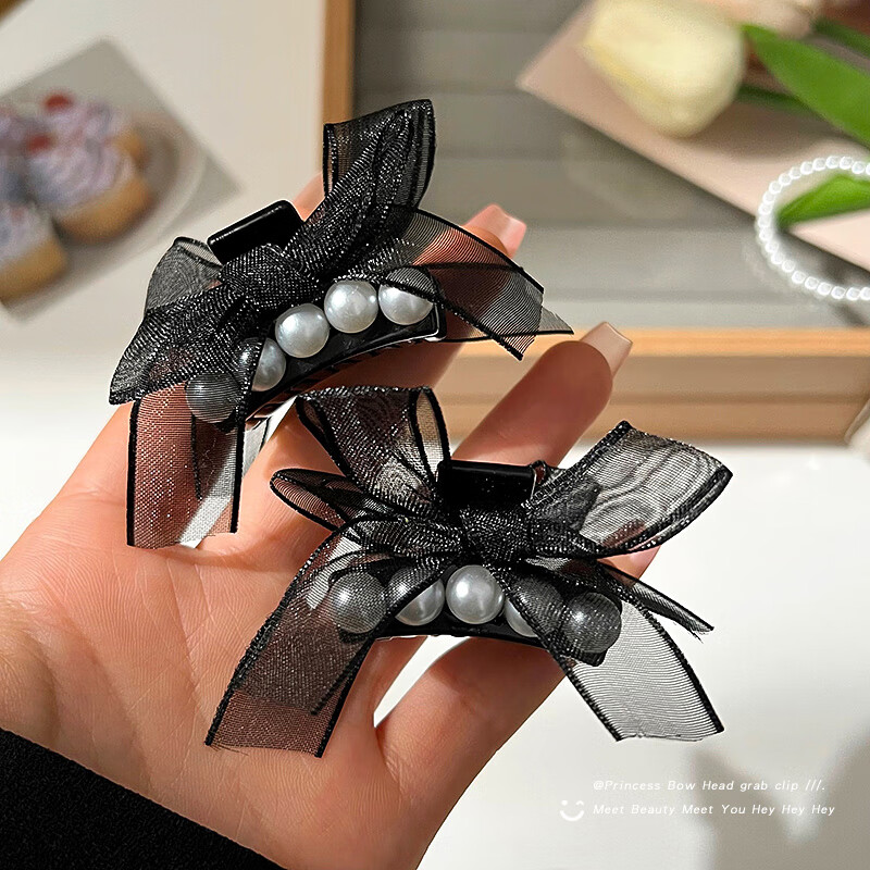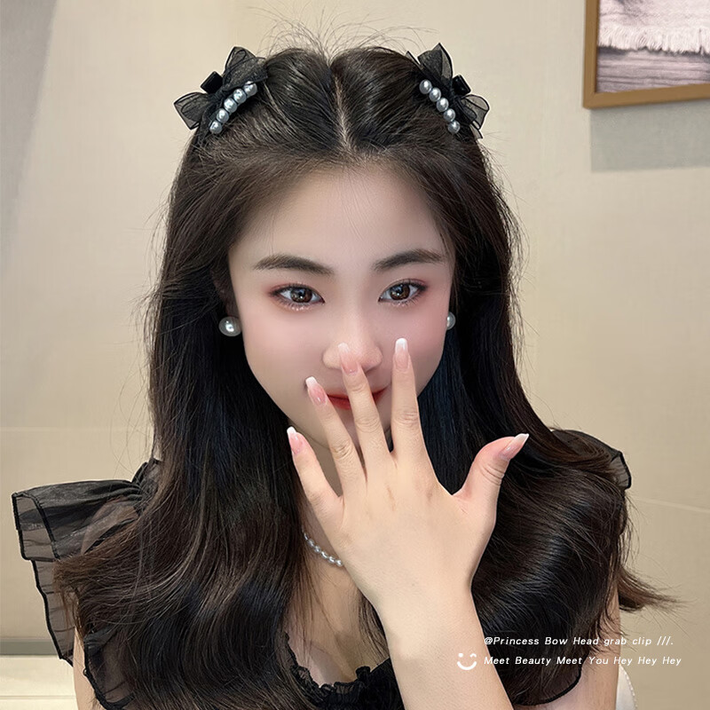 Black Pearl Small Clip Women's Forehead Bangs Side Clip 2025 New Small Clip Advanced Princess Hair Accessory Mesh Pearl Bow Clip 1 Pair