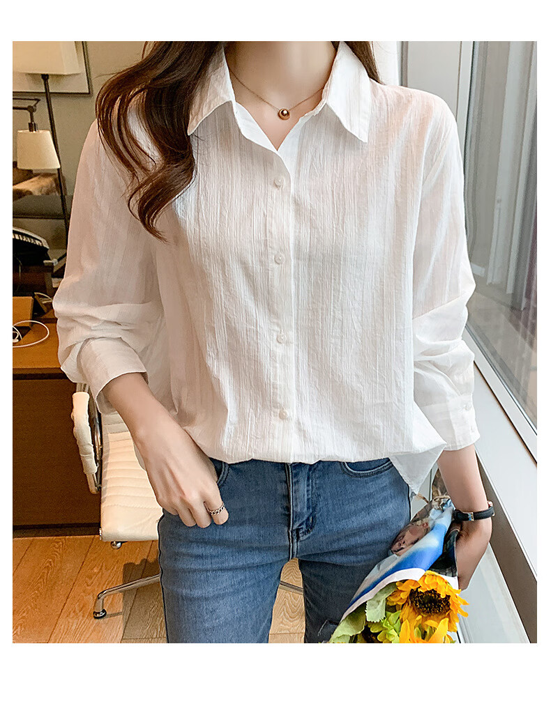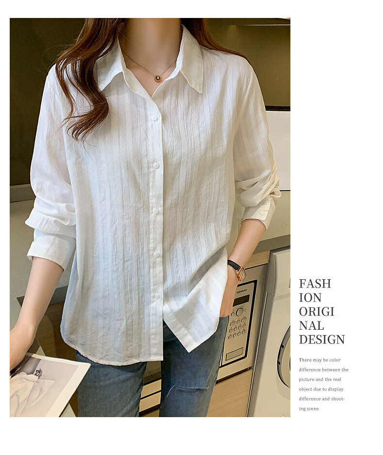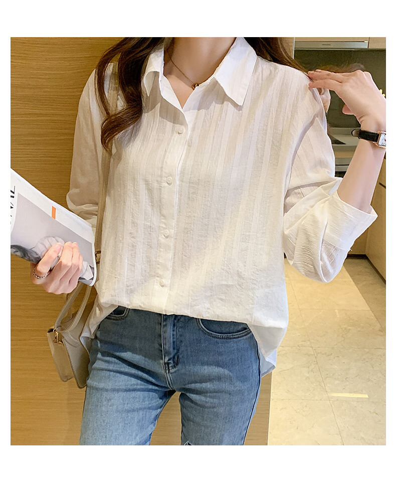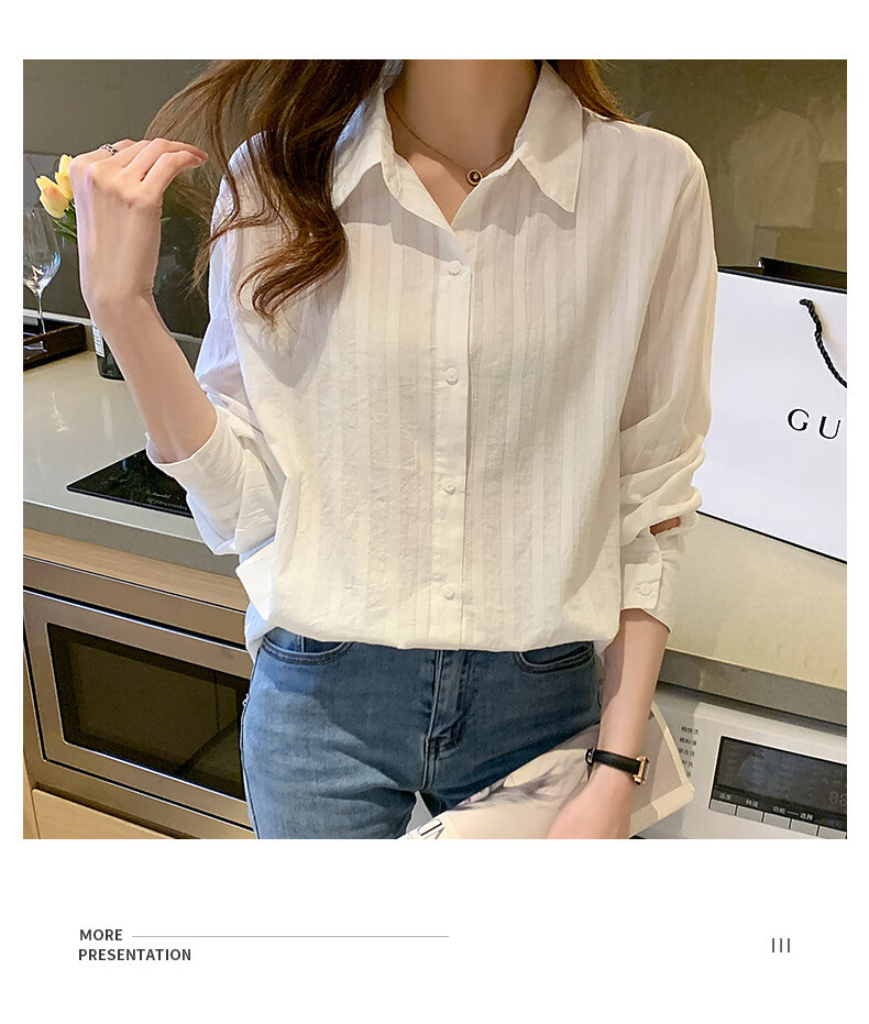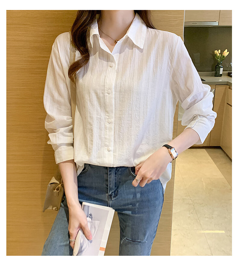 Miao Yijia Pure Cotton Striped White Shirt Women's French Shirt Shirt Women's Casual Shirt New Style Western Style Bottoming Shirt Striped French Long Sleeve Shirt White L 115-130Jin Jin equals 0.5 kg