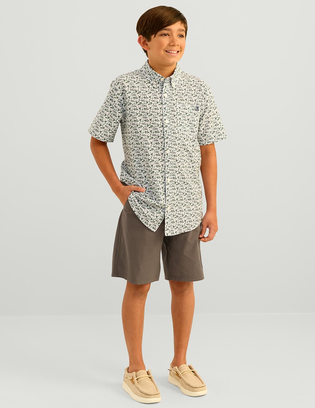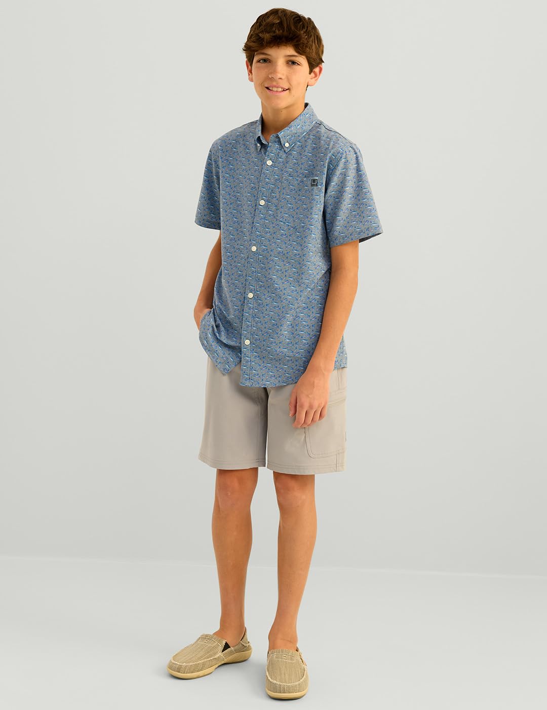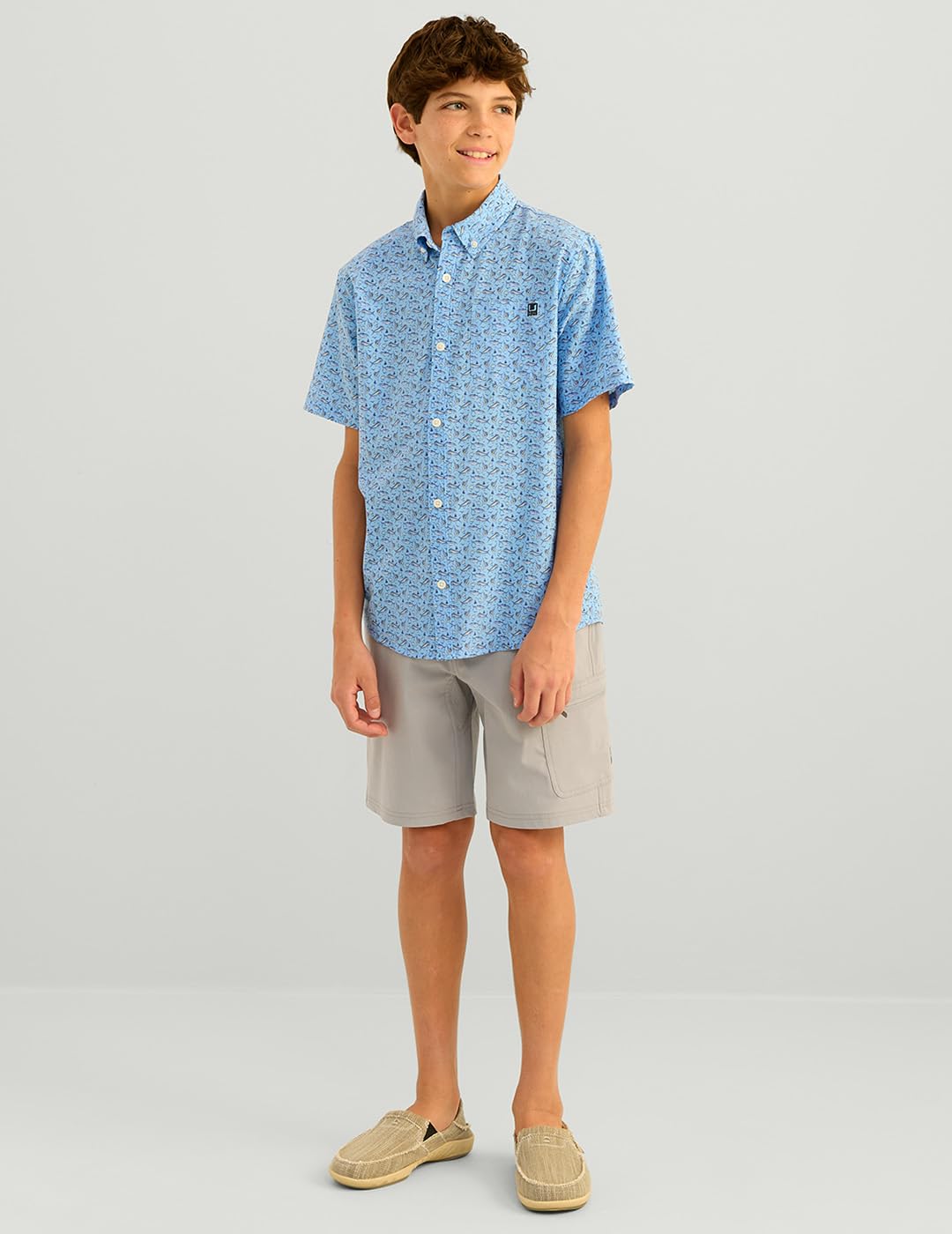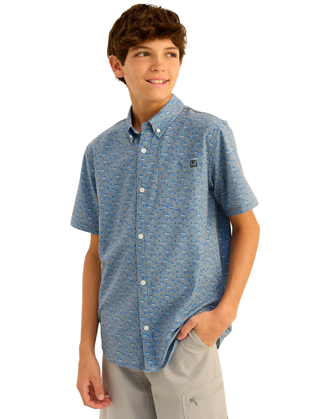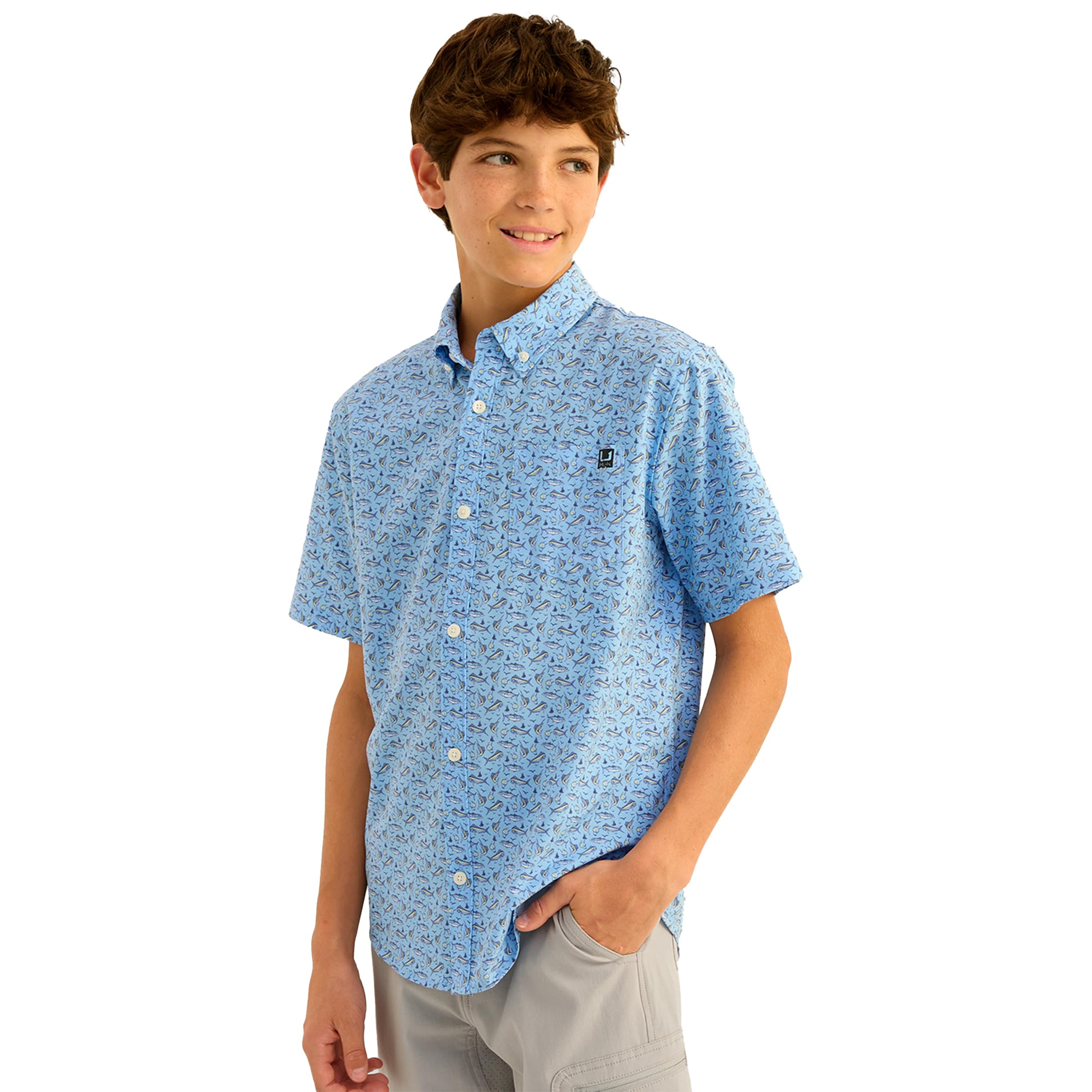 HUK unisex children's Kona pattern short-sleeved fishing button-down shirt white XS