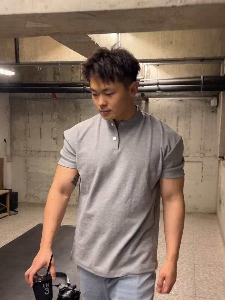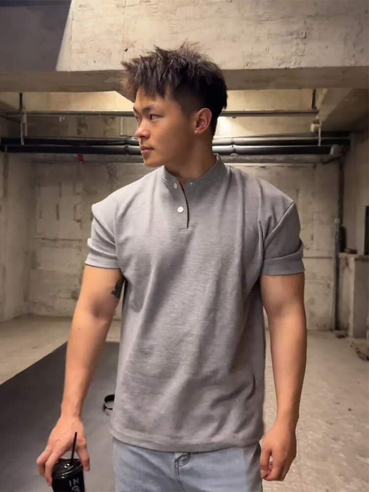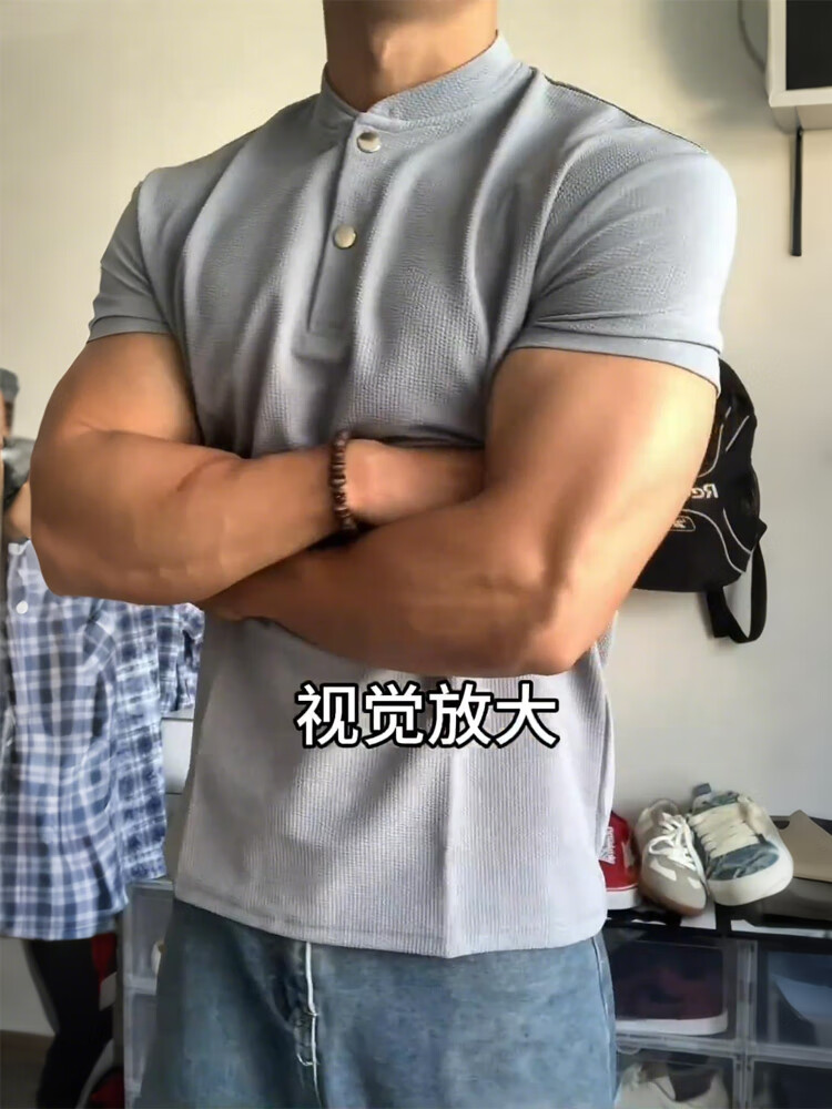 Katuchi light gray Henry collar short-sleeved men's waffle T-shirt bottoming shirt showing muscle fitness American retro polo shirt black 2XL