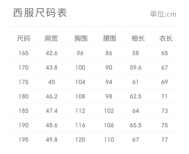 China (cm) 160-165/84-86 165-170 / 88-90 167-172 / 92-96 168-173 / 98-102 170-176 / 106-110