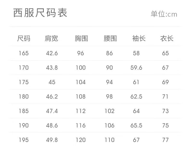 China (cm) 160-165/84-86 165-170 / 88-90 167-172 / 92-96 168-173 / 98-102 170-176 / 106-110