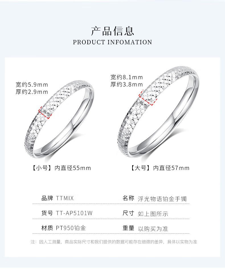TTMIX women's pt950 platinum bracelet, fashionable and shiny platinum bracelet, elegant and round bracelet, 56mm, weight 29.57g, width 8.0mm