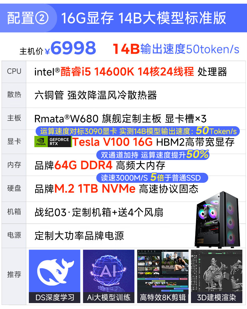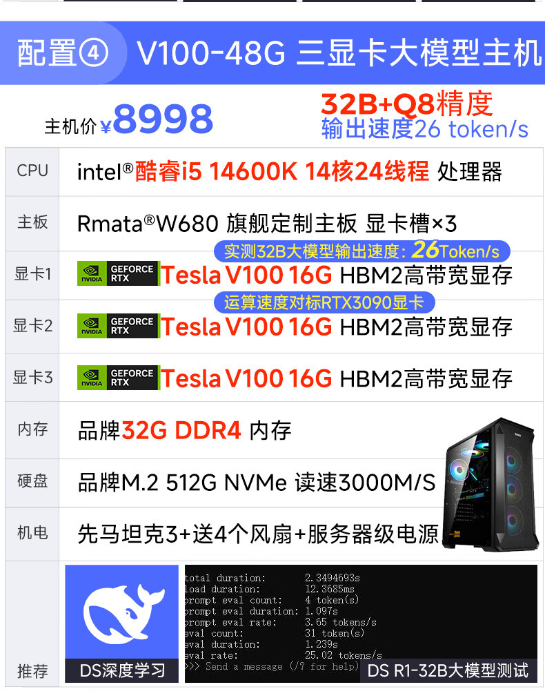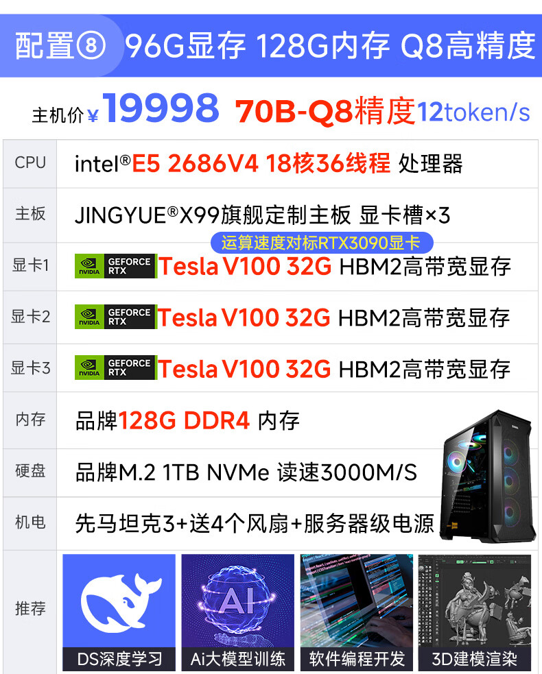 Xunzhong deepseek deep learning 70B desktop computer host 32B large model Ai training deployment server workstation simulation 3D modeling high-end machine assembly machine 8,96G video memory丨70B+Q8 precision supreme version