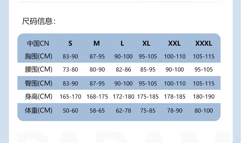 China (cm) 160-165/84-86 165-170 / 88-90 167-172 / 92-96 168-173 / 98-102 170-176 / 106-110