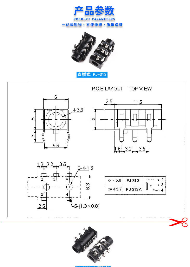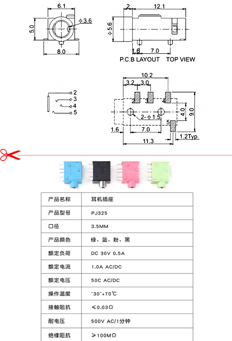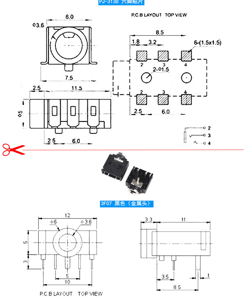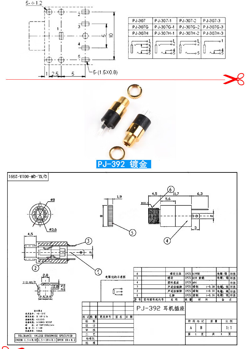 Headphone socket 3.5MM audio plug 3F07 socket PJ-313D392/301/359/325C/215 female socket 3.5 four pole 6.0 plate gold plated (10 pieces)