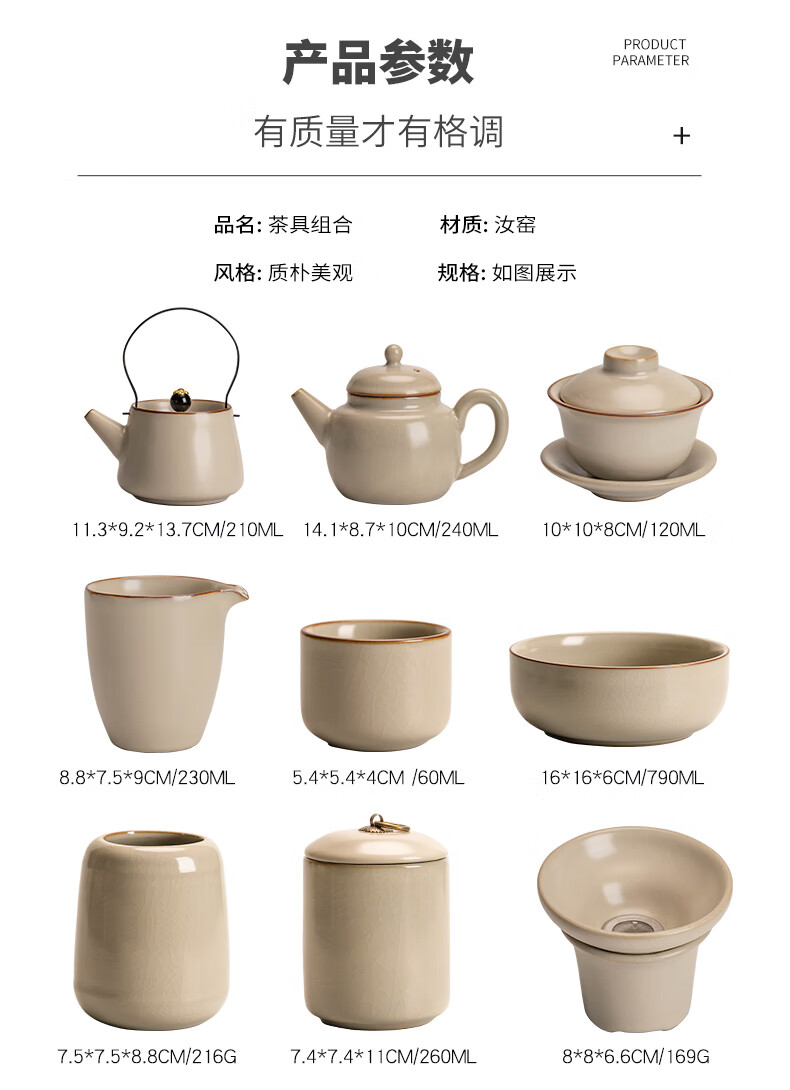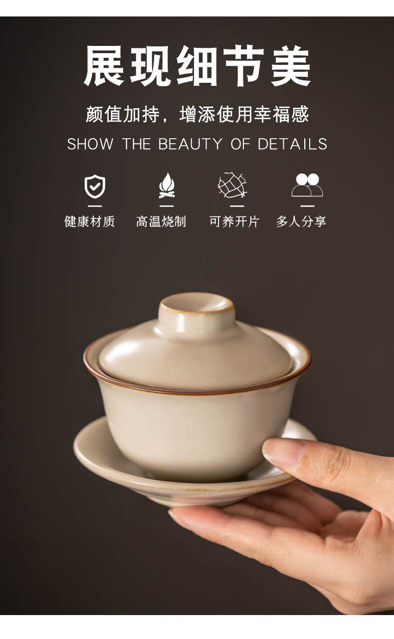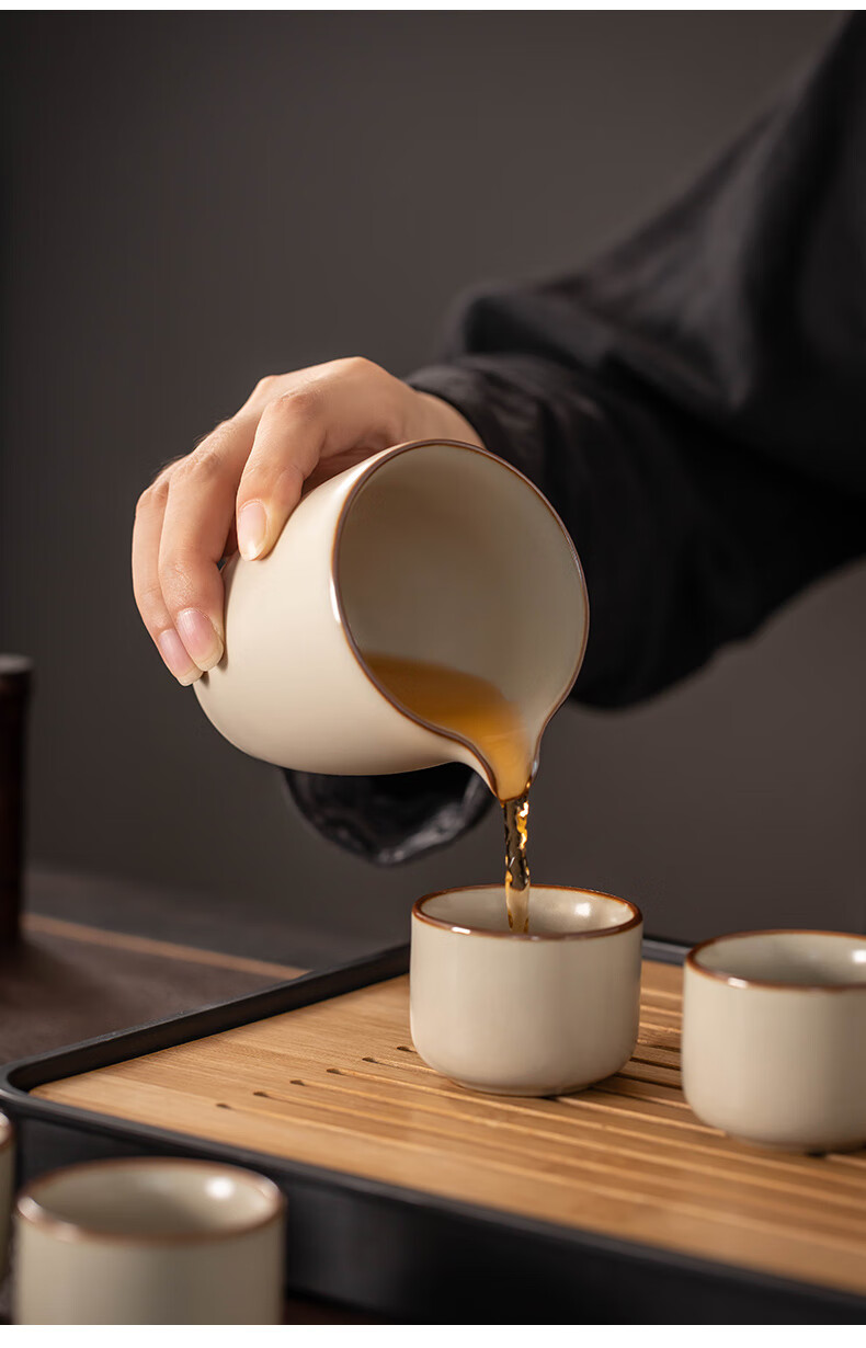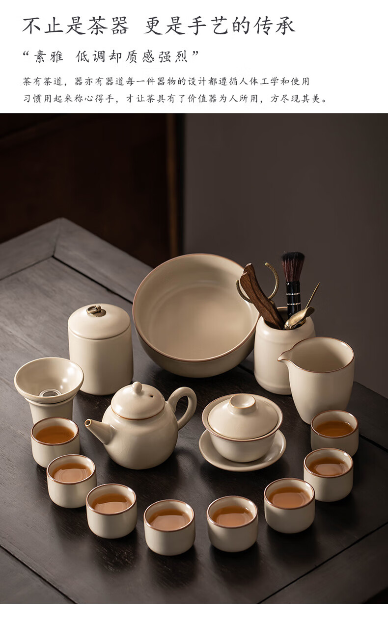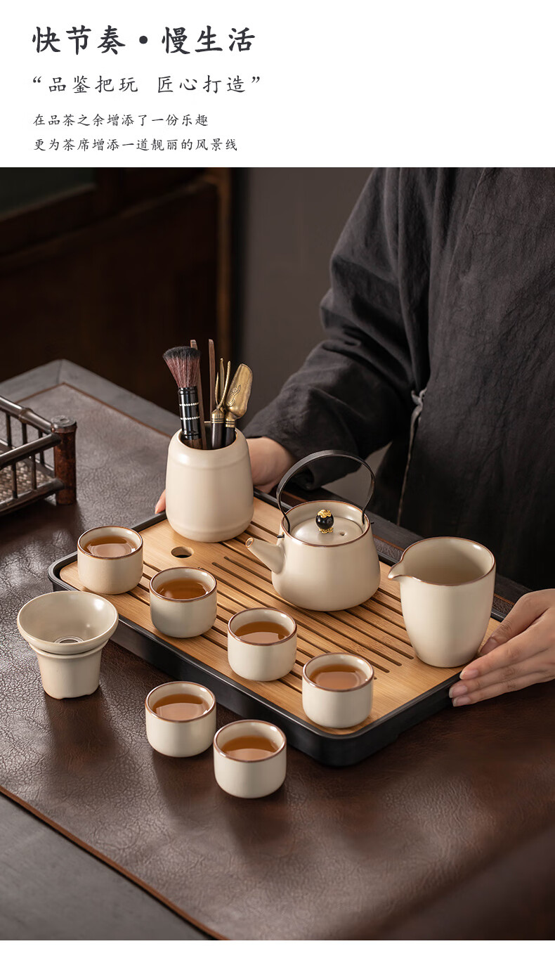 ROWILUX tea set complete set of high-end beige Ru kiln Kung Fu tea set household ceramic teapot lid bowl tea cup light luxury Chinese style + tea tray 16 pieces