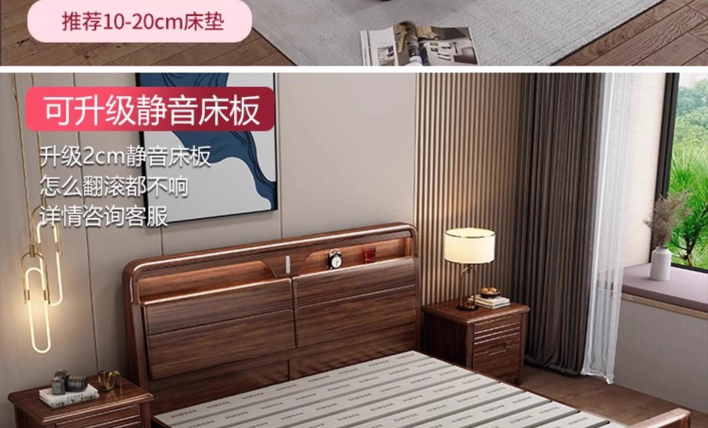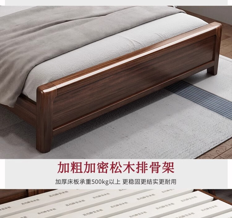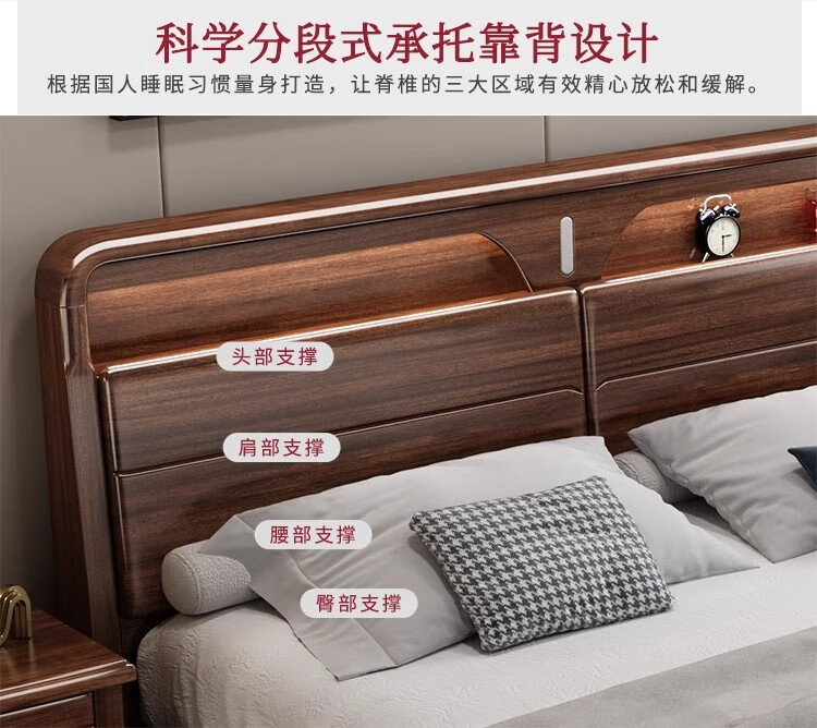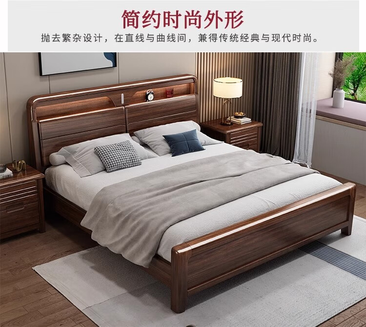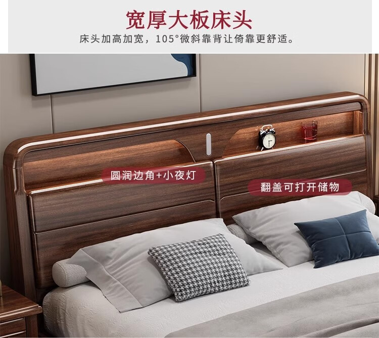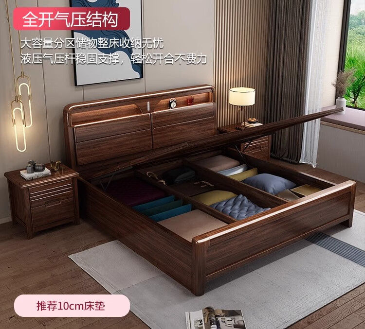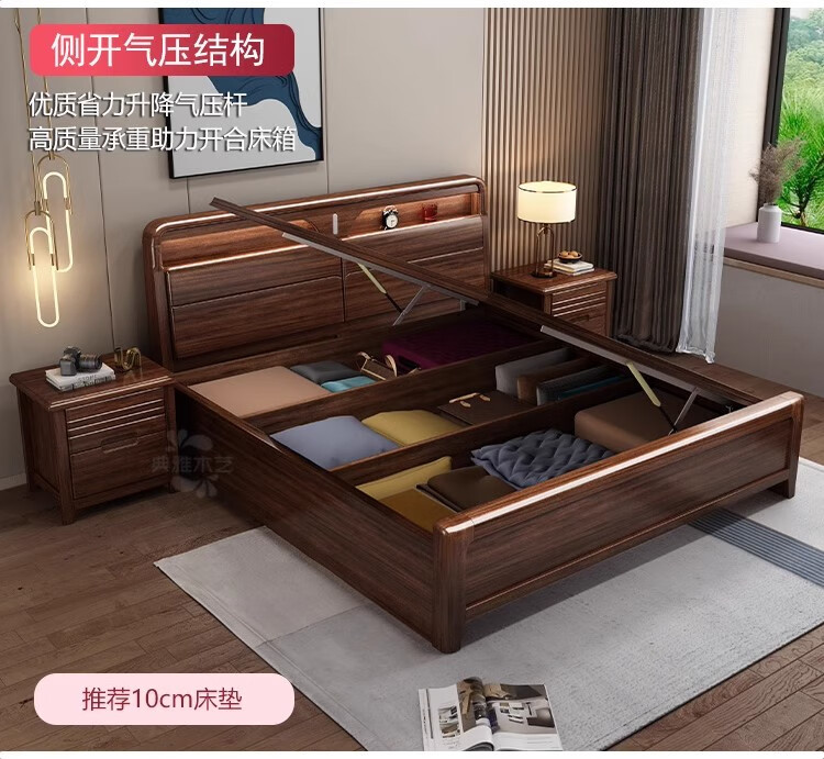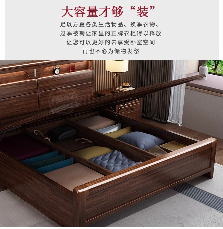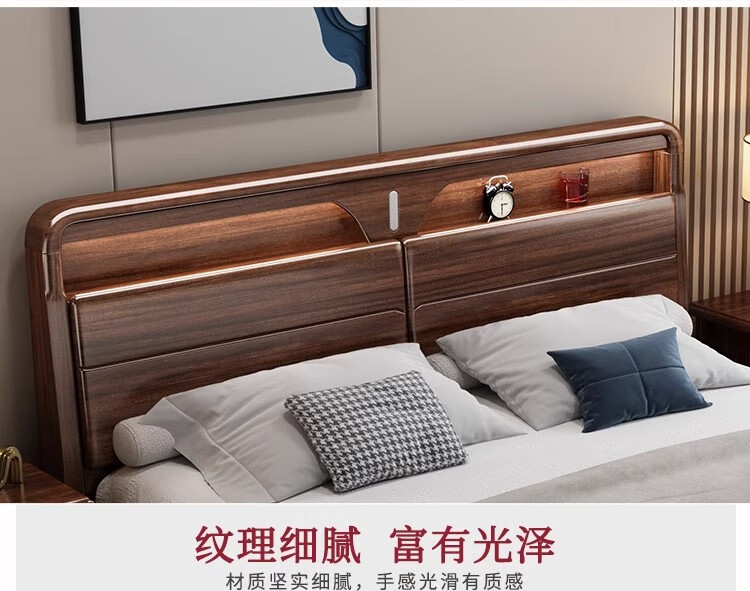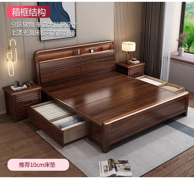 Zixi walnut solid wood bed 1.8 meters factory high box bedside storage with lights master bedroom thickened 2 meters double bed walnut single bed with night light/bull socket 1800*2000mm air pressure double extraction structure/full bed bed board