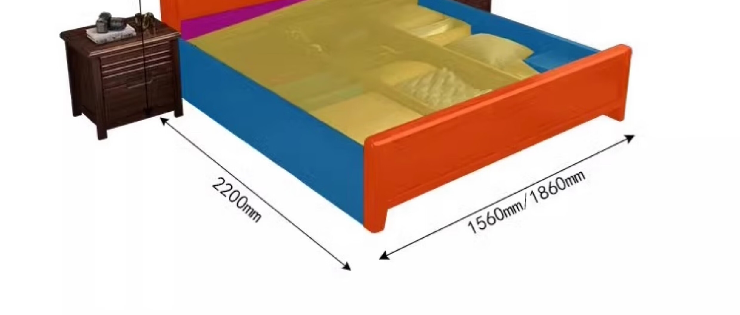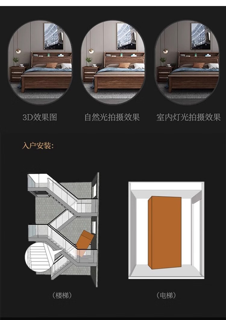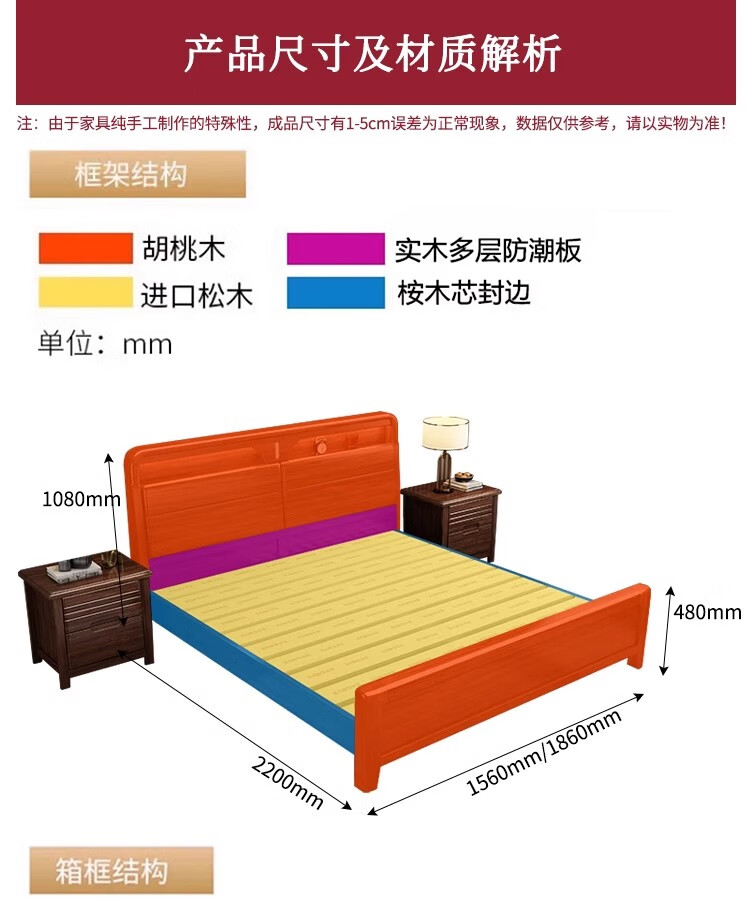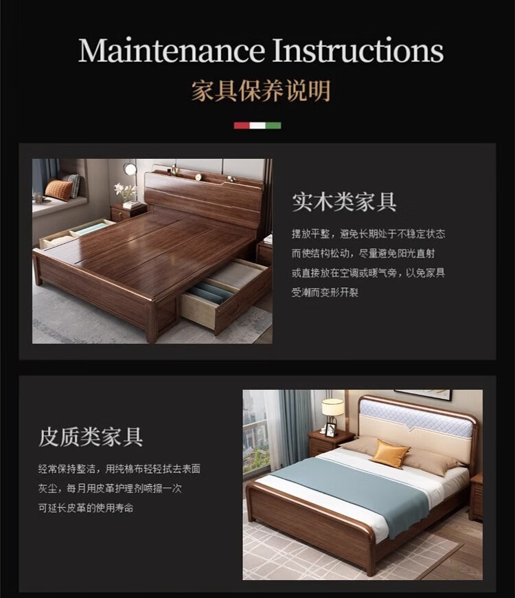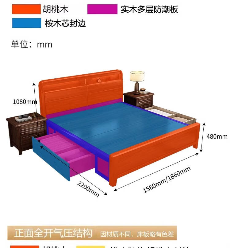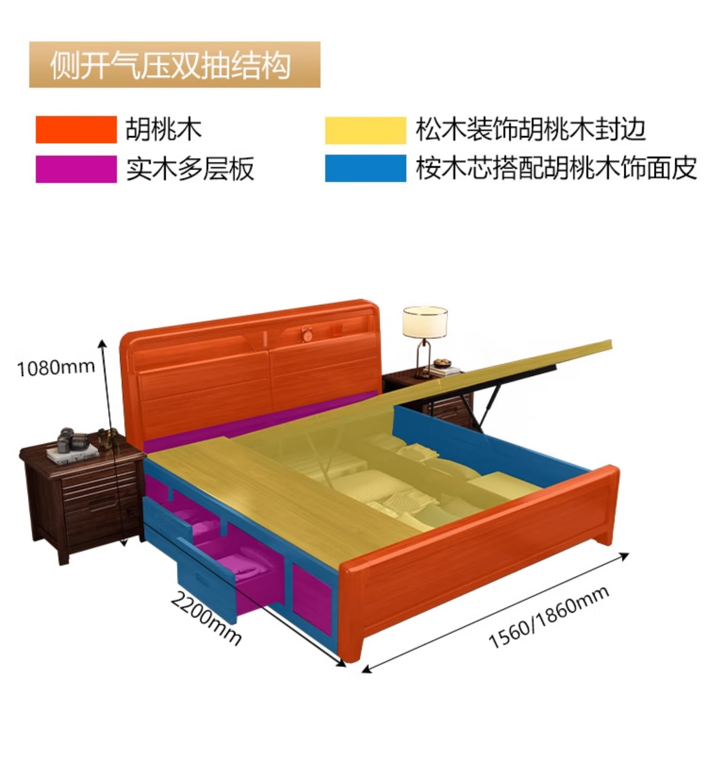 Zixi walnut solid wood bed 1.8 meters factory high box bedside storage with lights master bedroom thickened 2 meters double bed walnut single bed with night light/bull socket 1800*2000mm air pressure double extraction structure/full bed bed board
