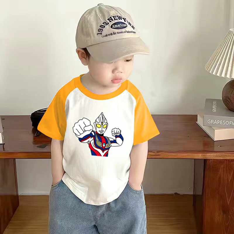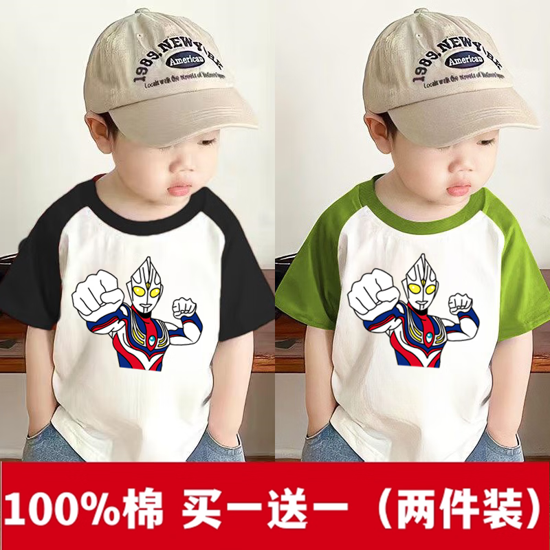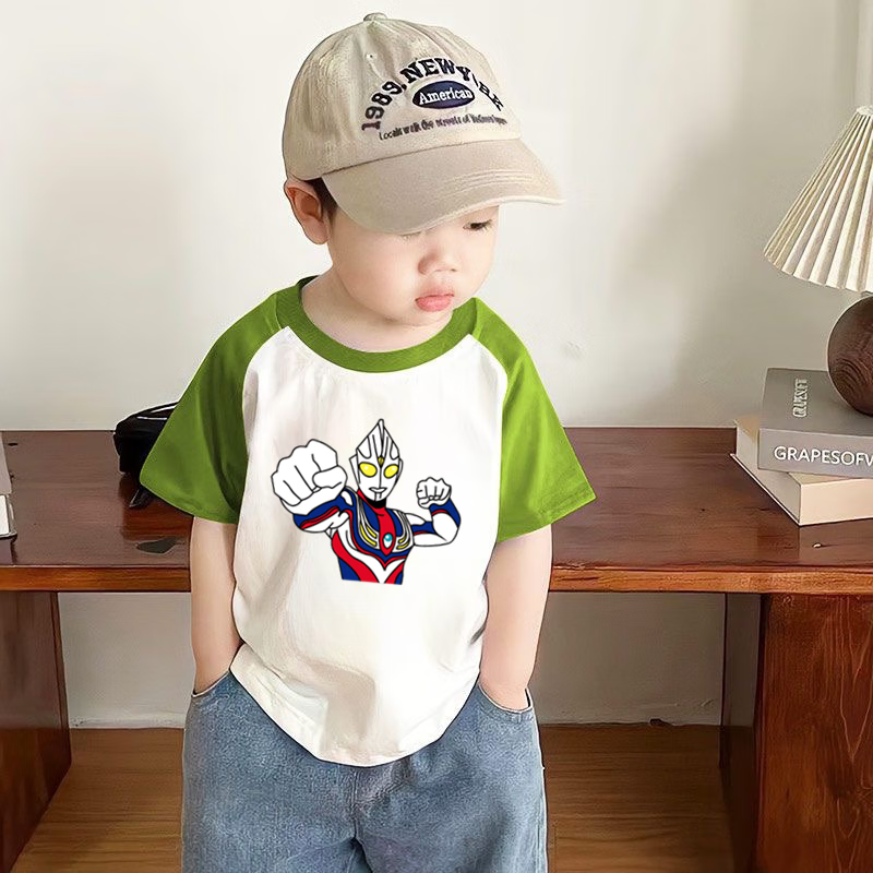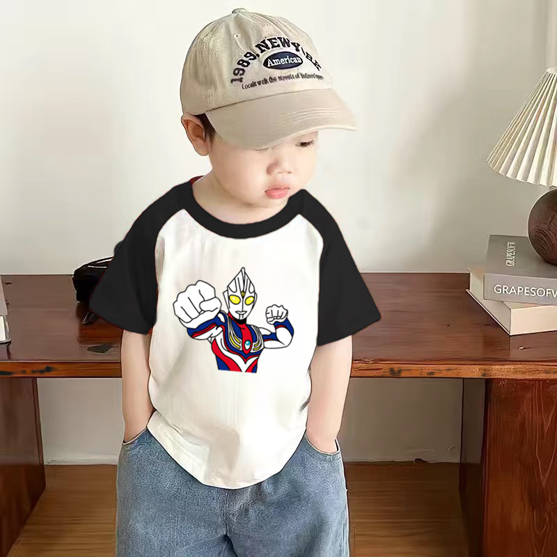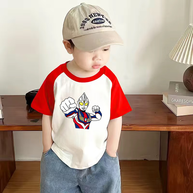 2025 new summer boys pure cotton versatile style Ultraman cartoon printed cotton short-sleeved top T-shirt red + blue 110 cm