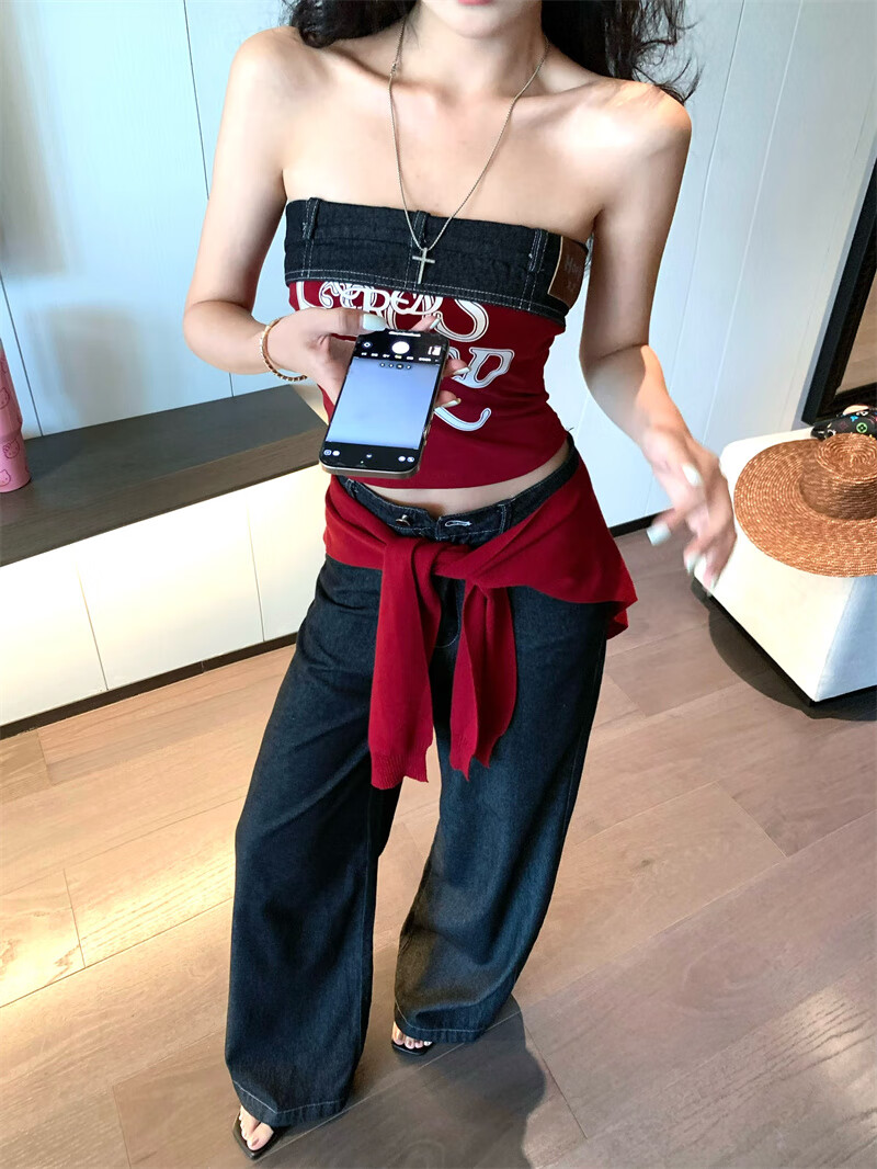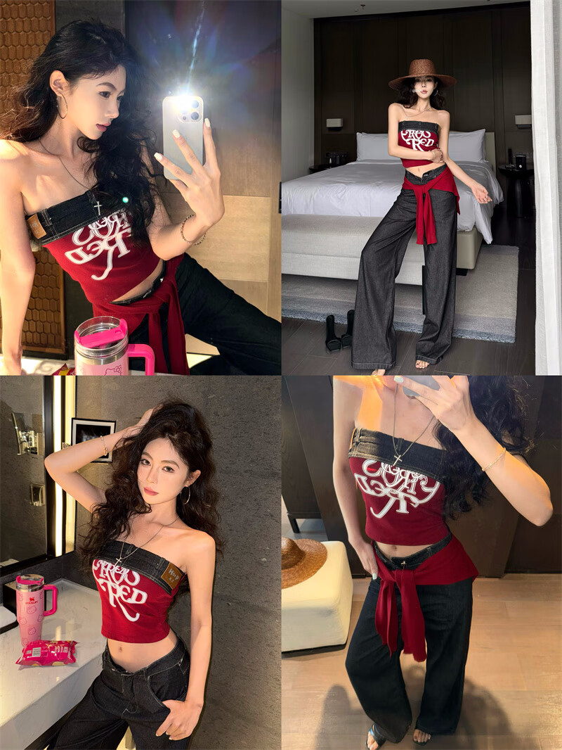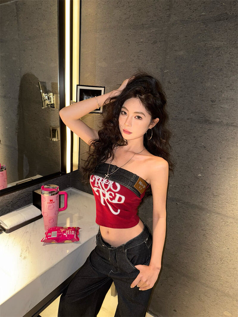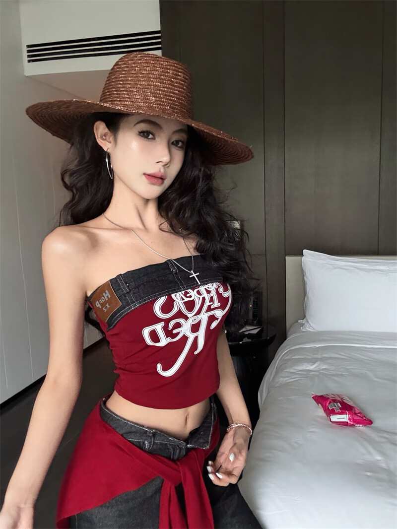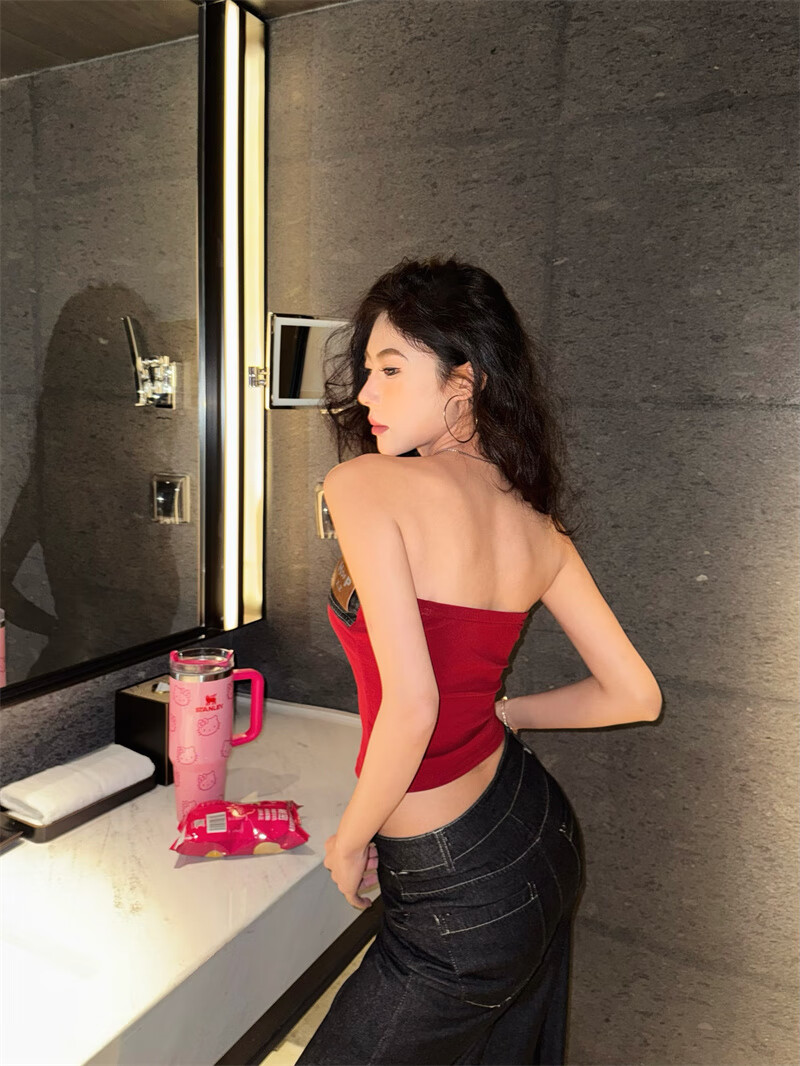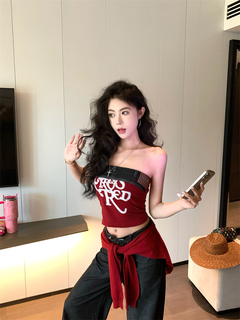 Chuangjingyi chooses red denim tube top summer hot girl one-shoulder Thai unique design vest red shawl S
