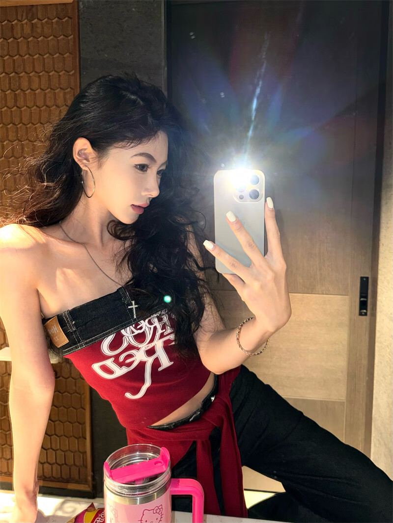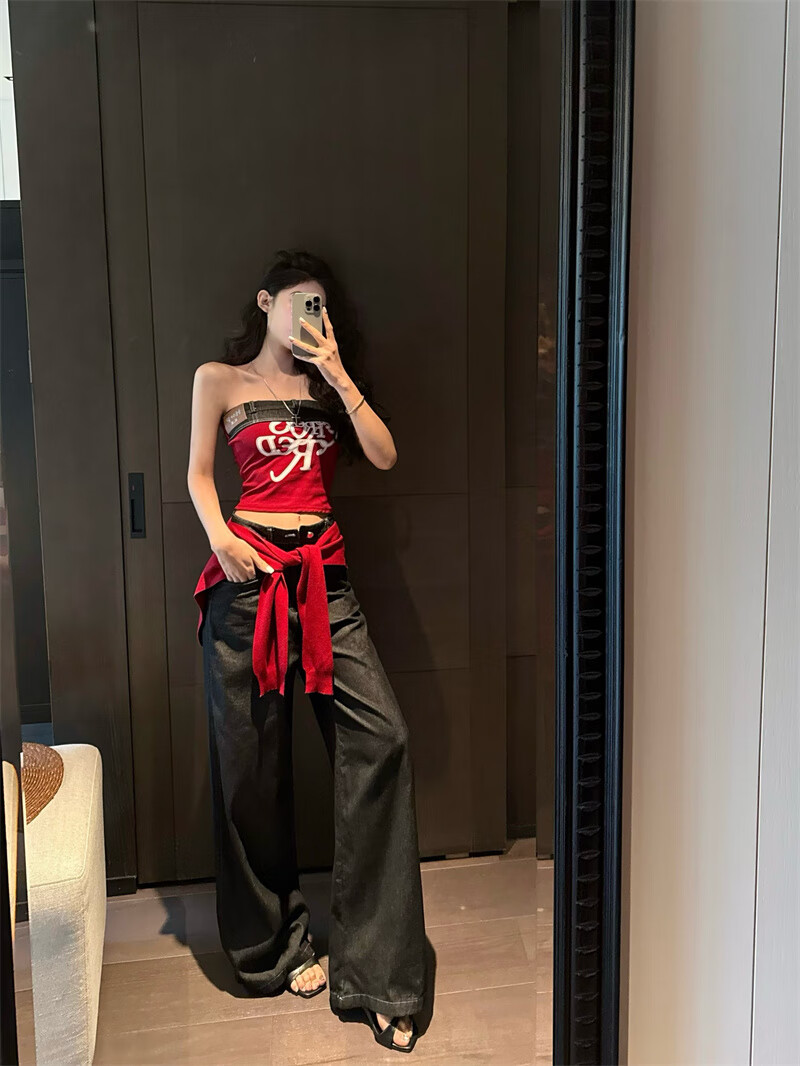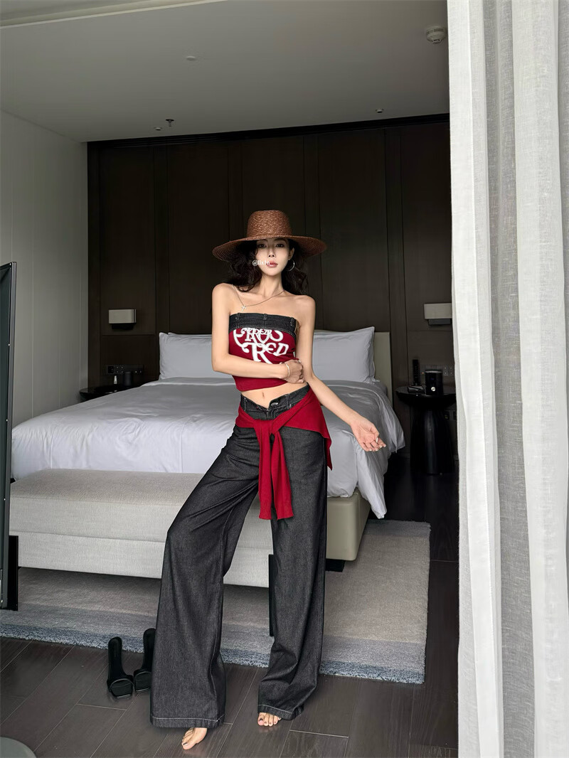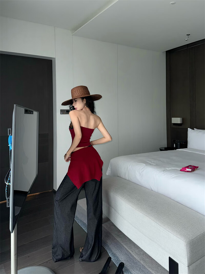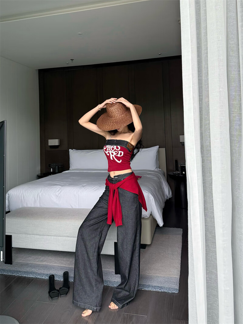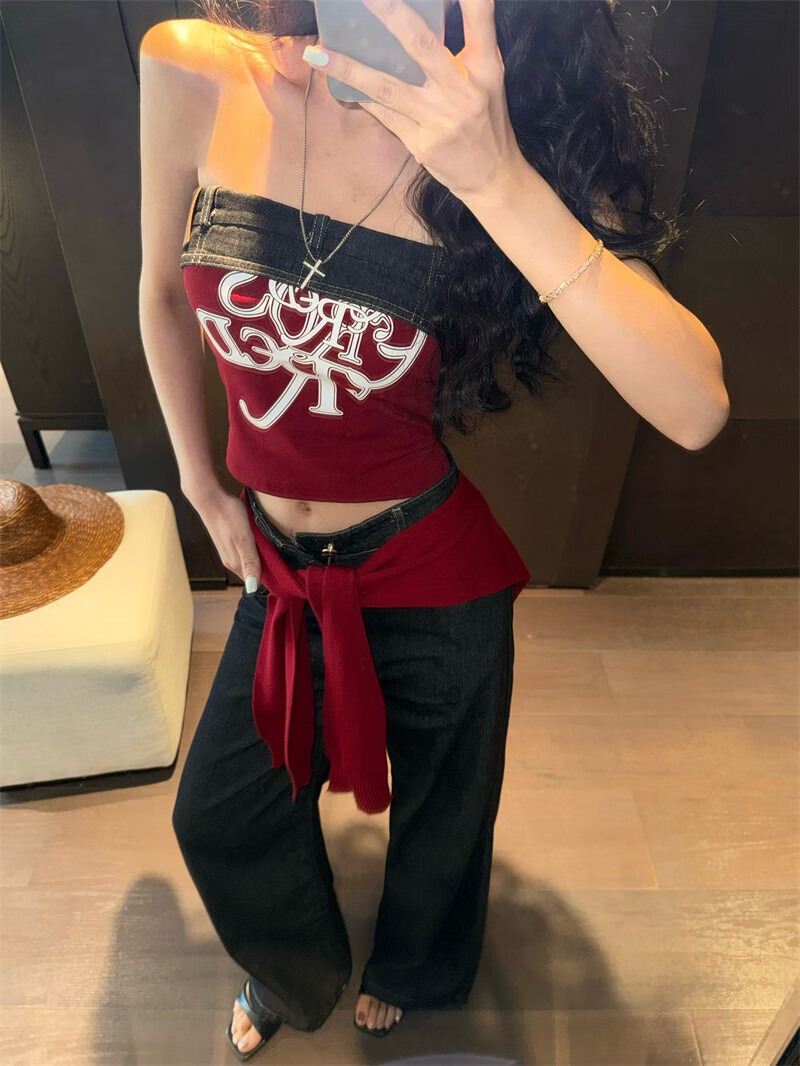 Chuangjingyi chooses red denim tube top summer hot girl one-shoulder Thai unique design vest red shawl S